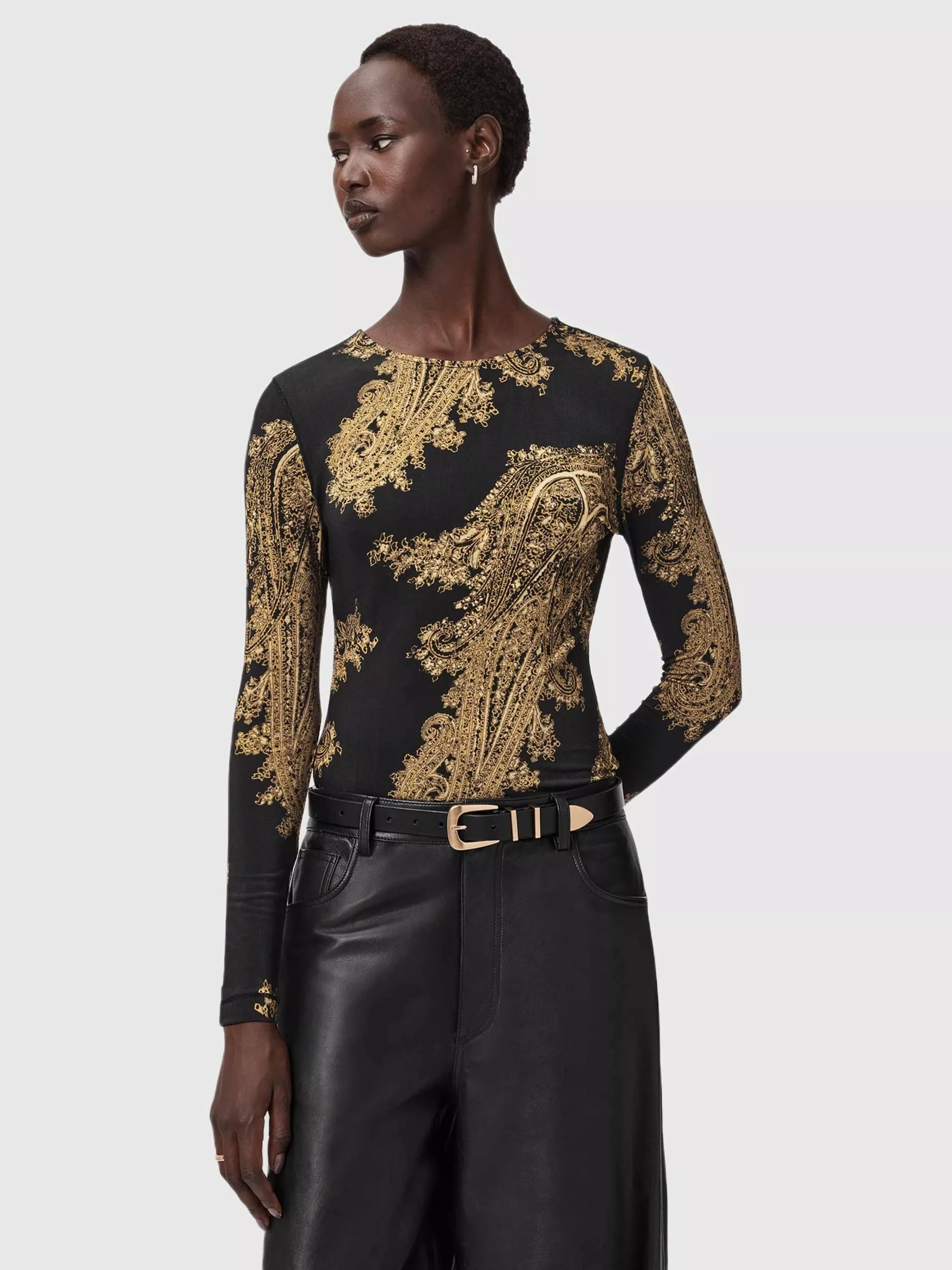 An essential jersey top by AllSaints, made from a soft viscose blend. With a crew neck and long sleeves, it's printed with an intricate paisley pattern. The ultimate party-ready piece.
