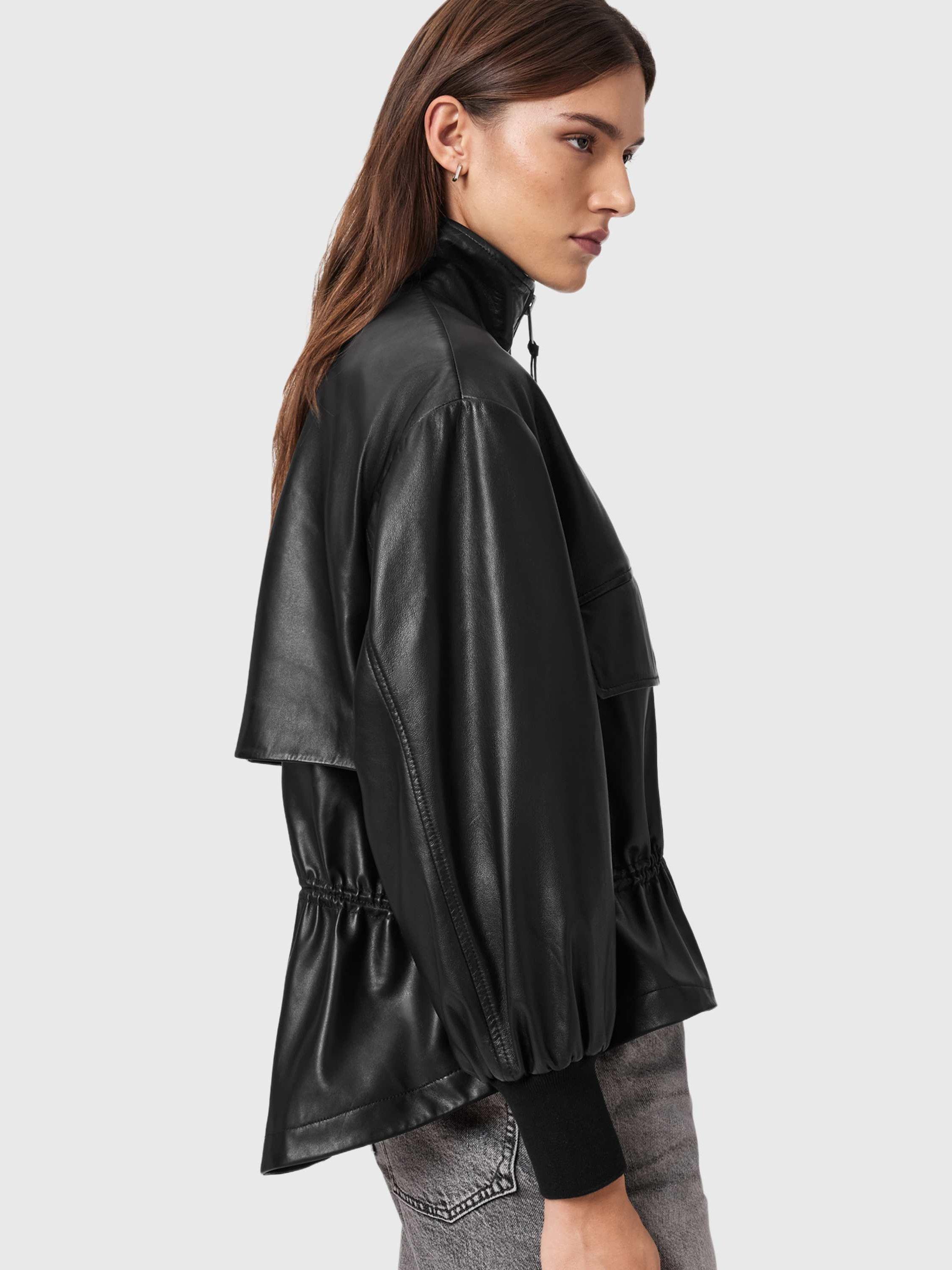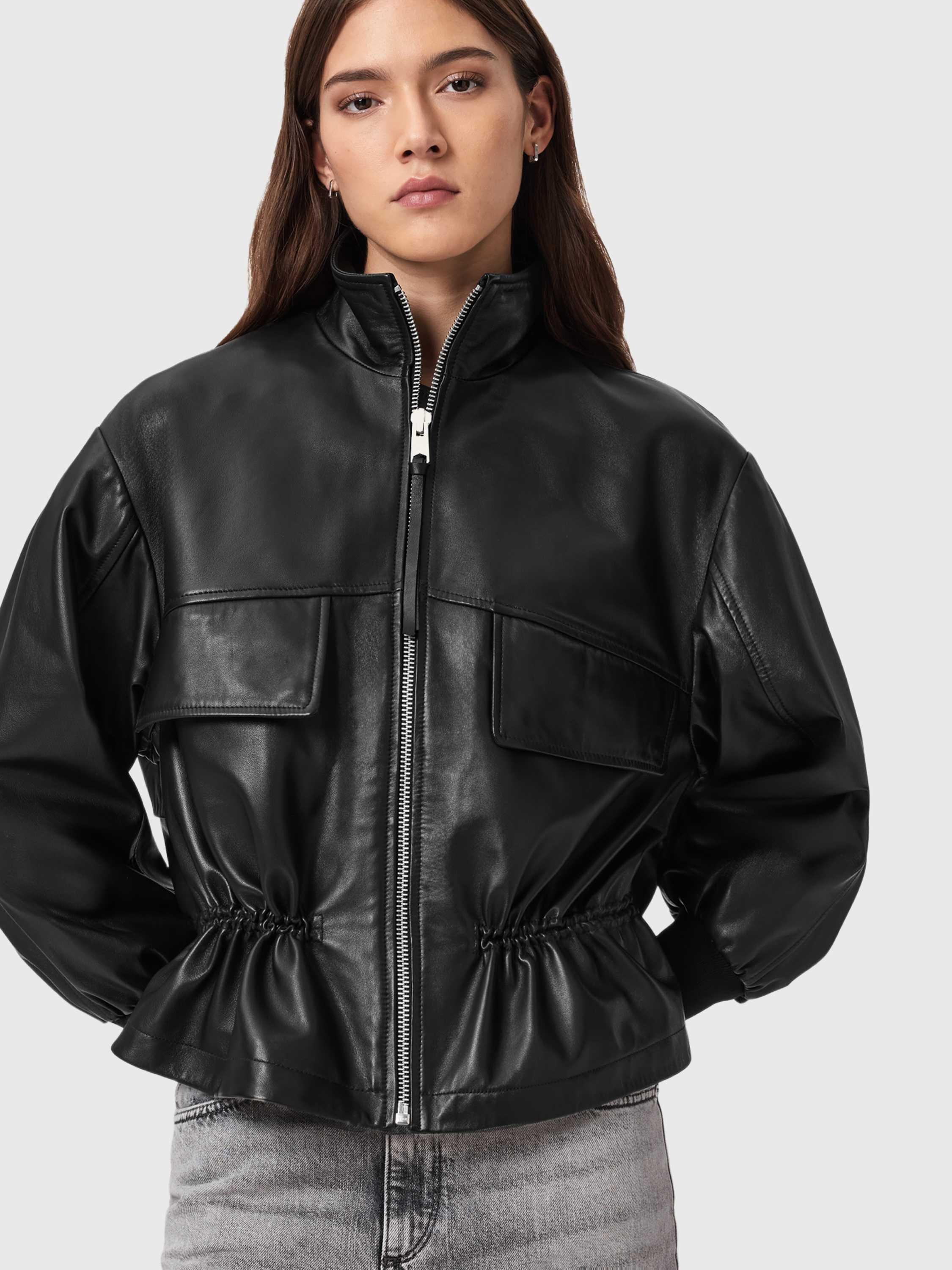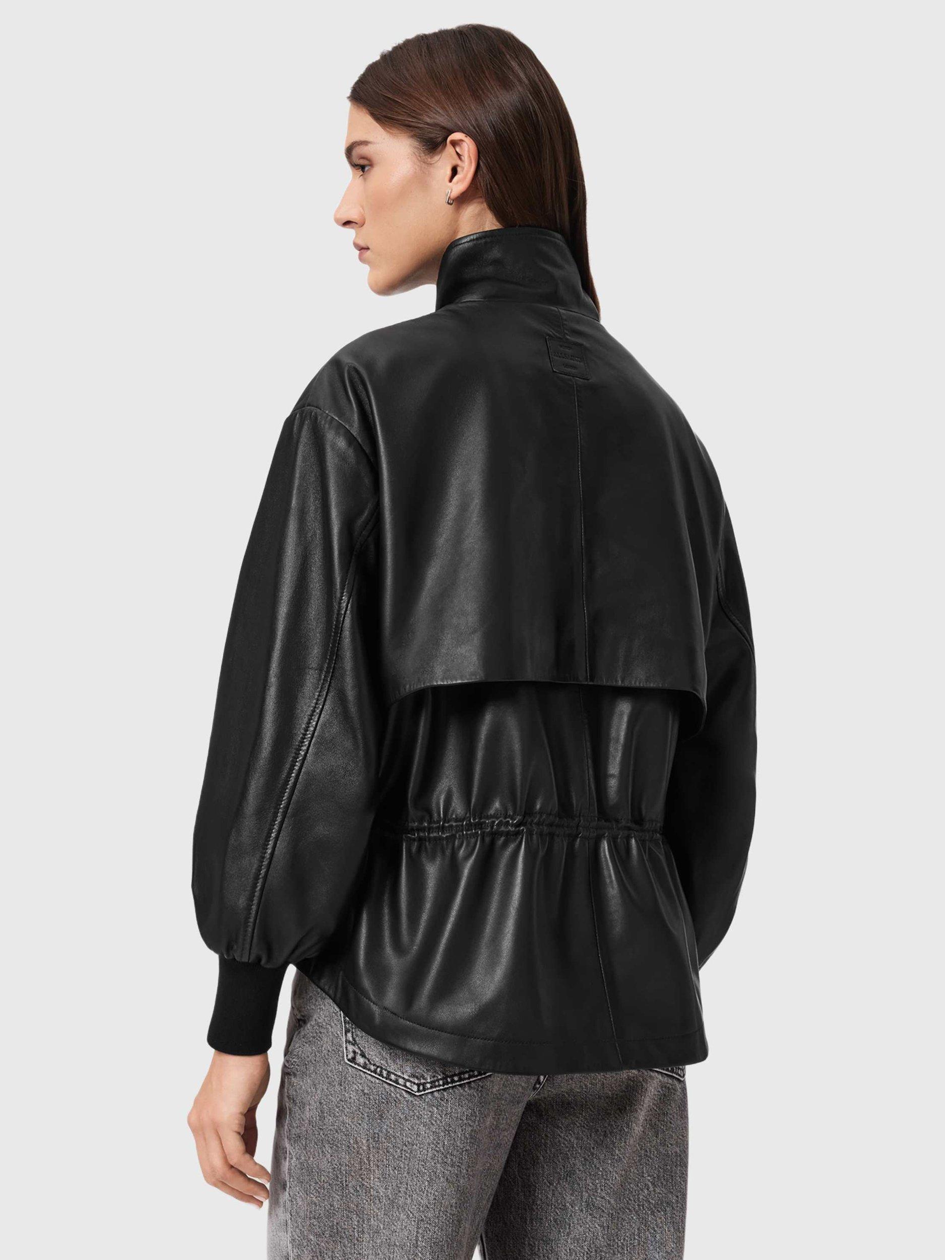 Levelling up your layering this season, this leather AllSaints jacket features a funnel neck, zip front, oversized flap pockets and a drawstring waist detail.