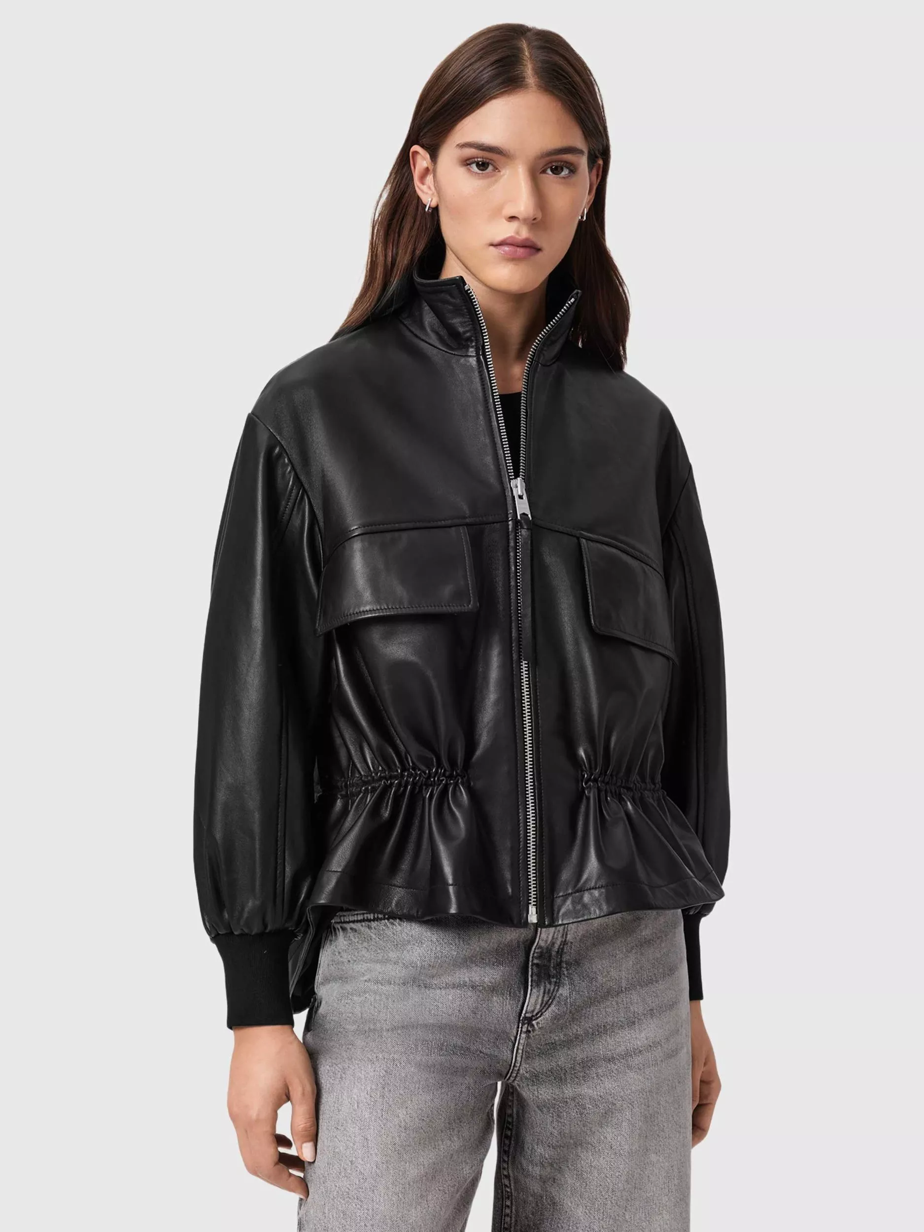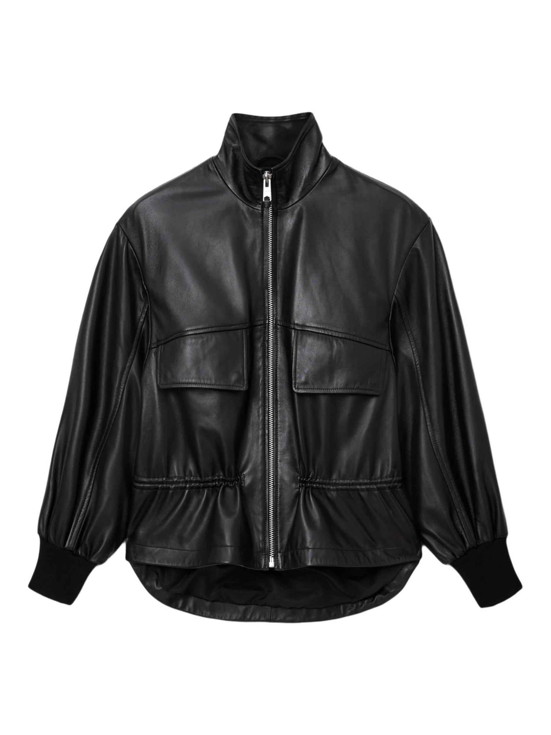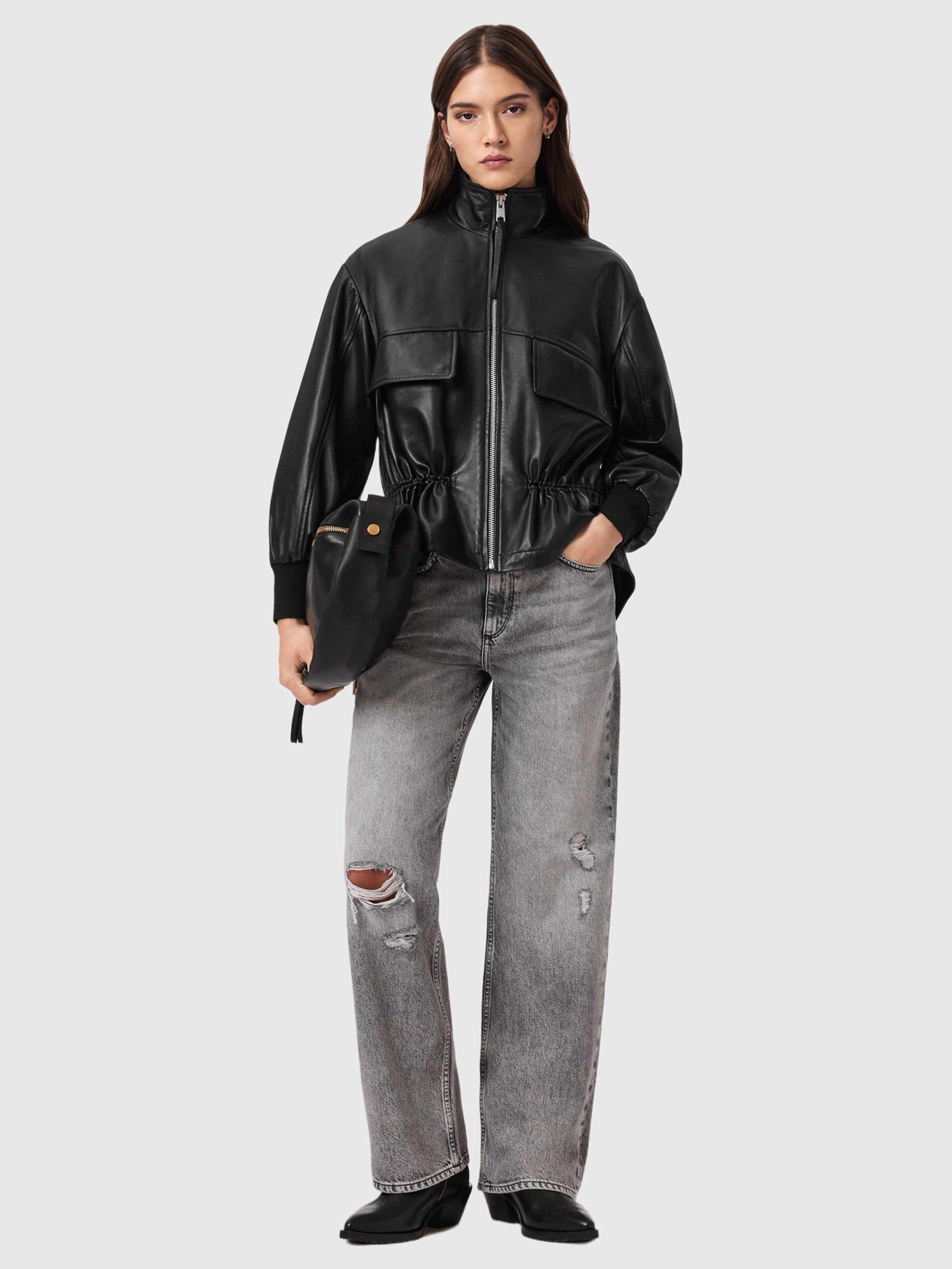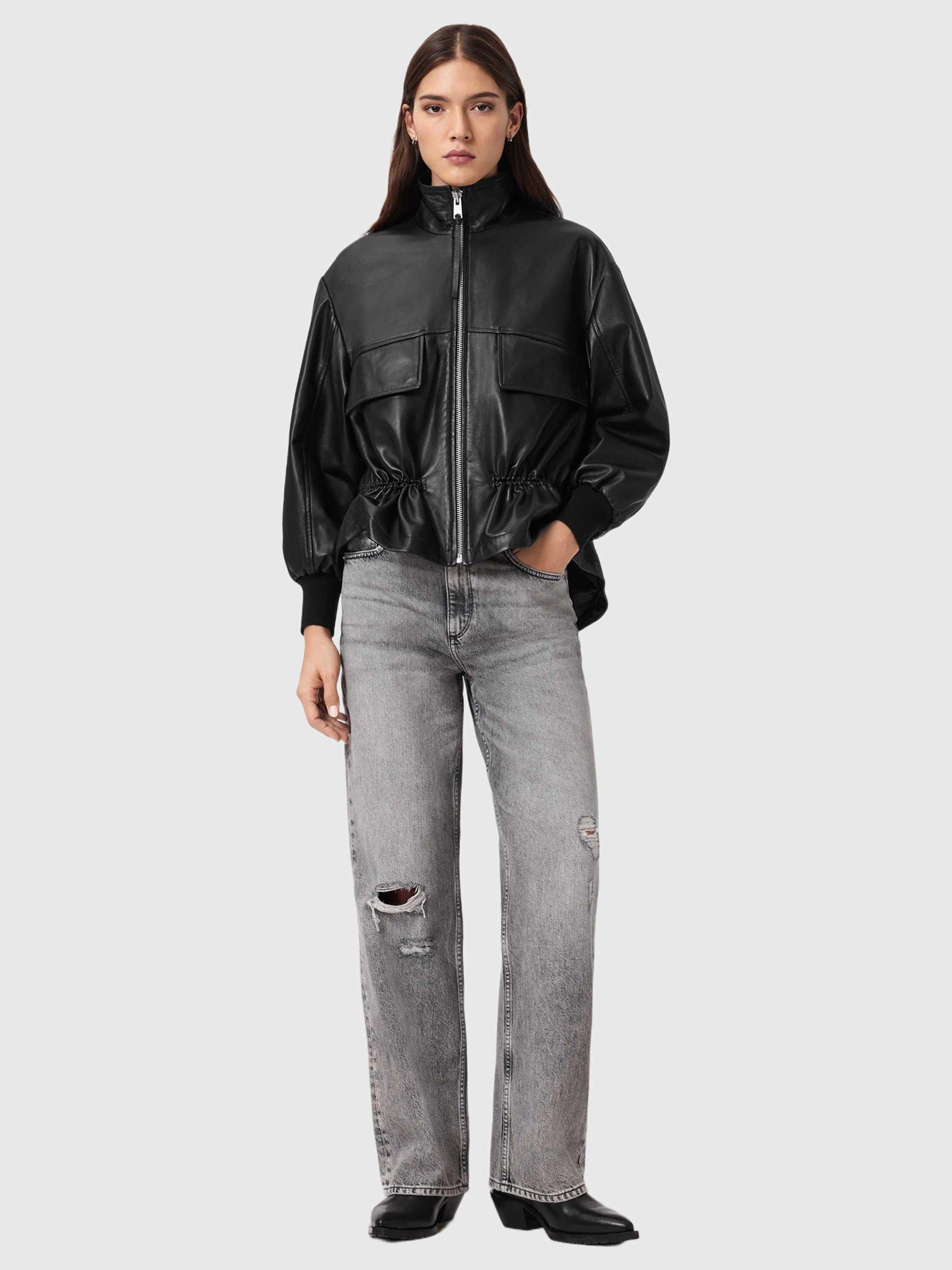 Levelling up your layering this season, this leather AllSaints jacket features a funnel neck, zip front, oversized flap pockets and a drawstring waist detail.