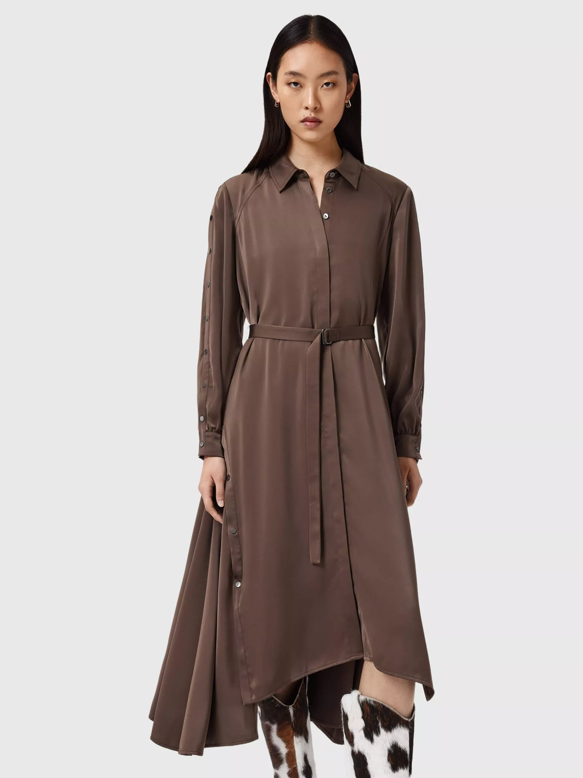 A midi shirt dress from AllSaints, designed from a lightweight fabric with a clever asymmetrical hem and crisp collar. Effortless to wear, it features a belt detail at the wait and poppers through the sleeves for your unique styling.