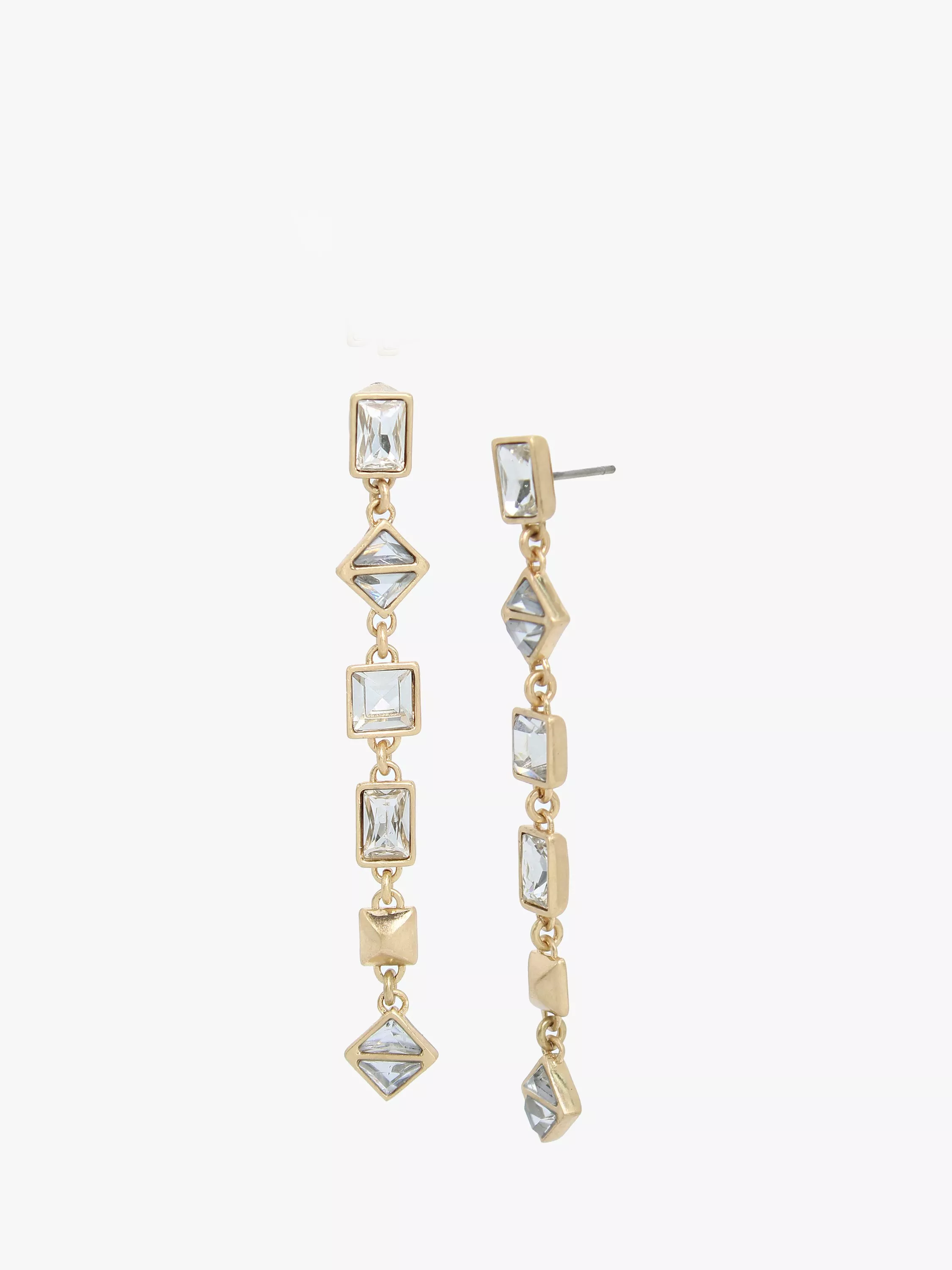 Refined linear earrings featuring geometric hardware and crystal stones. Posts are made from stainless steel for an elevated everyday look. Earrings have a post back closure. Made from brass, glass crystal, resin and stainless steel.
