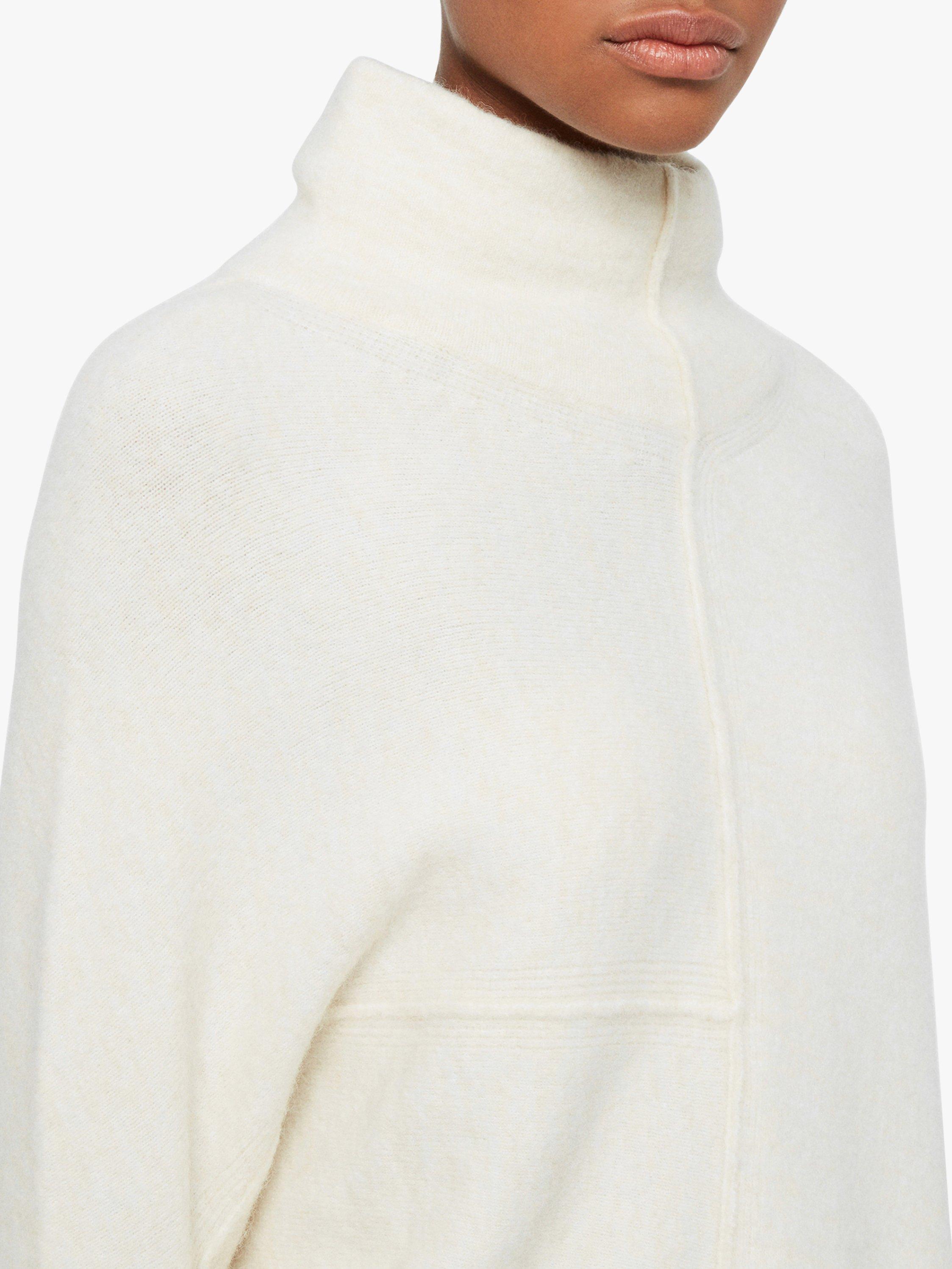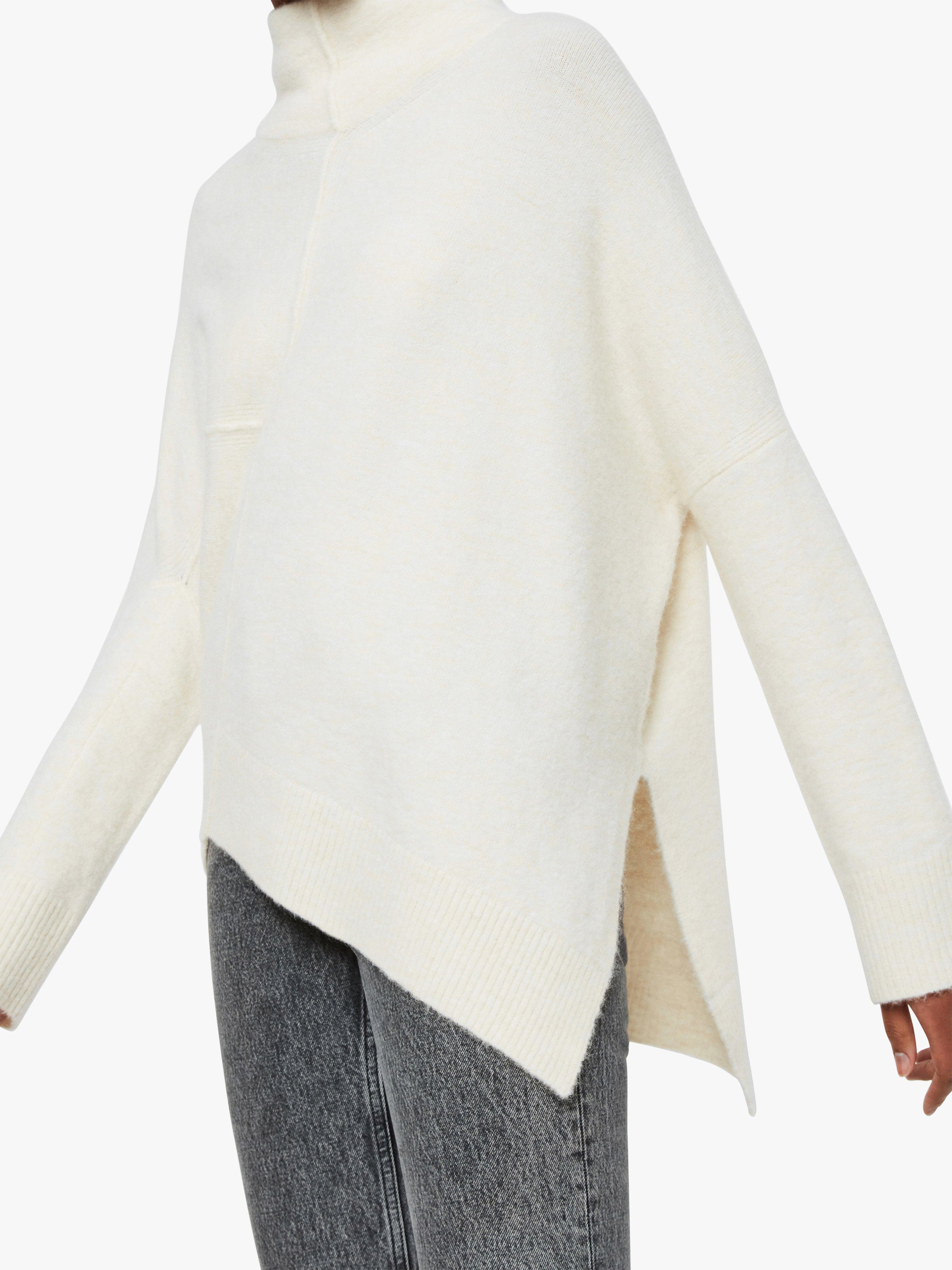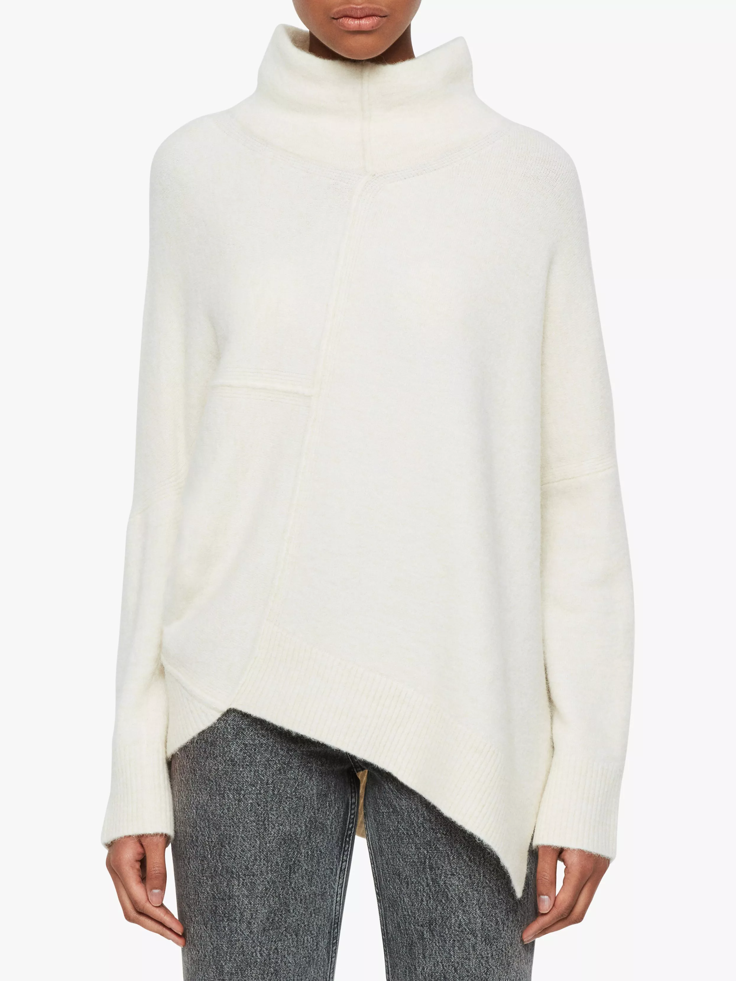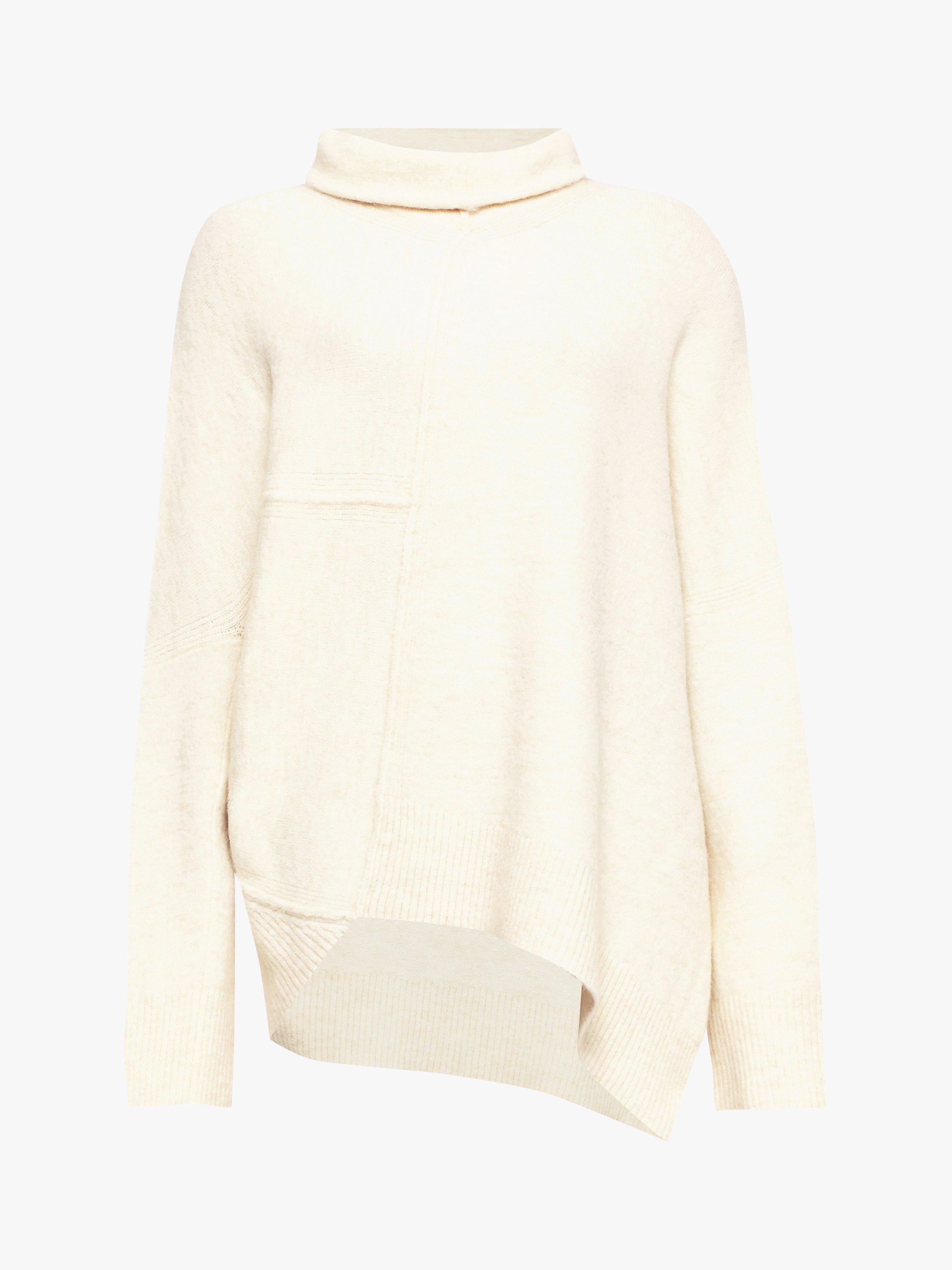 Framed with a roll neckline, the panelled design to the front creates an edgy asymmetric shape whilst the slim sleeves balance out the volume in the main body. Finished with deep side slits at the hem for a contemporary feel, pair with denim and leather biker boots for effortless off-duty style.
