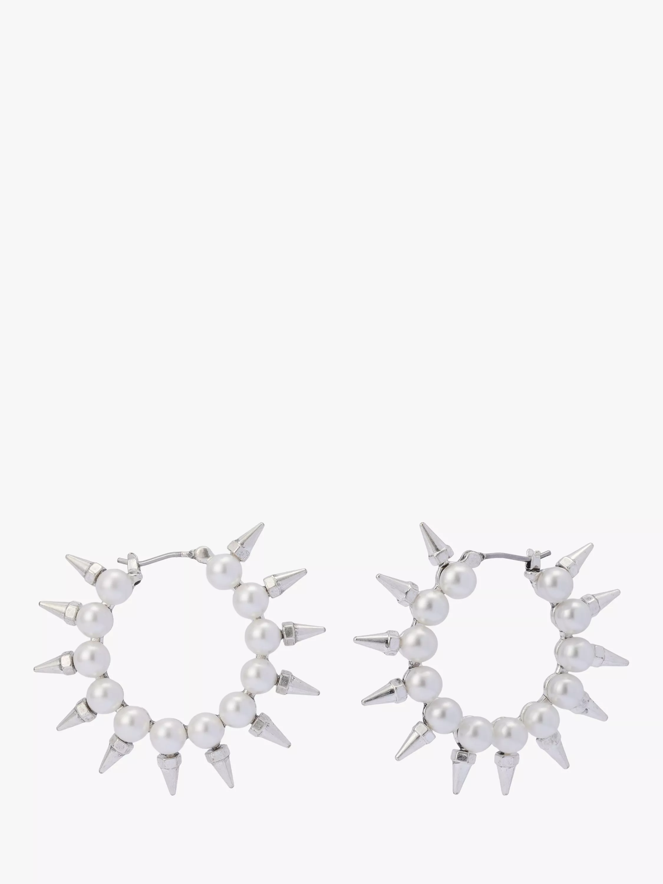 Minimal medium-sized pearl hoop earrings haloed with spike hardware for a sophisticated touch. Posts are made from hypoallergenic stainless steel, perfect for everyday. Earrings have a click-top closure. Made from brass, imitation pearl and stainless steel. Suitable for pierced ears only.