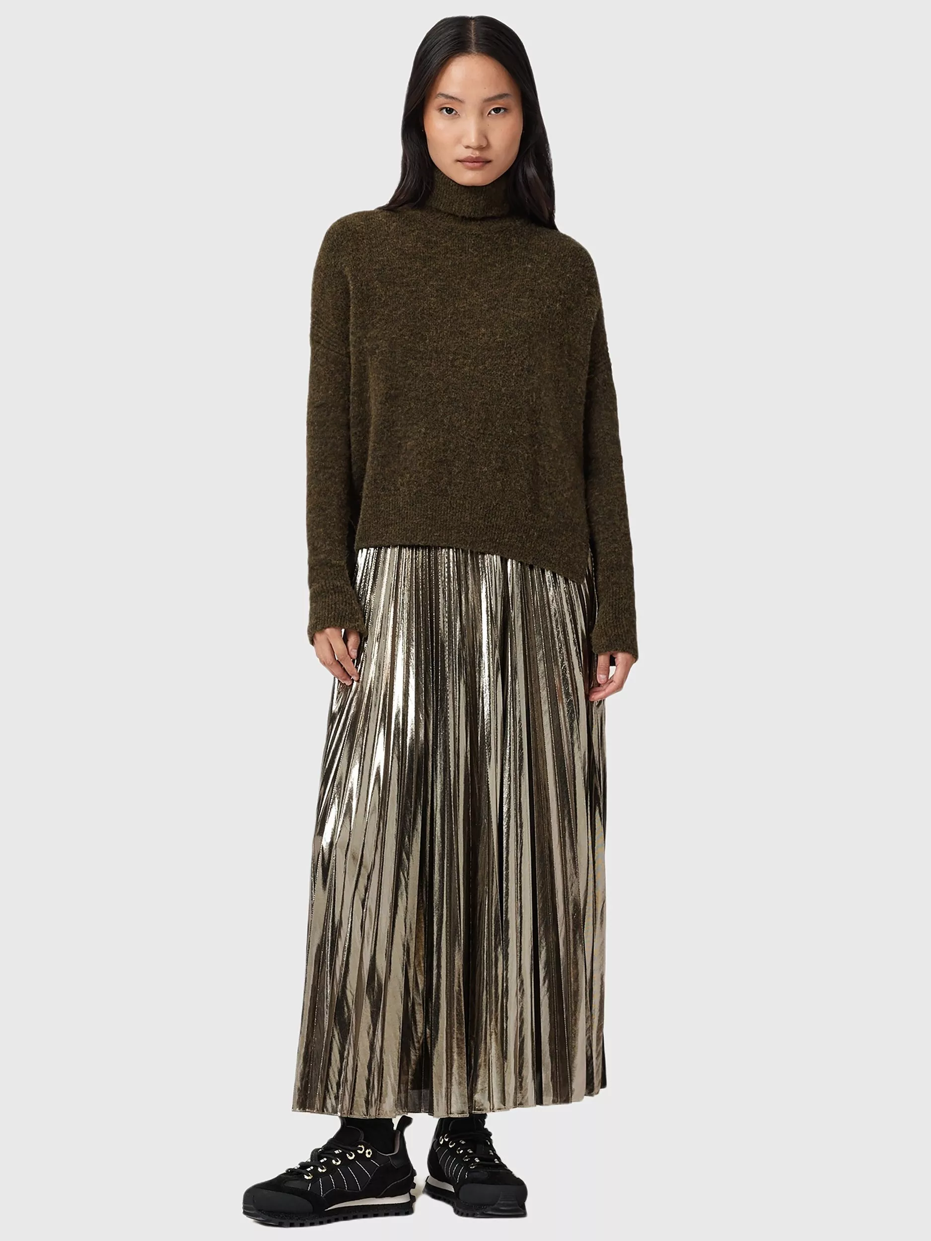 Lightweight warmth, sleek lines, and a shimmering touch. This relaxed fit maxi dress fits comfortably all day with its roll neck and long sleeves. You get style and substance, perfect for when you want to feel your best.