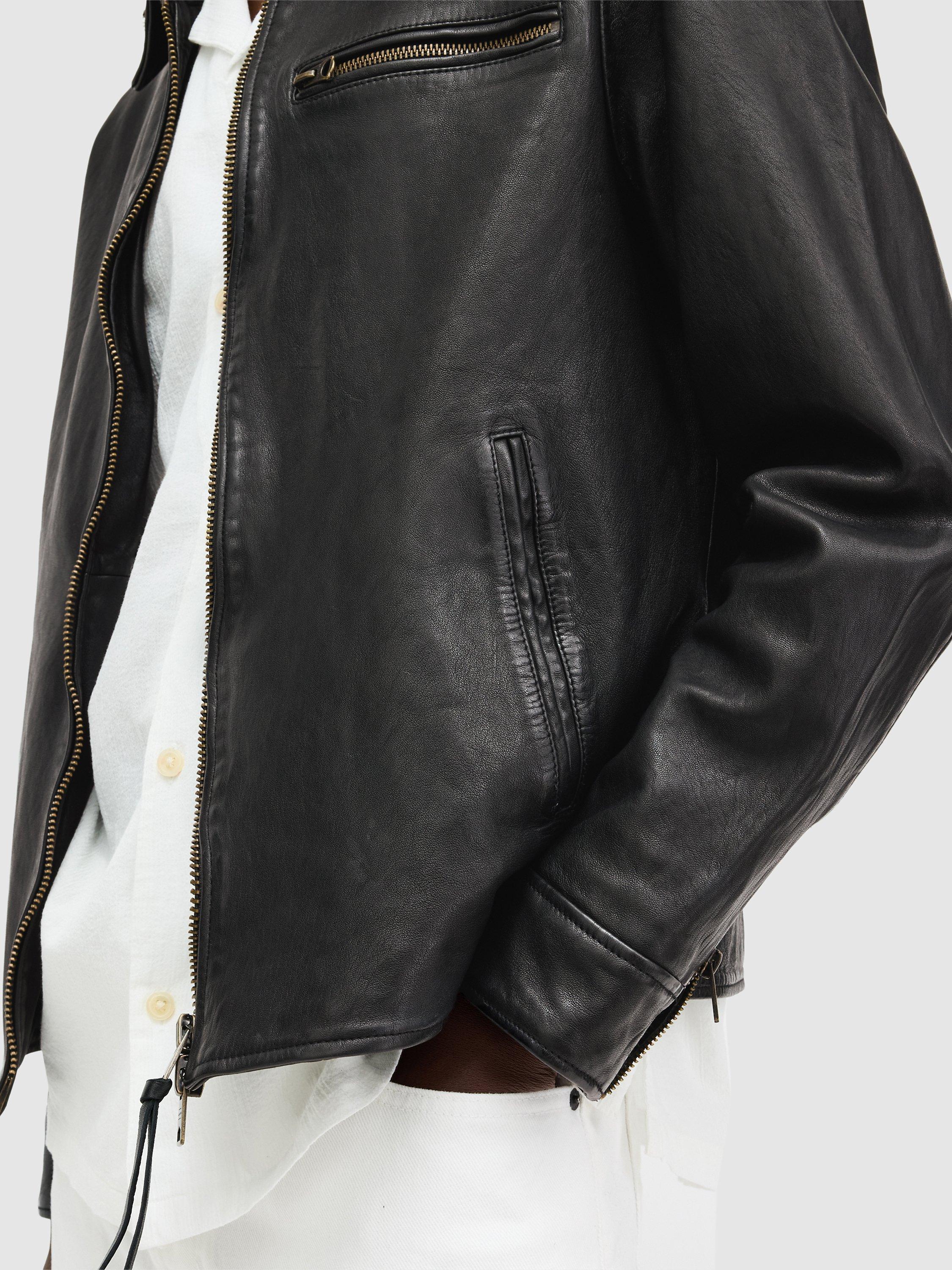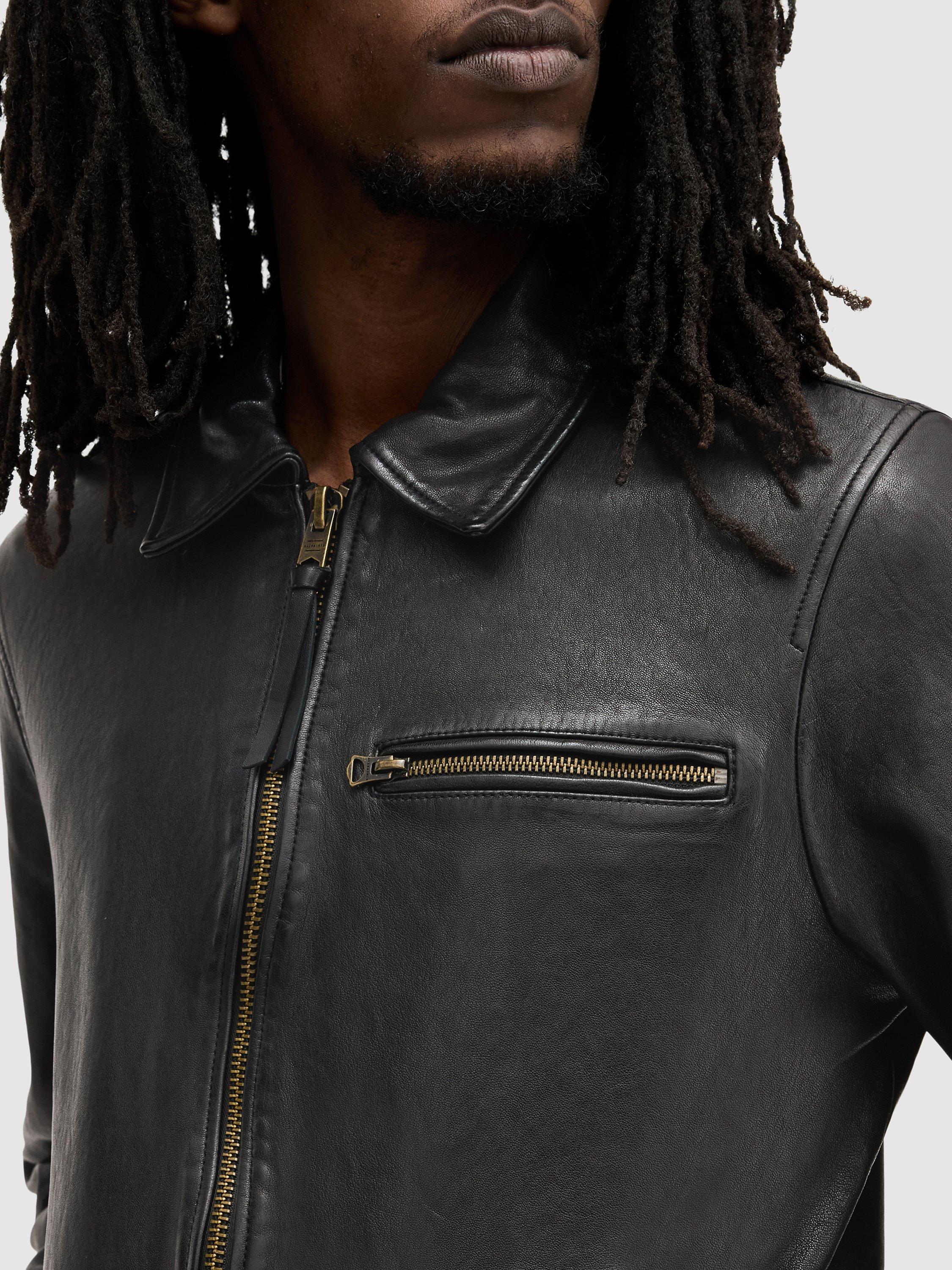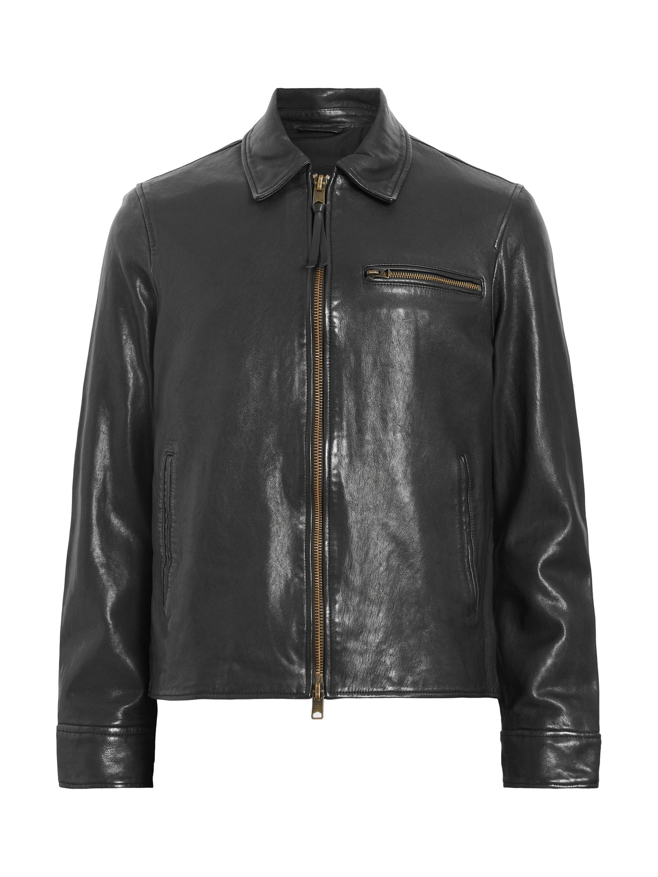 A vintage-style motorcycle jacket with a full-front zip from AllSaints. The Miller Jacket is crafted from premium leather with antique brass finish hardware and simple detailing. It's a versatile top layer that will take you from day to night with ease.