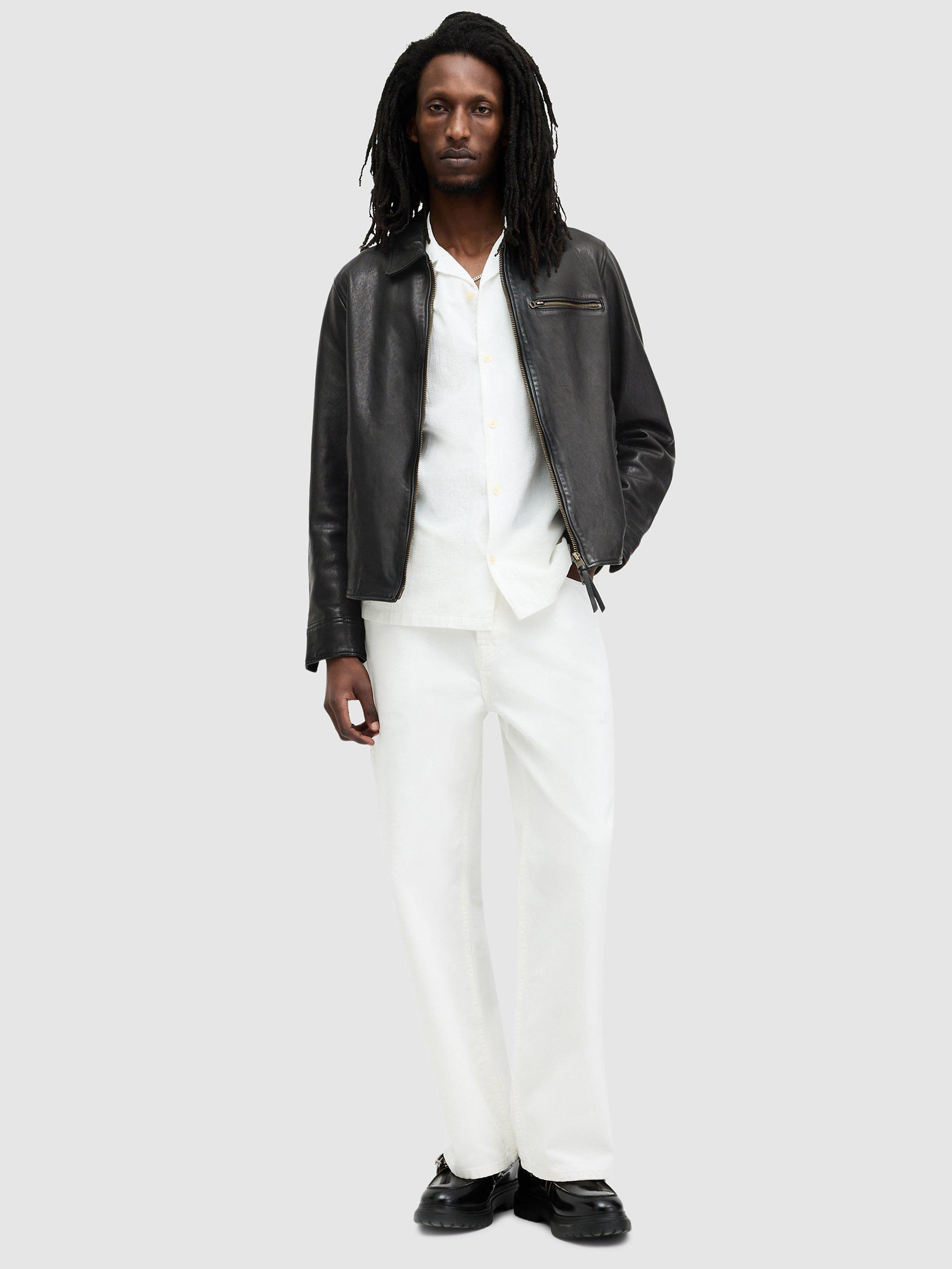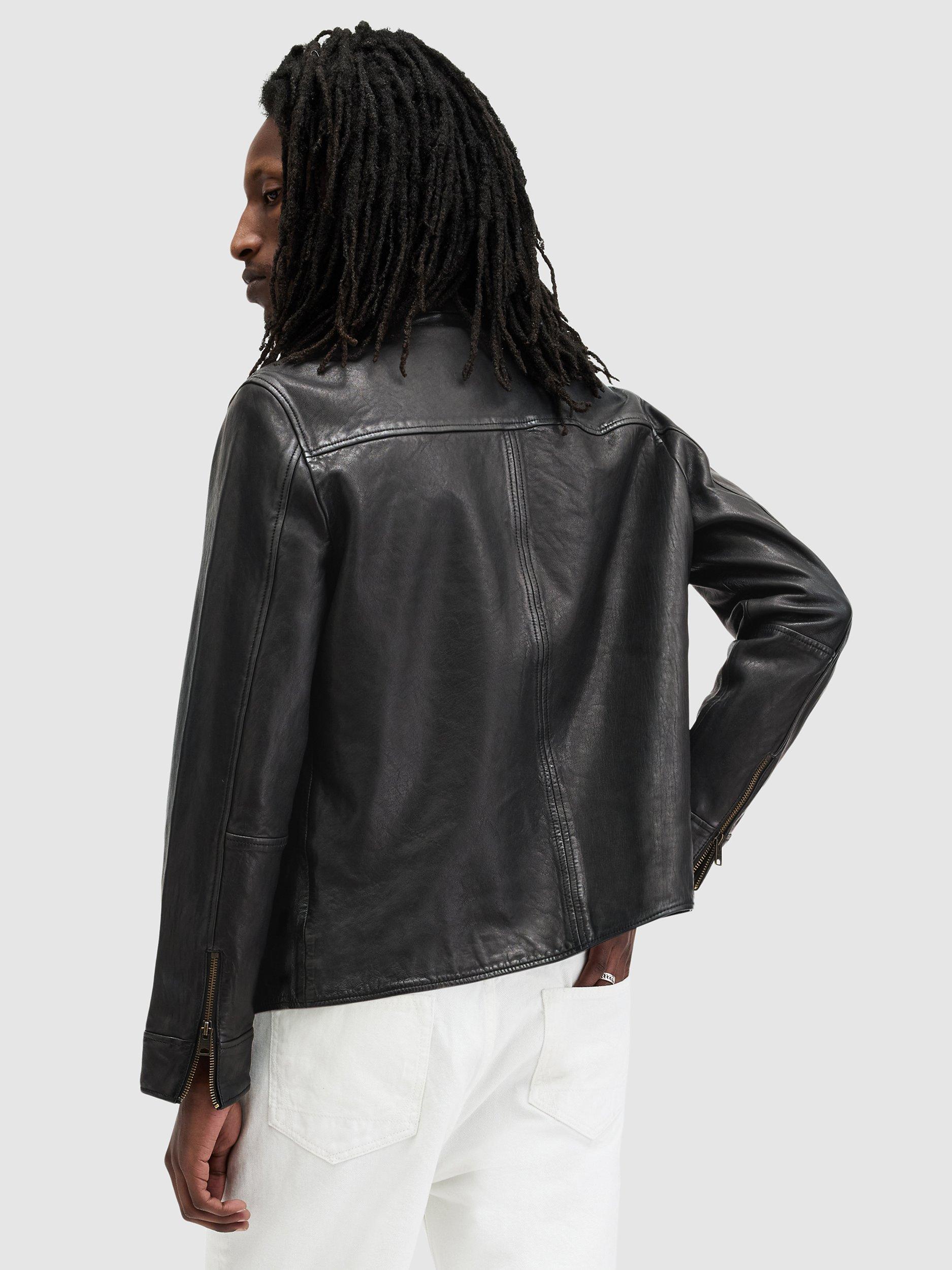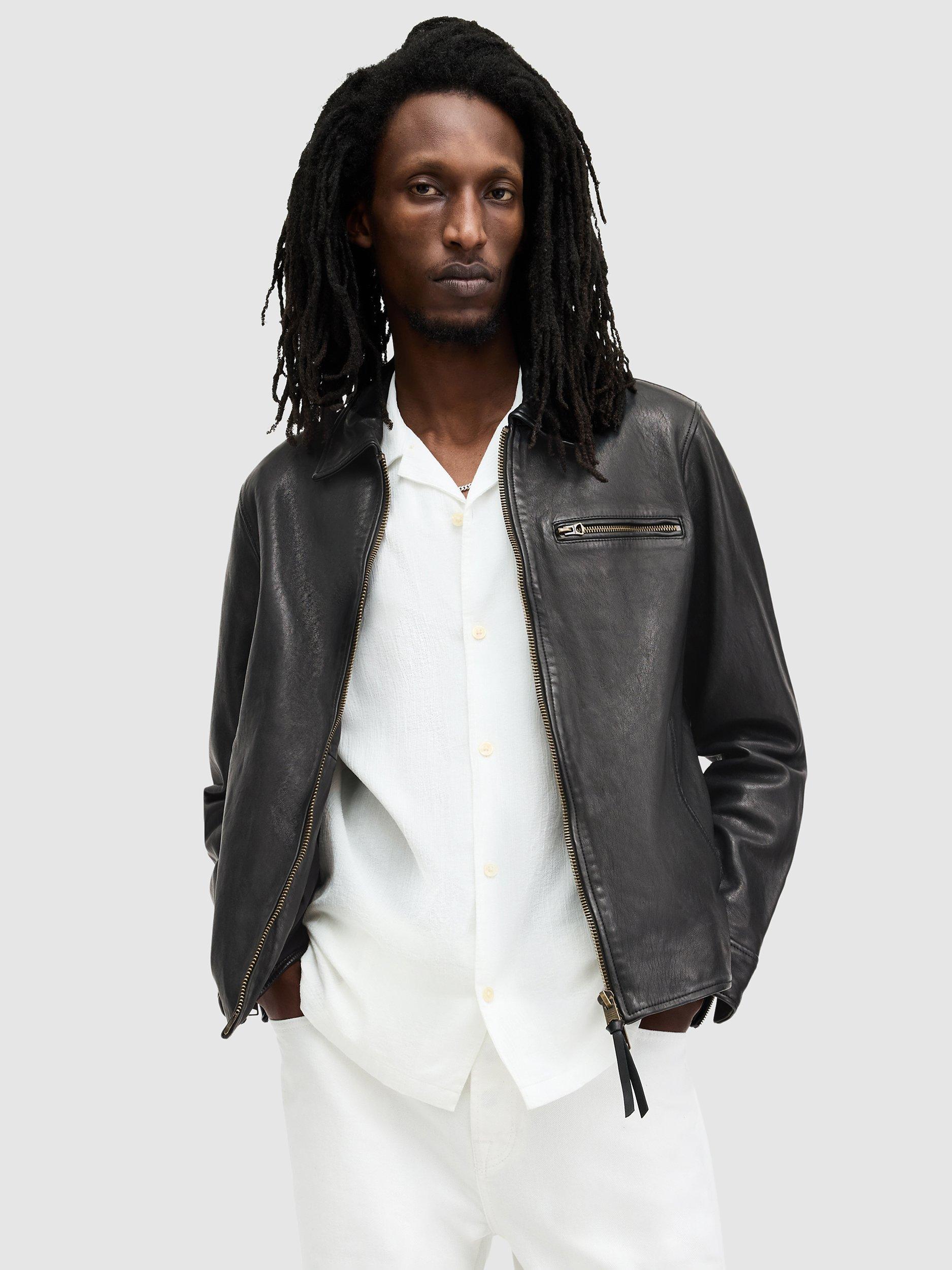 A vintage-style motorcycle jacket with a full-front zip from AllSaints. The Miller Jacket is crafted from premium leather with antique brass finish hardware and simple detailing. It's a versatile top layer that will take you from day to night with ease.