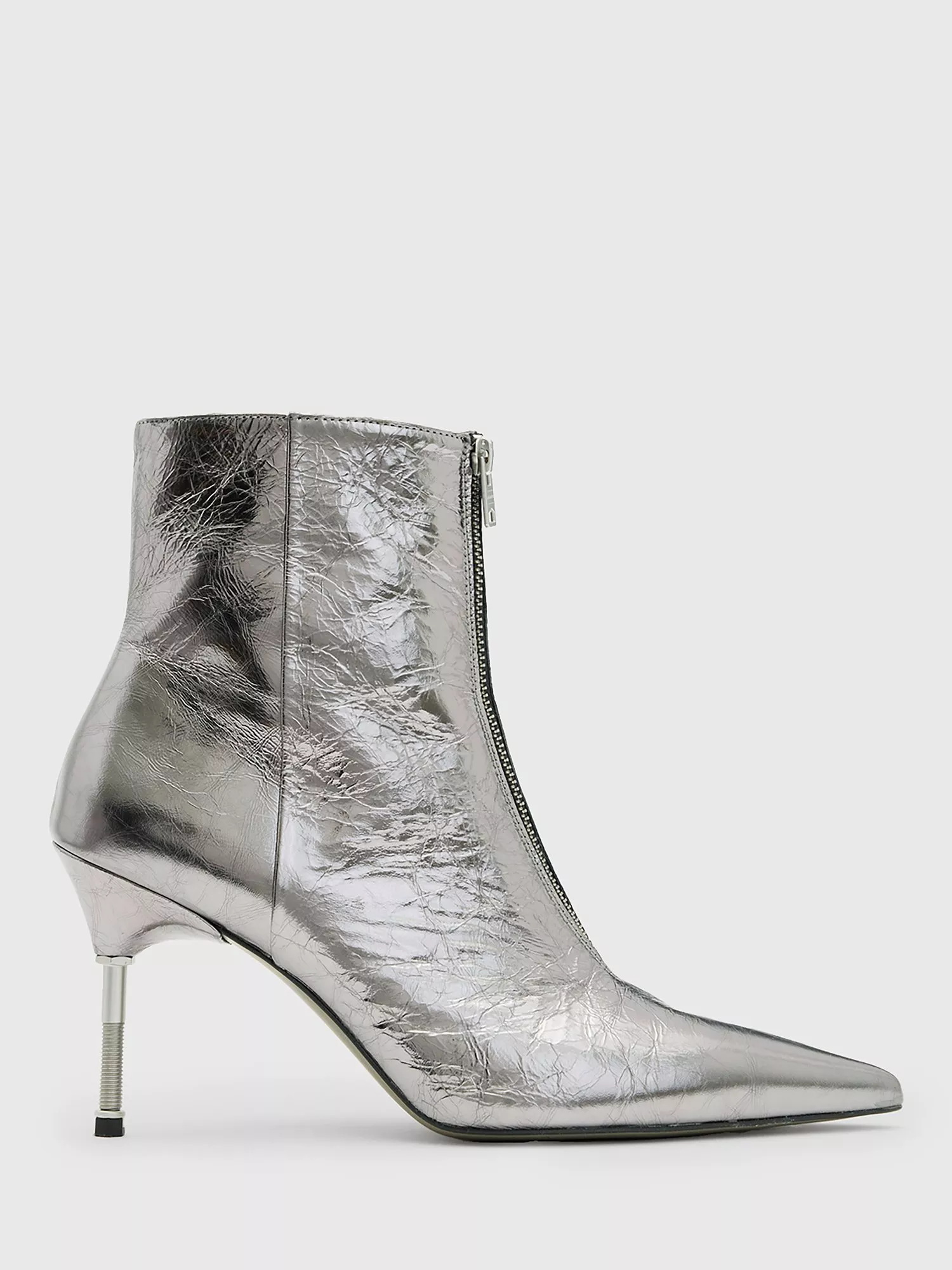 Made from leather, the innovative design features a front zip and a classic pointed-toe silhouette, elevated with a colour-coordinated stiletto heel.