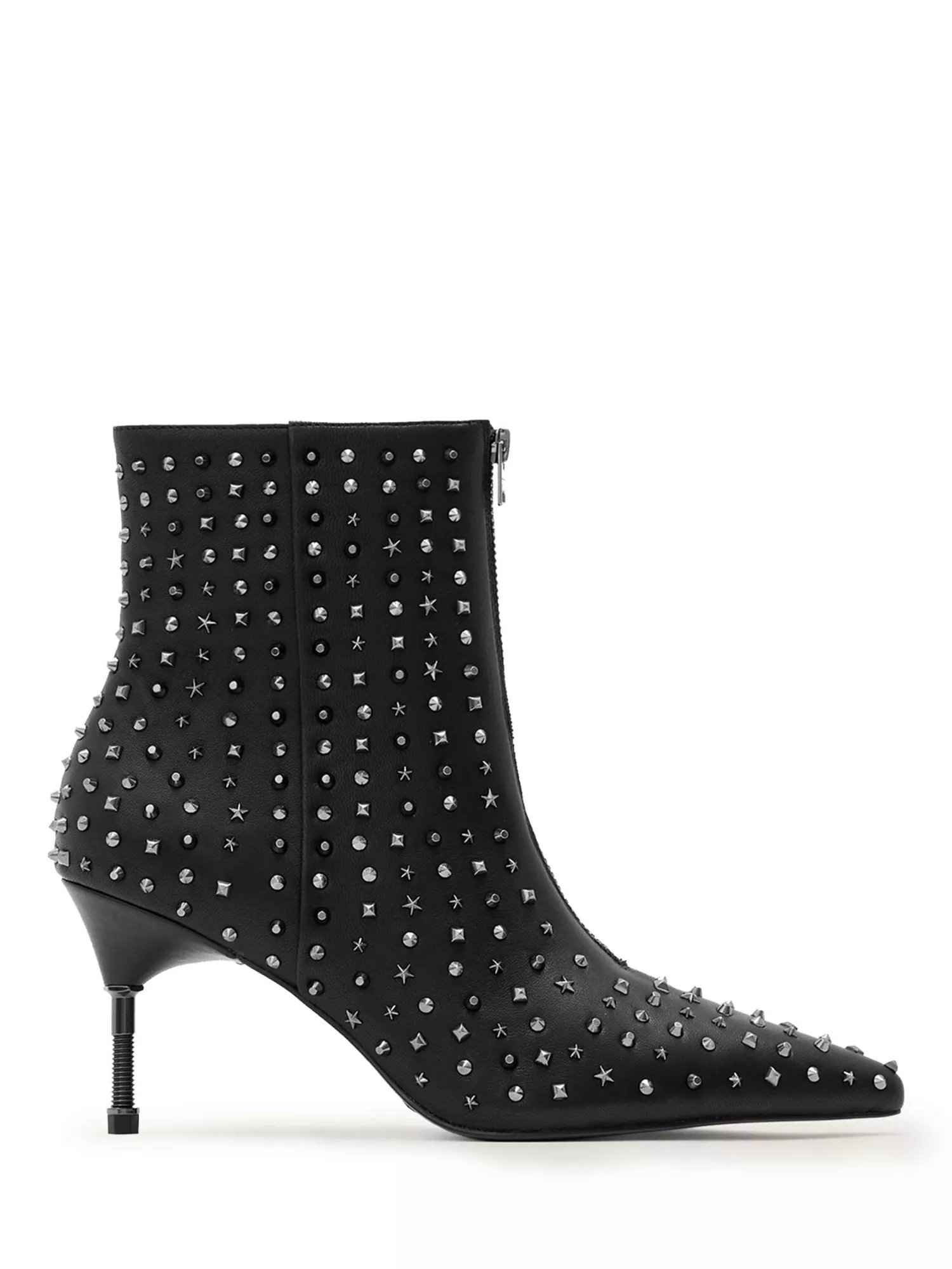 AllSaints ankle boots crafted from soft sheep leather with metallic stud embellishments and a striking kitten heel. The pointed toe and smart zip fastening keep your look sharp.