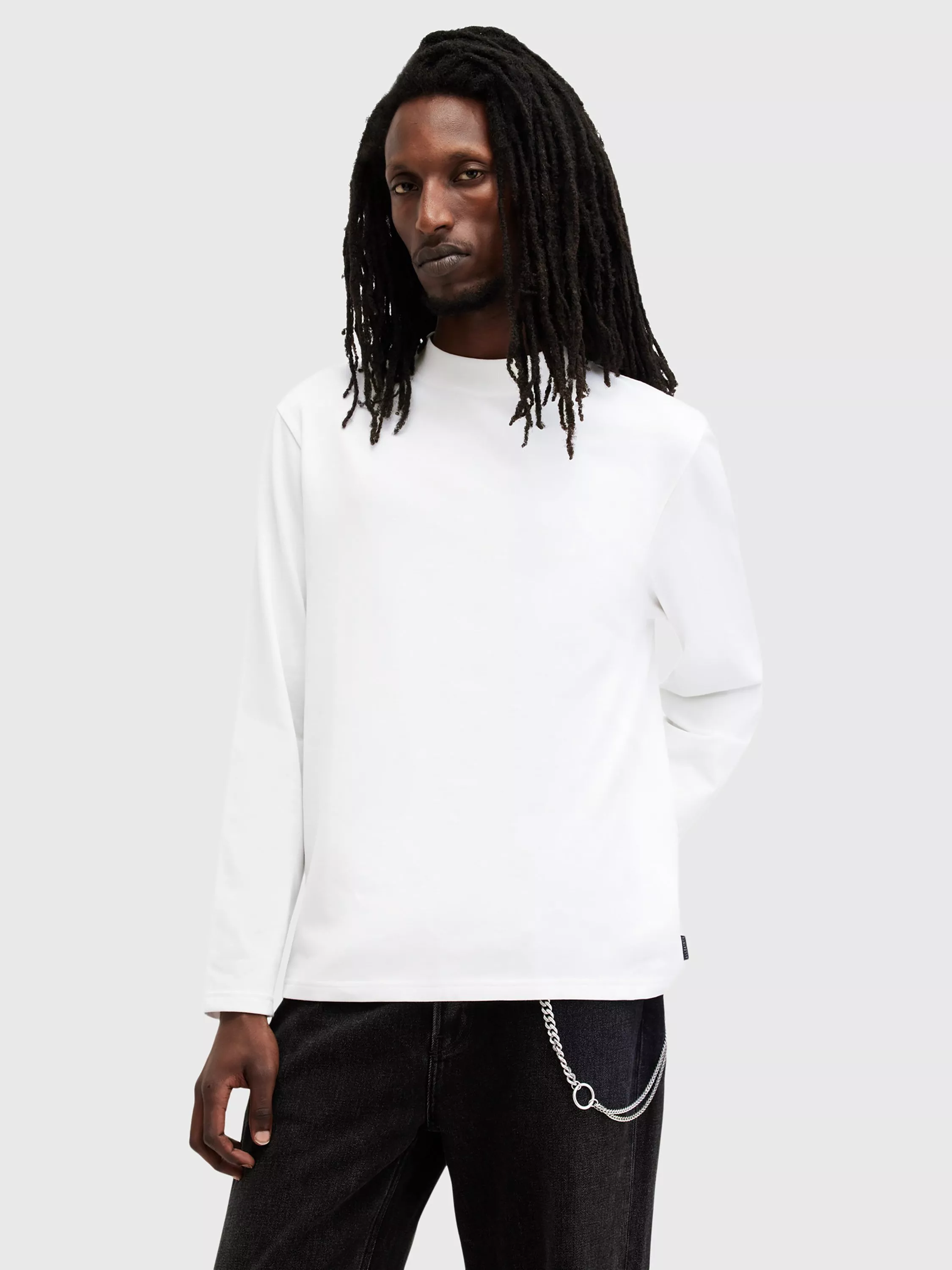 AllSaints' Mode has a relaxed fit (that's true-to-size), and a mock neck. It's completed with the subtle touch of tag branding at the lower left hem.
