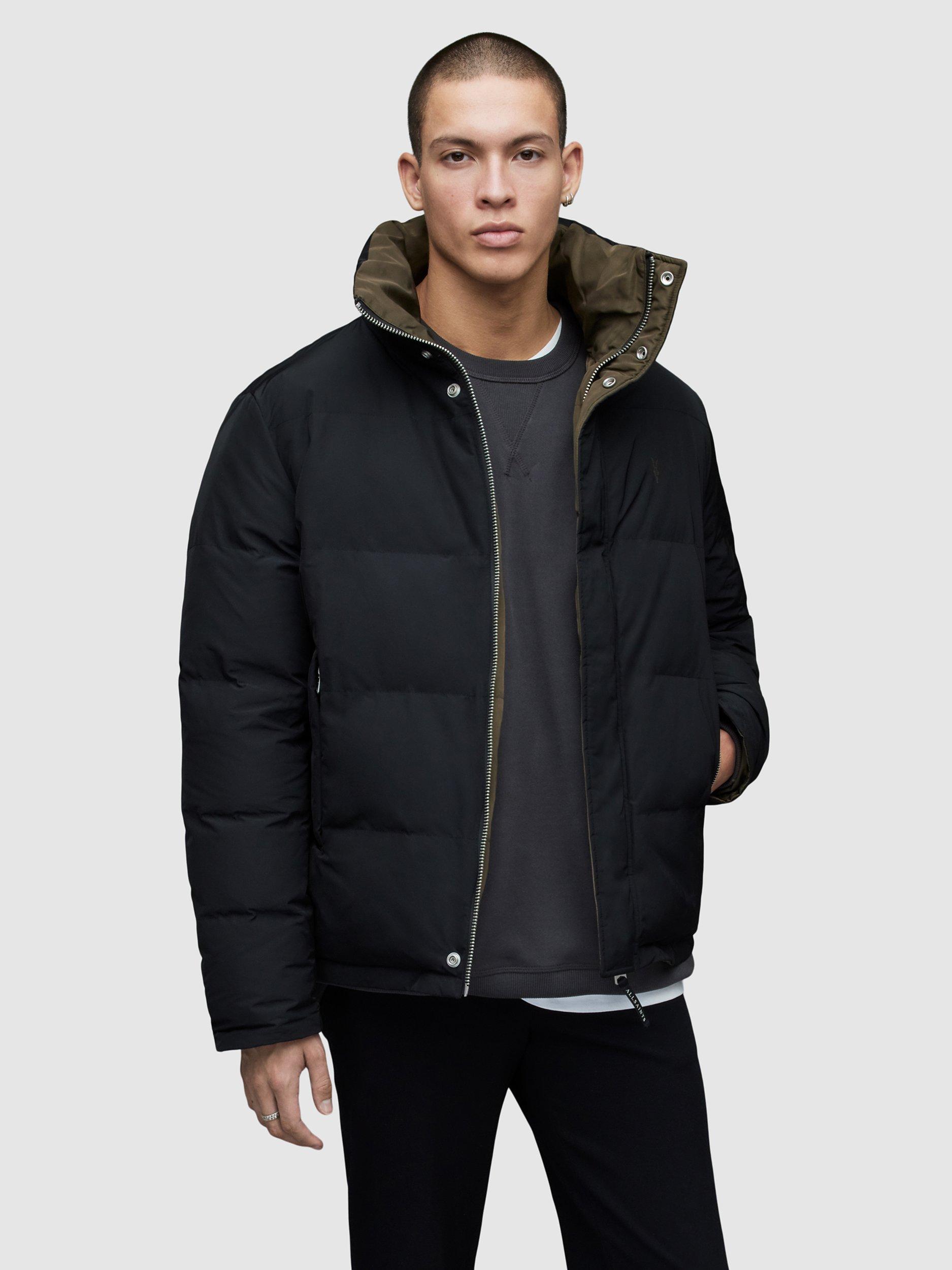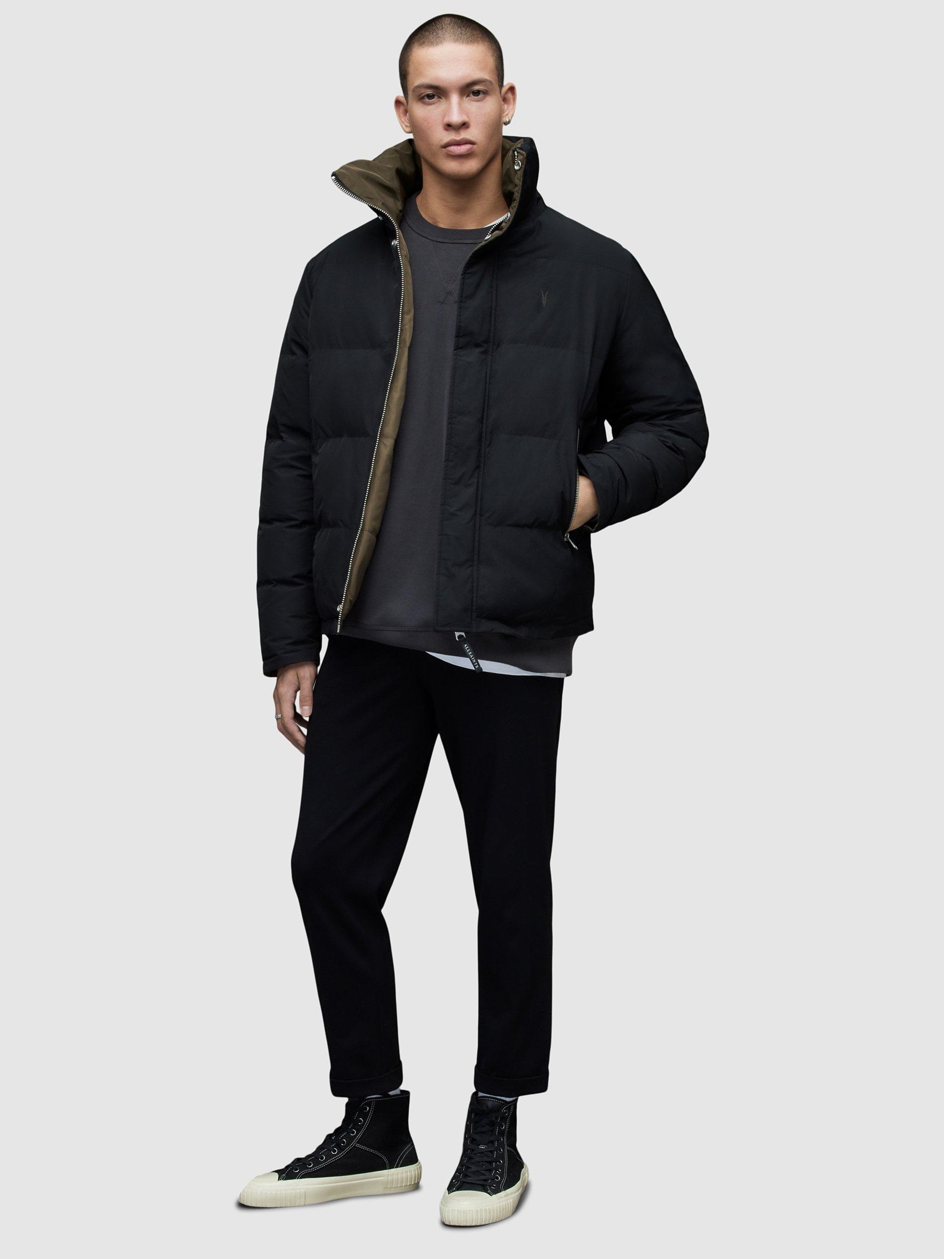 2-in-1. Reversible. Funnel neck. Long sleeve. Zip closure. Welt pockets. Ramskull embroidery