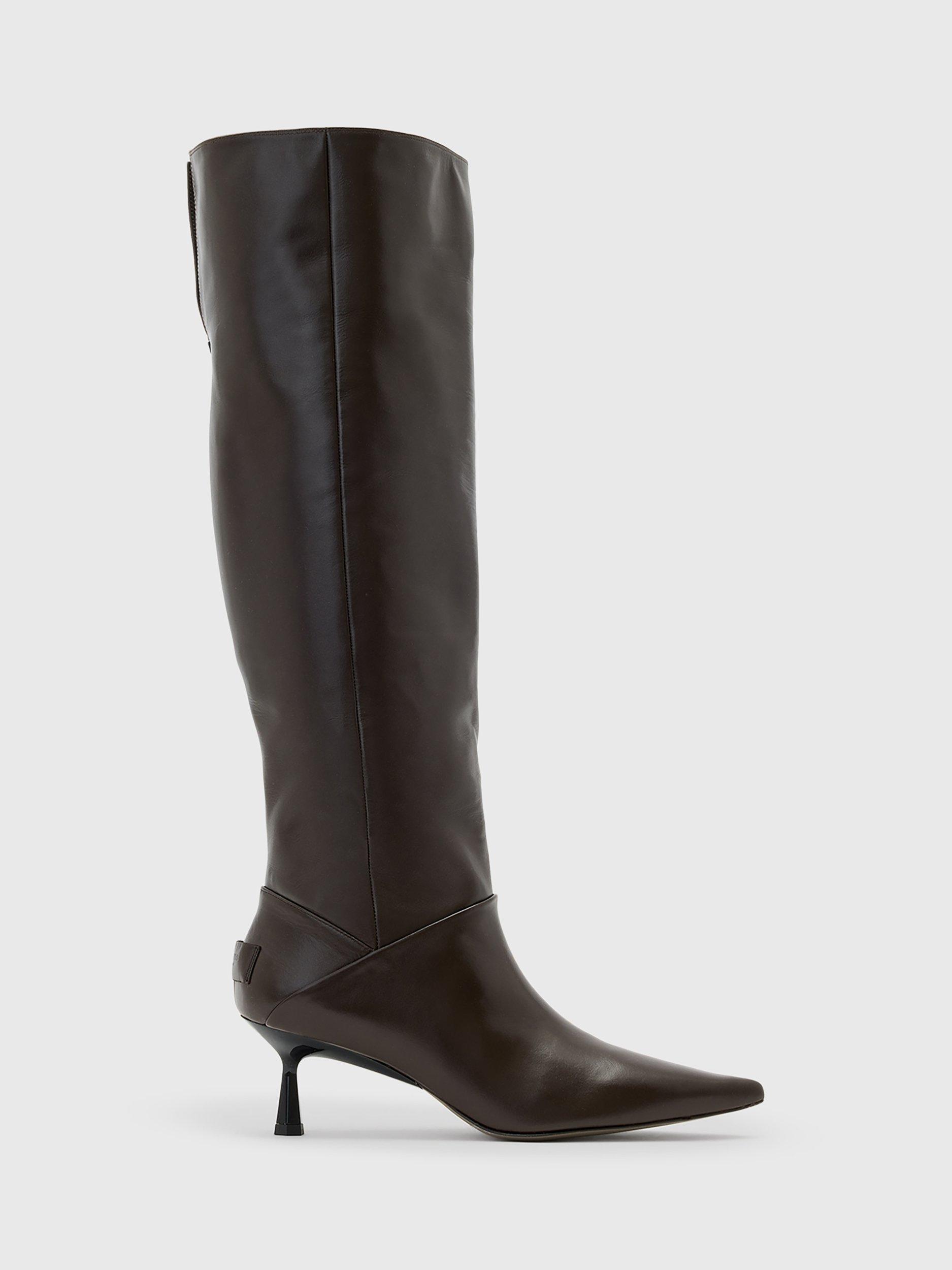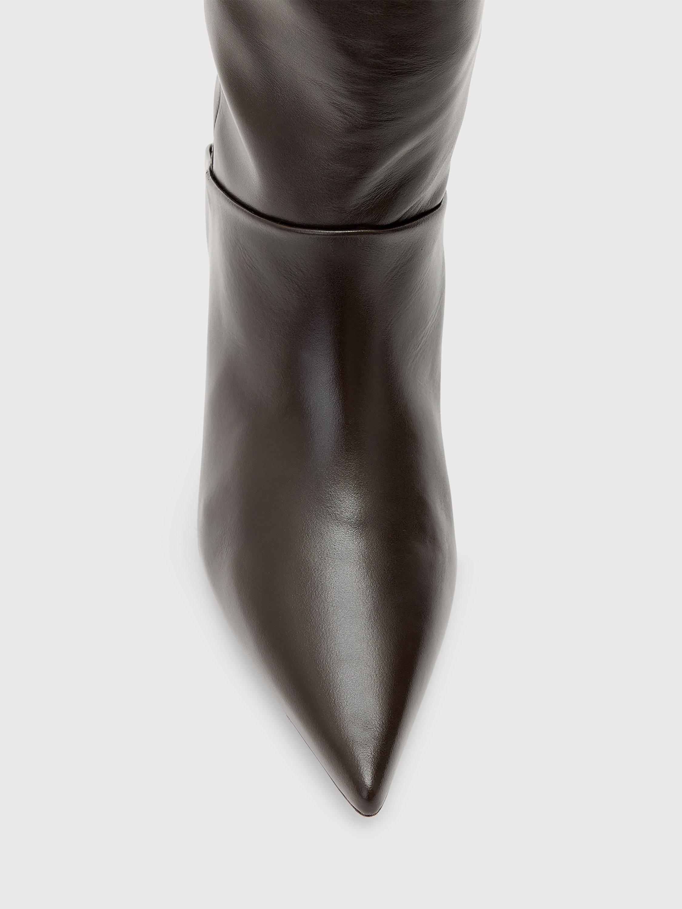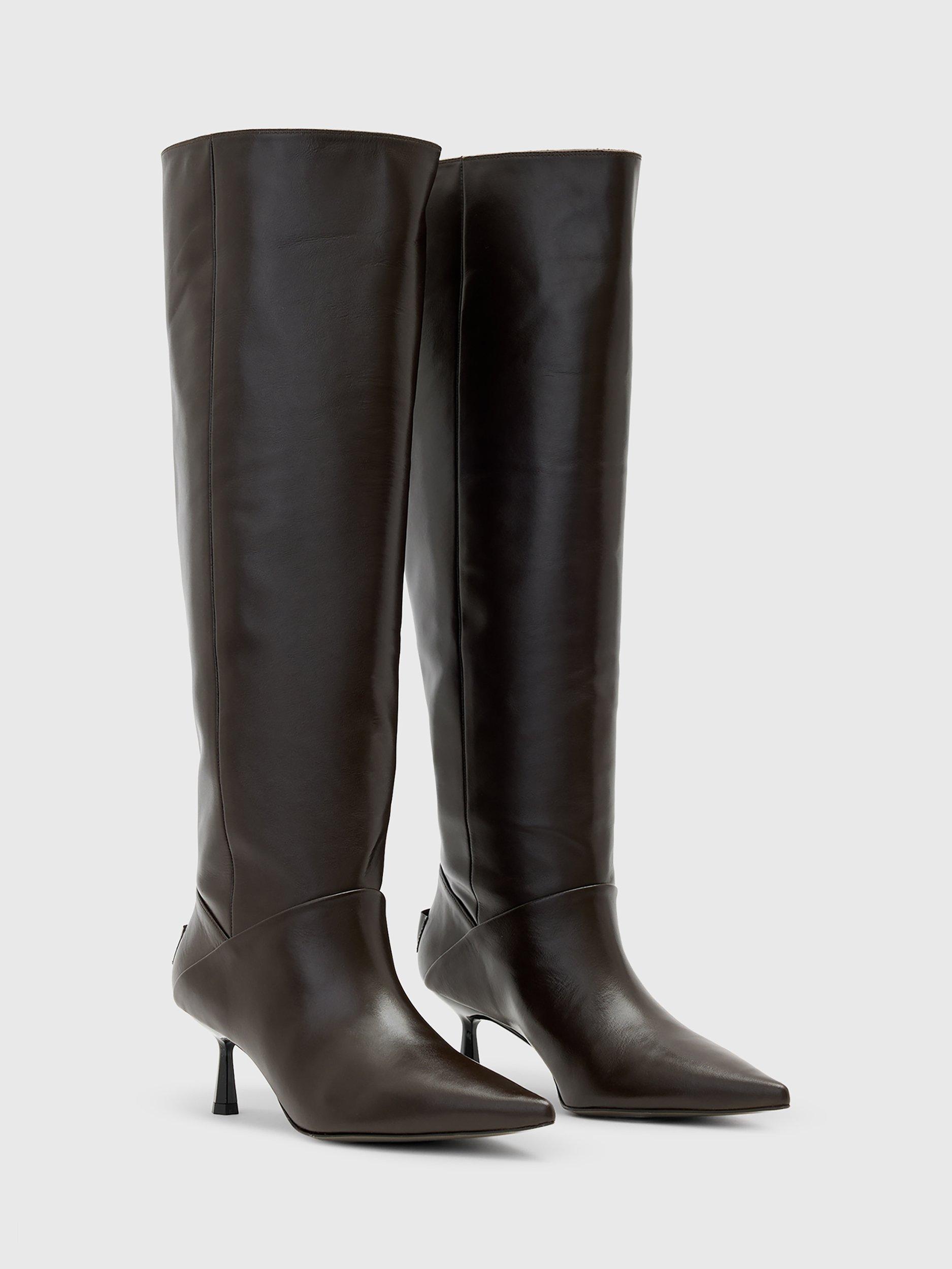 A pair of versatile boots from AllSaints. Offering supportive leather comfort and effortless slip-on wear, the pointed closed toe and mid kitten heel blend striking style with practical everyday use. You can wear this heeled pair two ways: knee high (perfect for dressing up with a mini dress) or folded over for a slouchy, but sophisticated styling option. Two in one – these are the boots of the season.