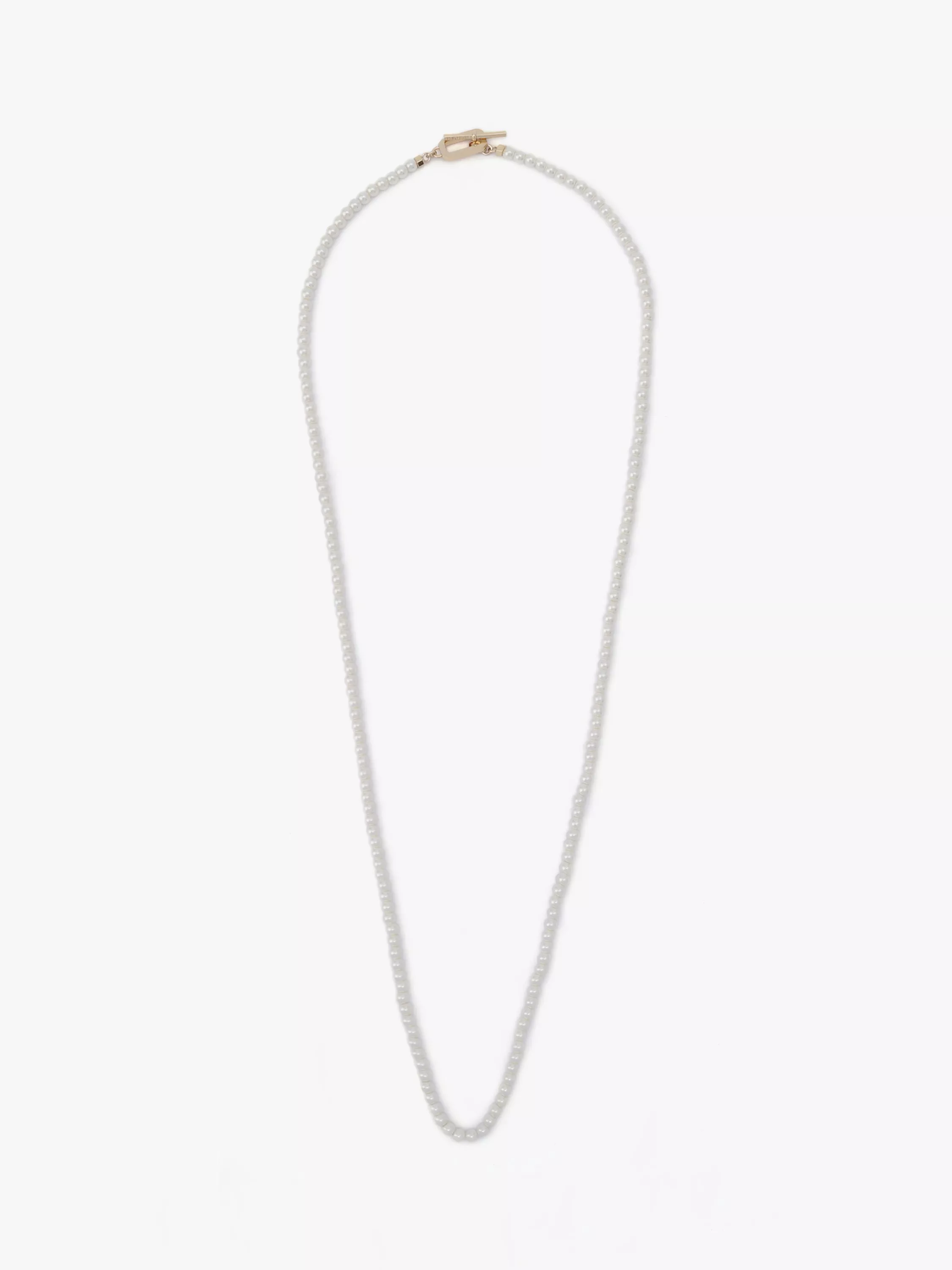 Delicate pearl strand necklace featuring a sophisticated y-shaped silhouette and minimal bolt hardware. Necklace has an easy toggle closure. Made from brass and imitation pearl.