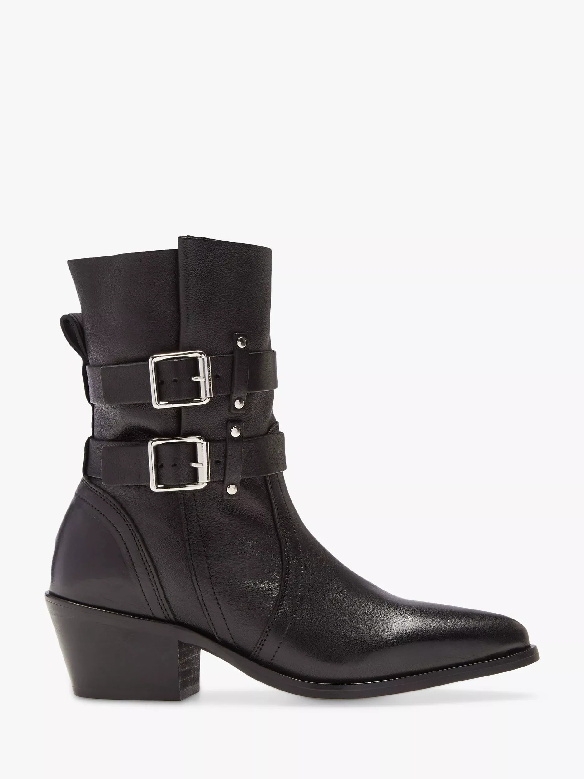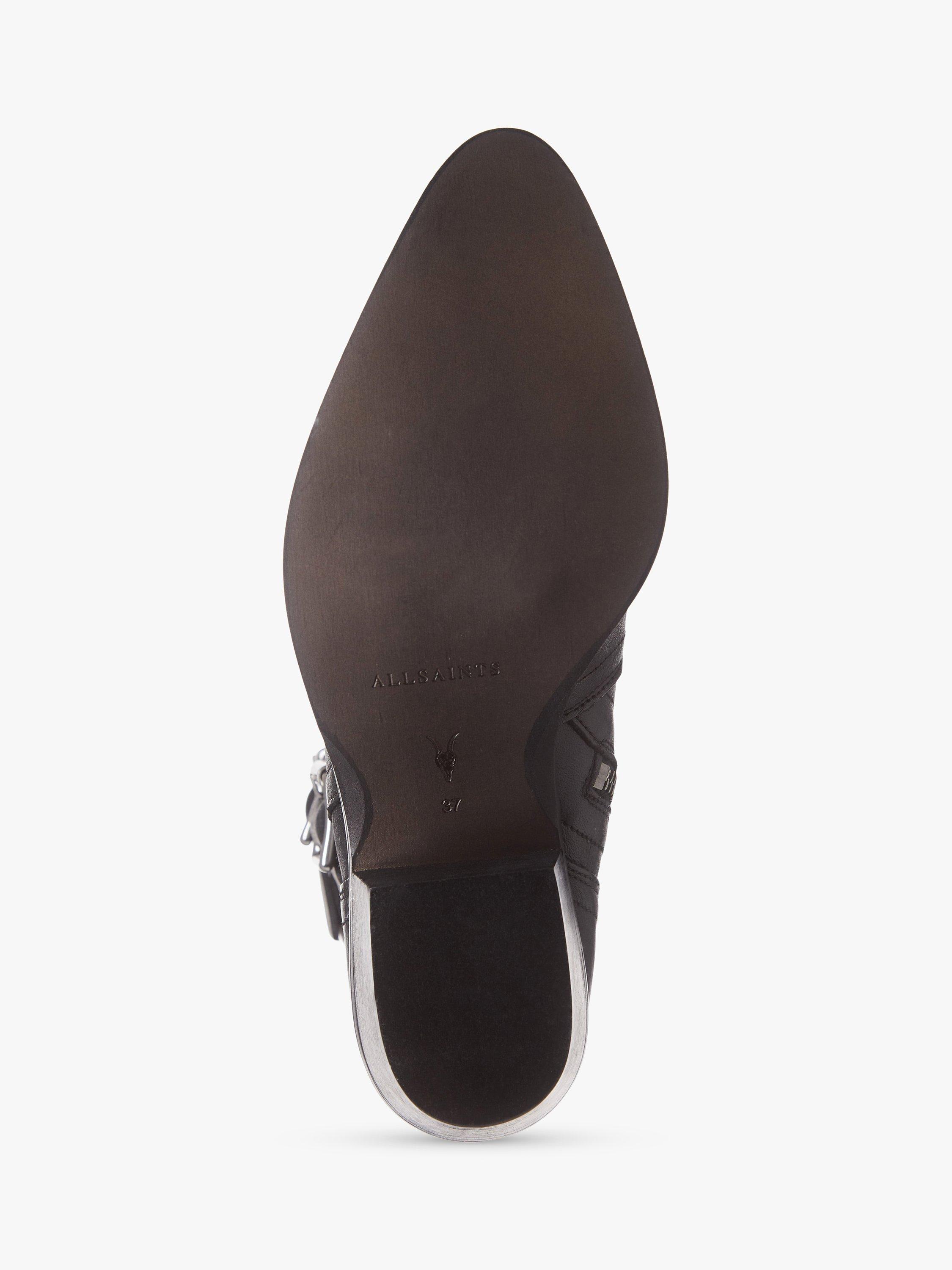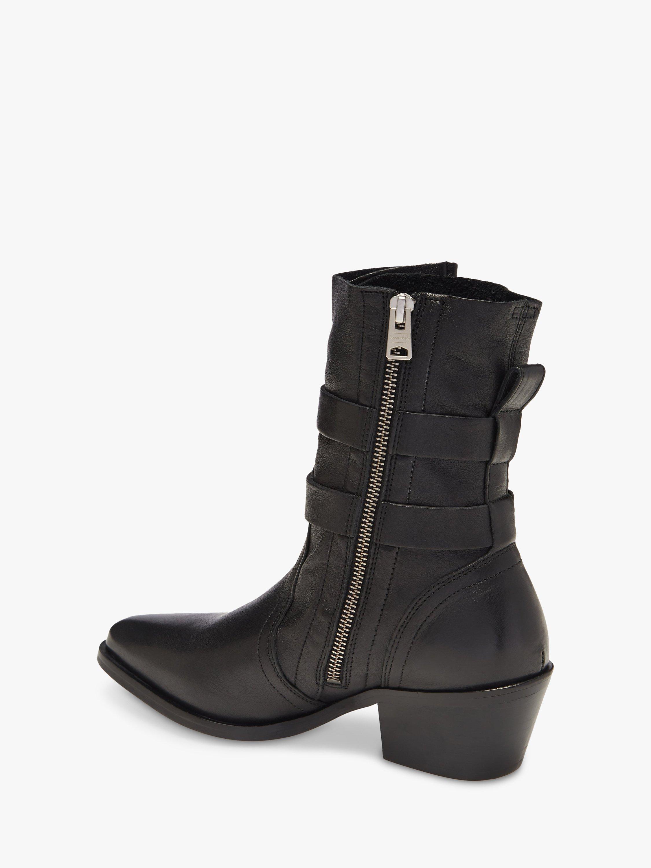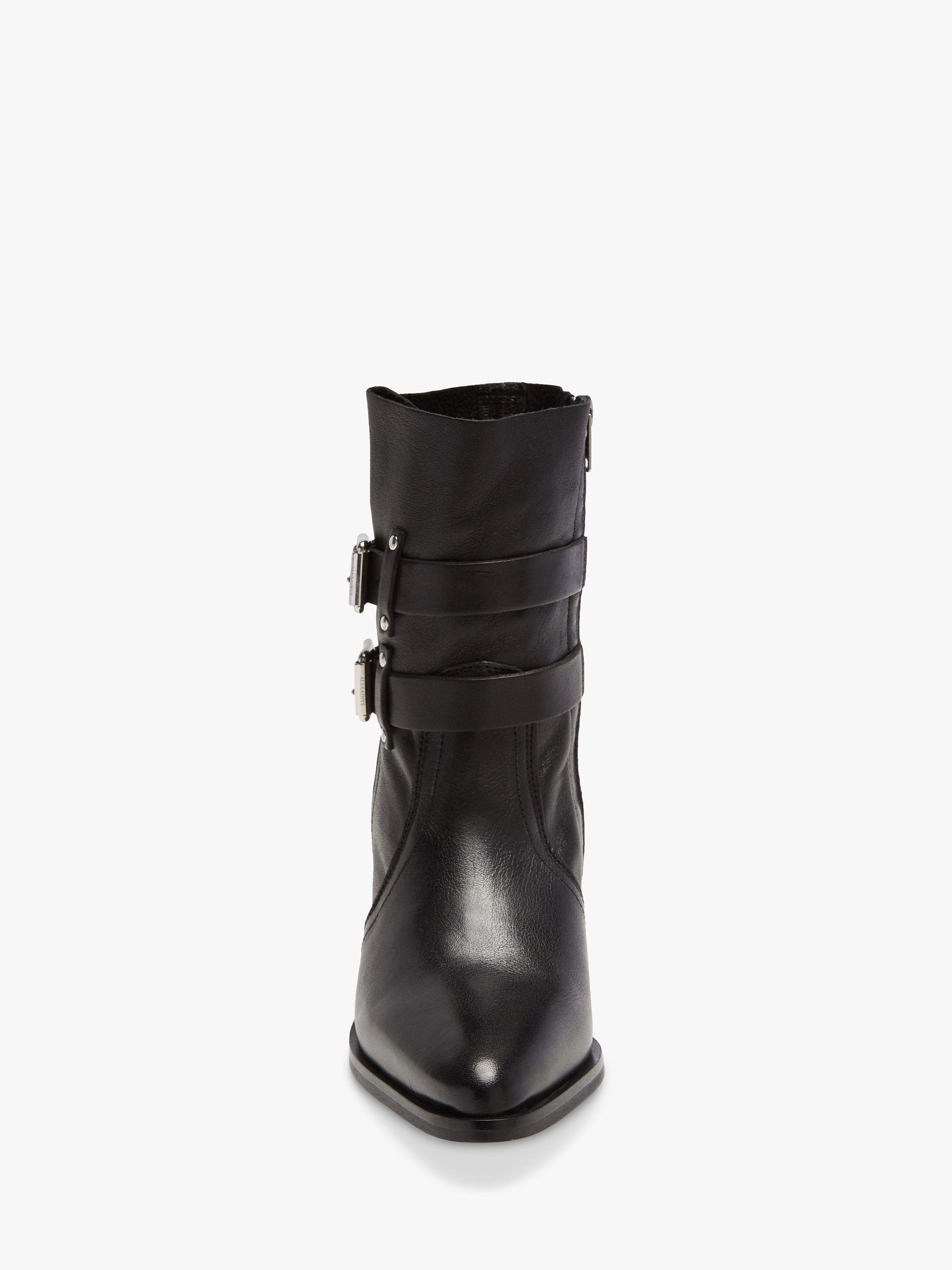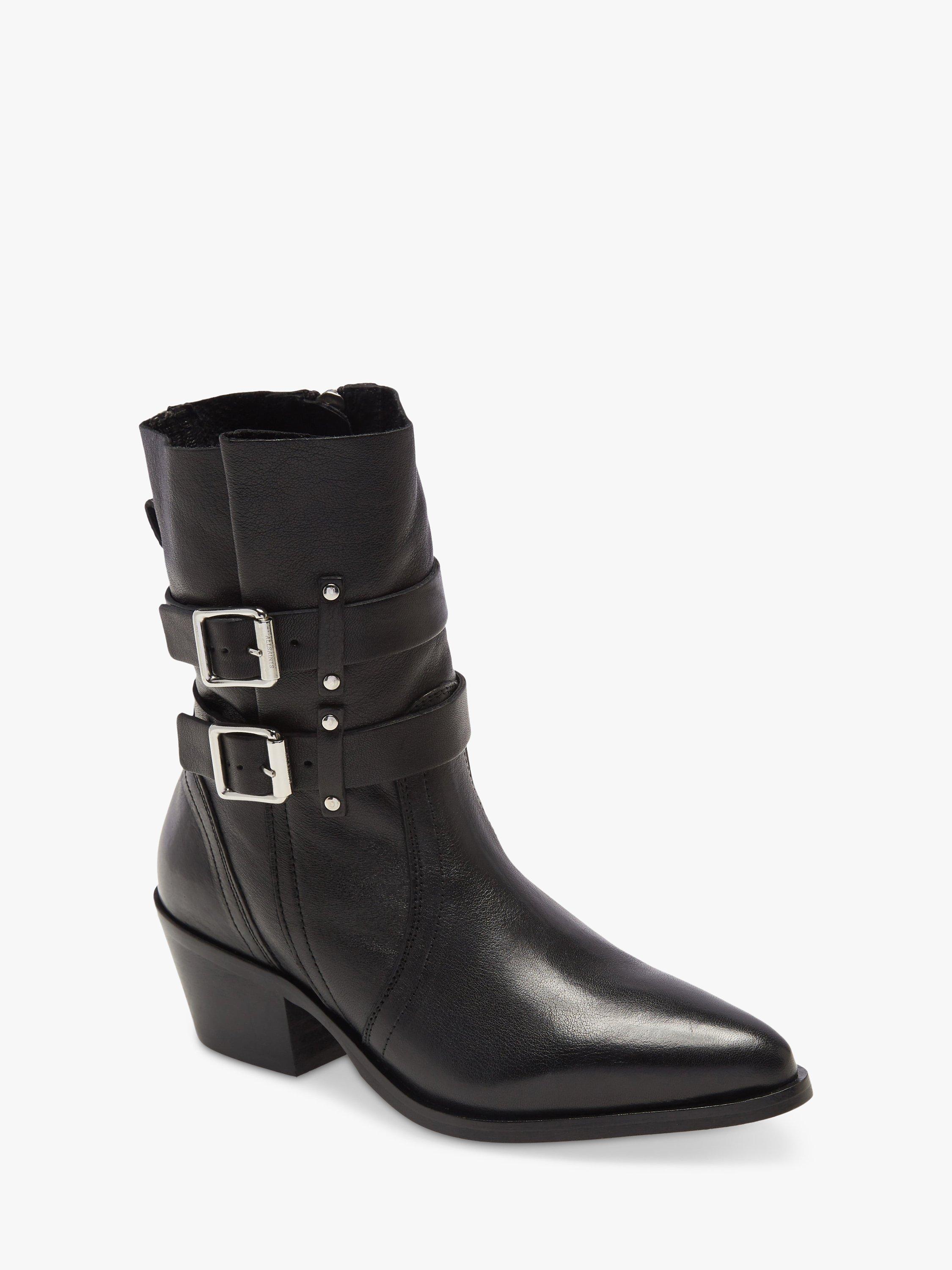 An edgy way to add some cool appeal to your looks with these leather boots from AllSaints. Featuring a sharp, pointed toe, and buckle detail on the outside.