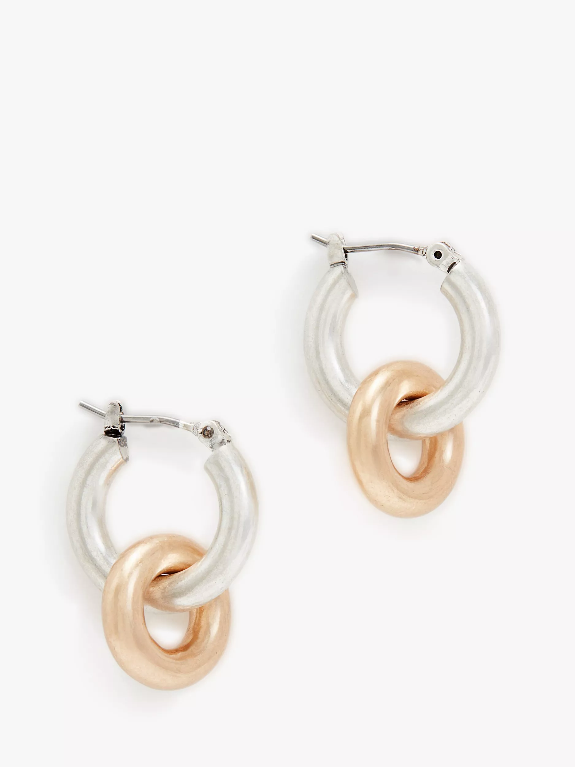 These sleek huggie hoops are adorned with smaller dangling rings in a neutral two-tone effect that are perfect for every day. The earrings have click-top closures that are for pierced ears only.