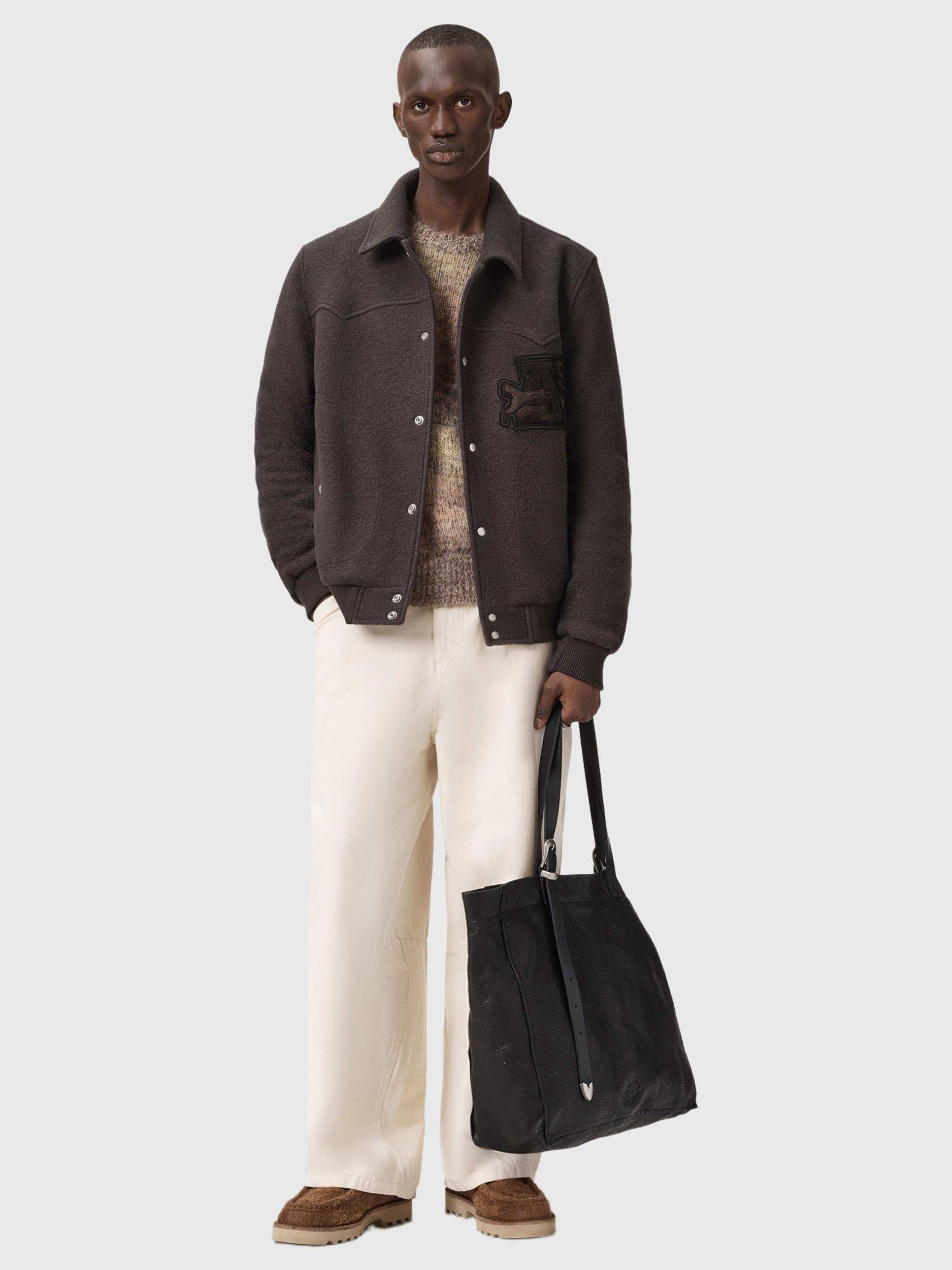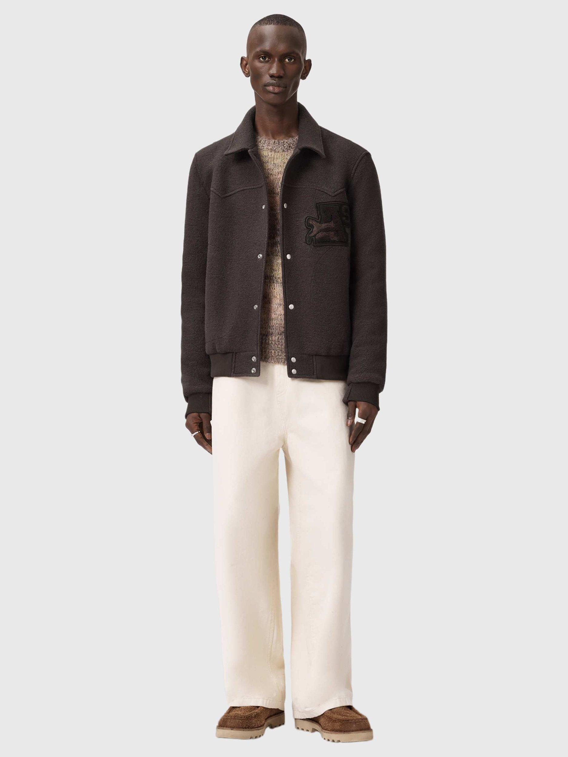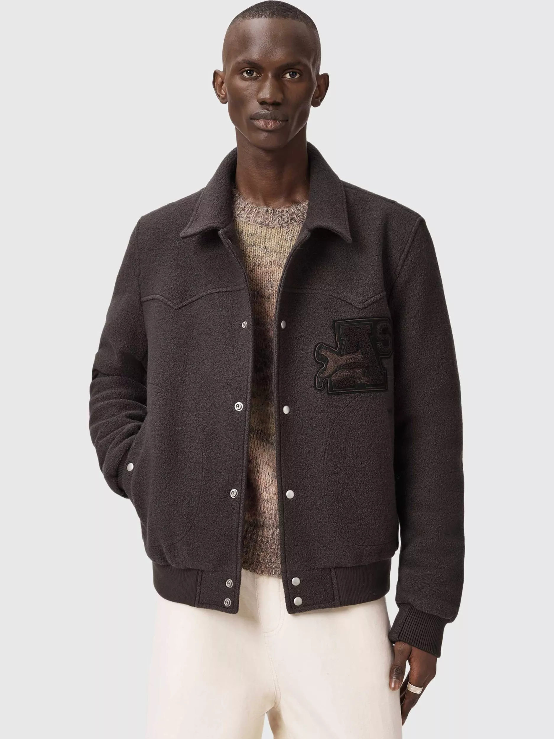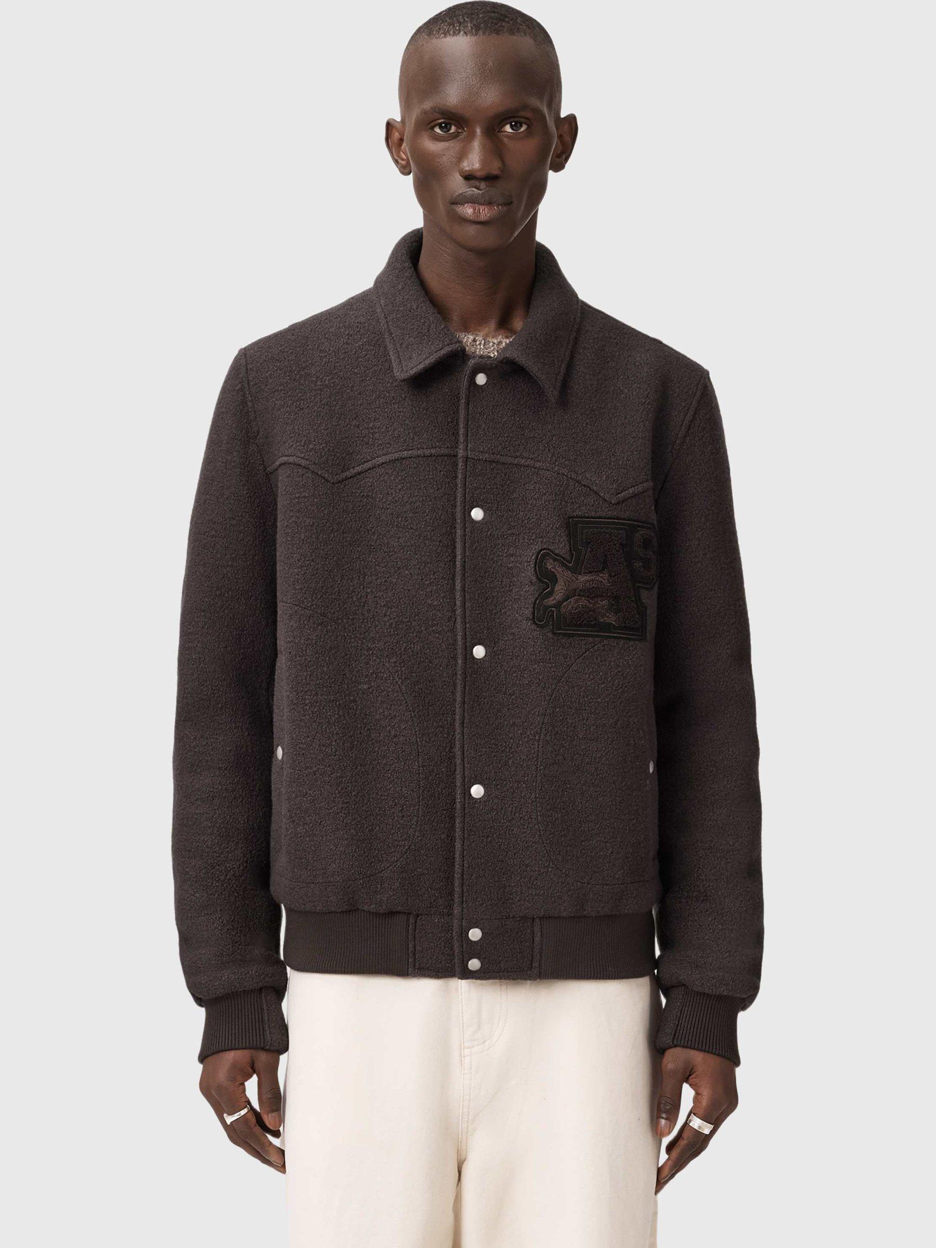AllSaints' relaxed fit jacket. Crafted in pure wool with a full lining, collar neck and logo detailing, it brings warmth and ease to any plan. Finished with quick press stud fastenings.
