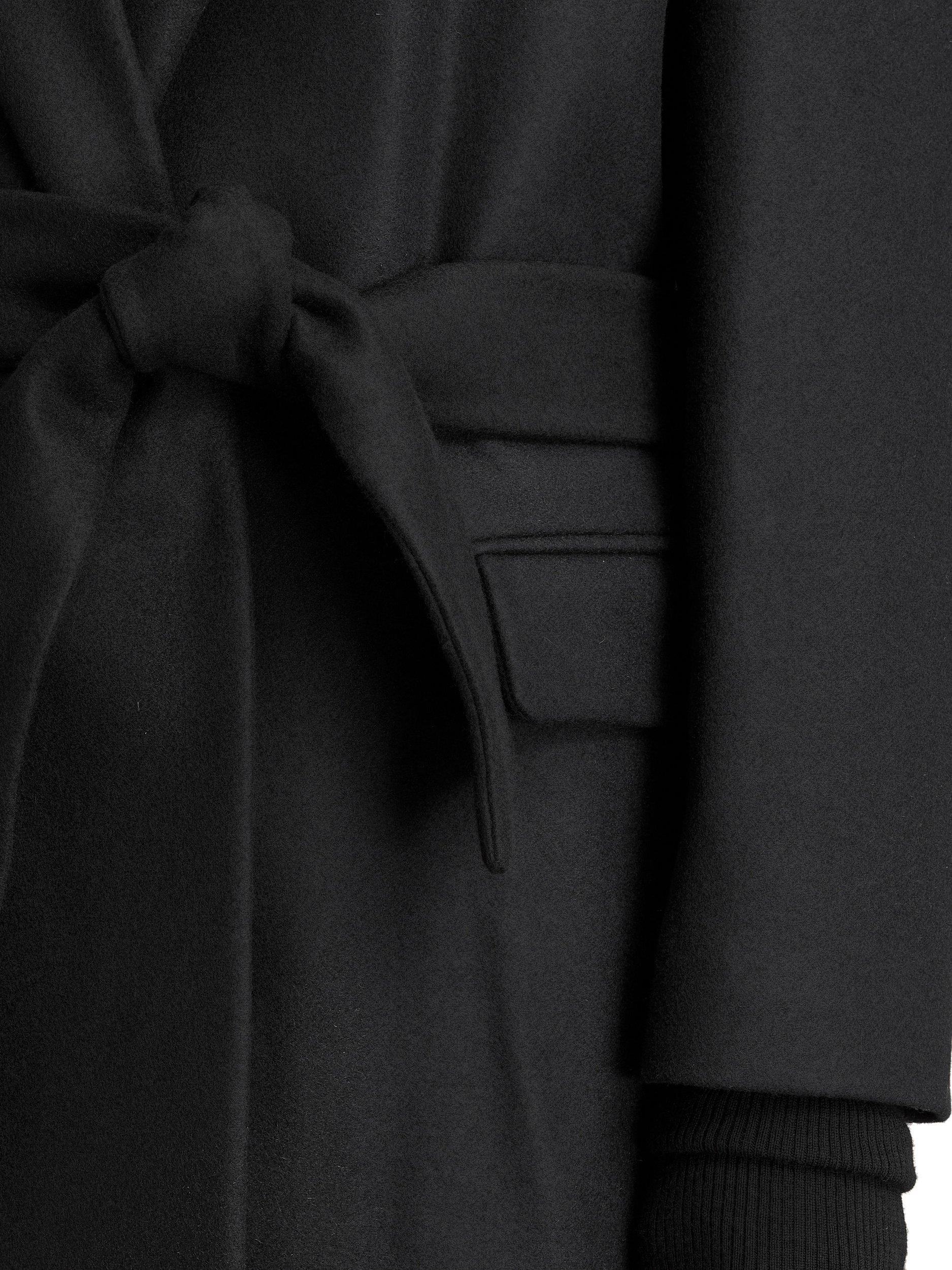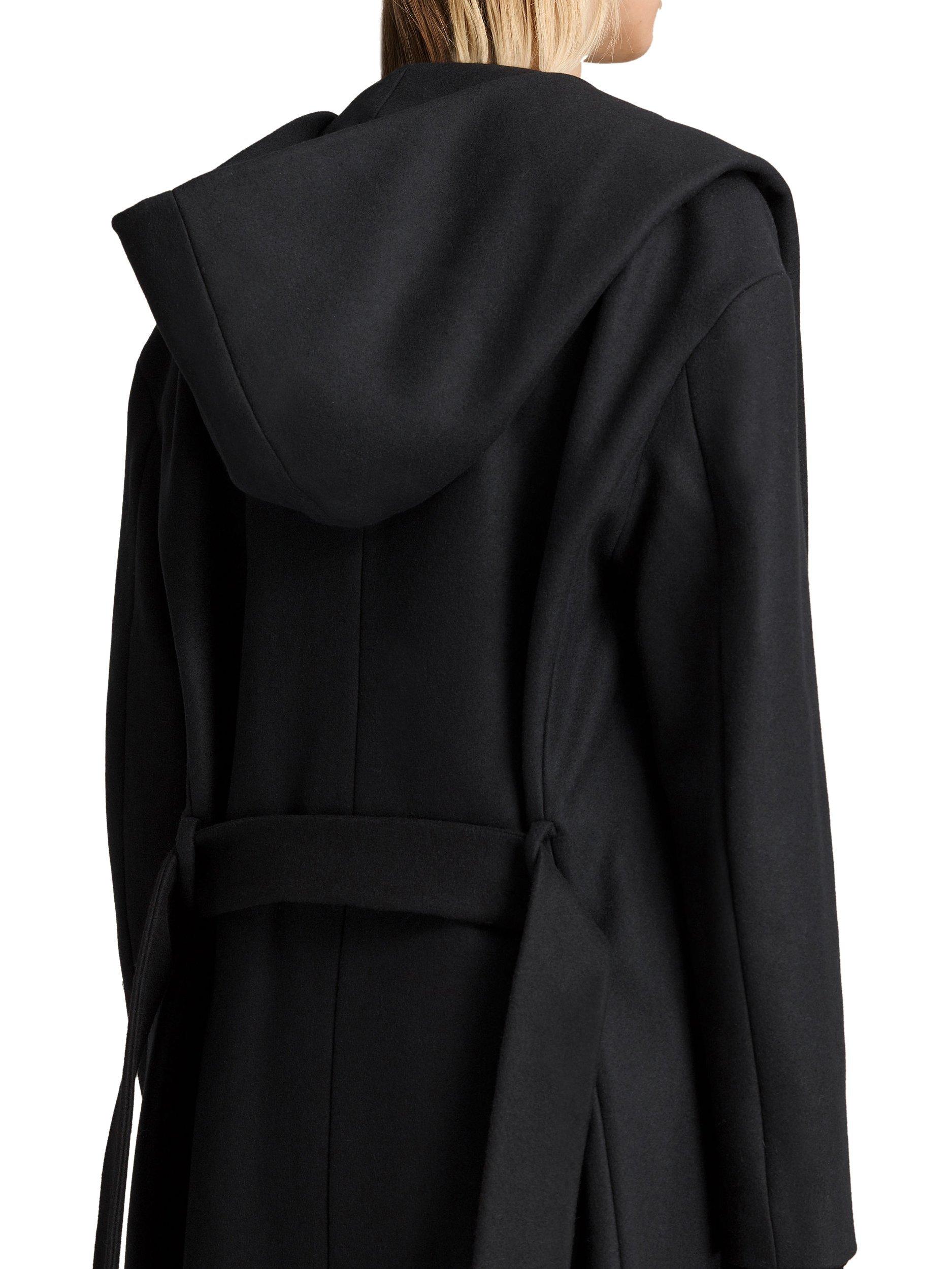 Expertly crafted from a wool mix blend with an oversized draped hood, classic flap pockets and a tie belt to cinch your waist. This fully lined style is completed with a concealed front button fastening.