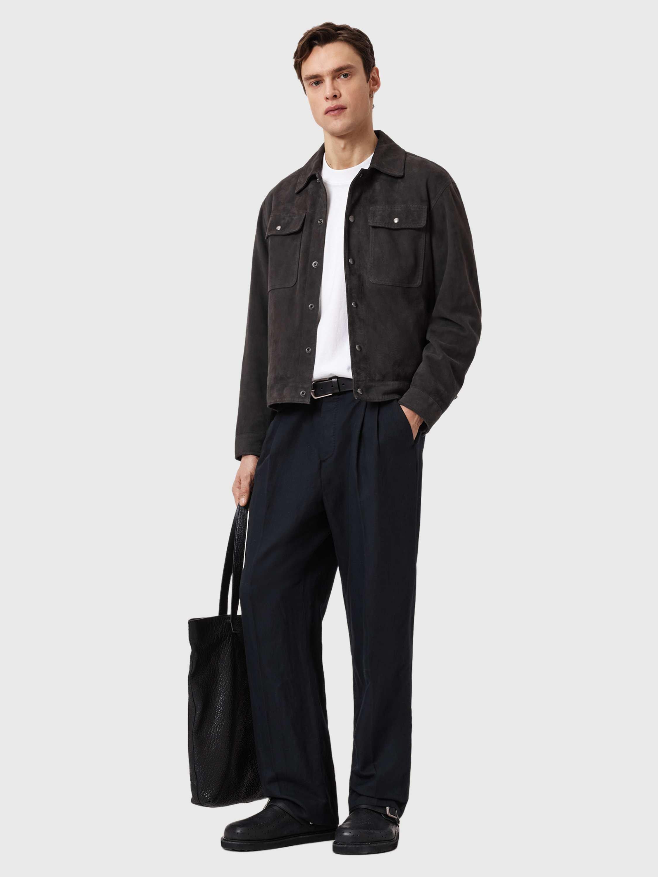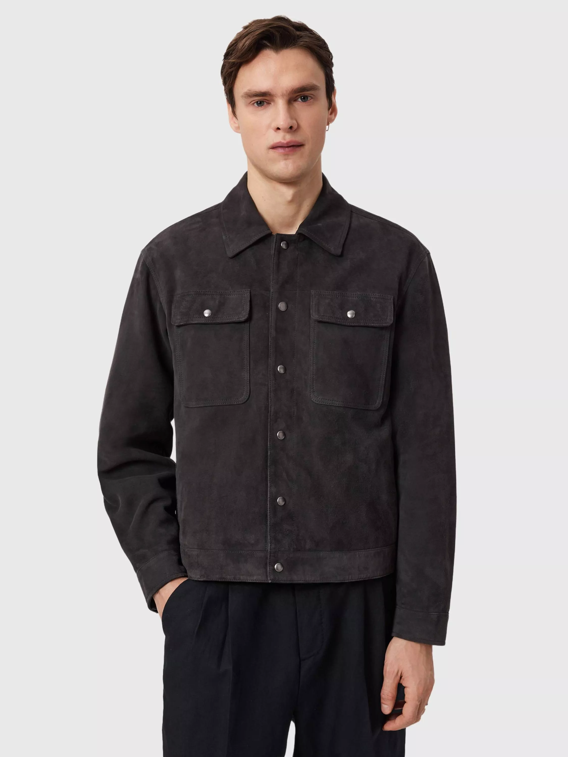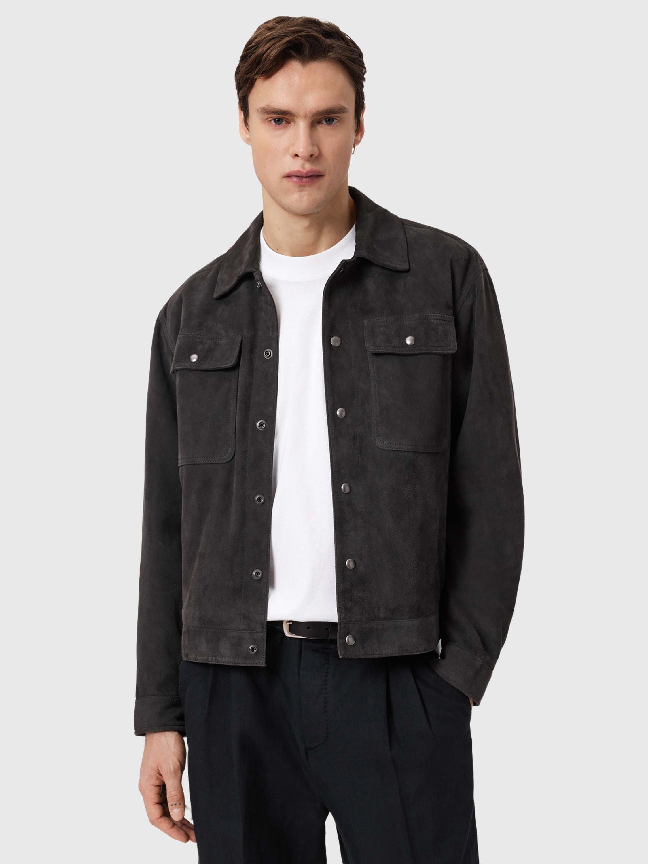 A washed suede leather jacket from AllSaints. Designed for comfortable layering and everyday wear with a full lining, it brings fresh character to your look while offering practical warmth and style.