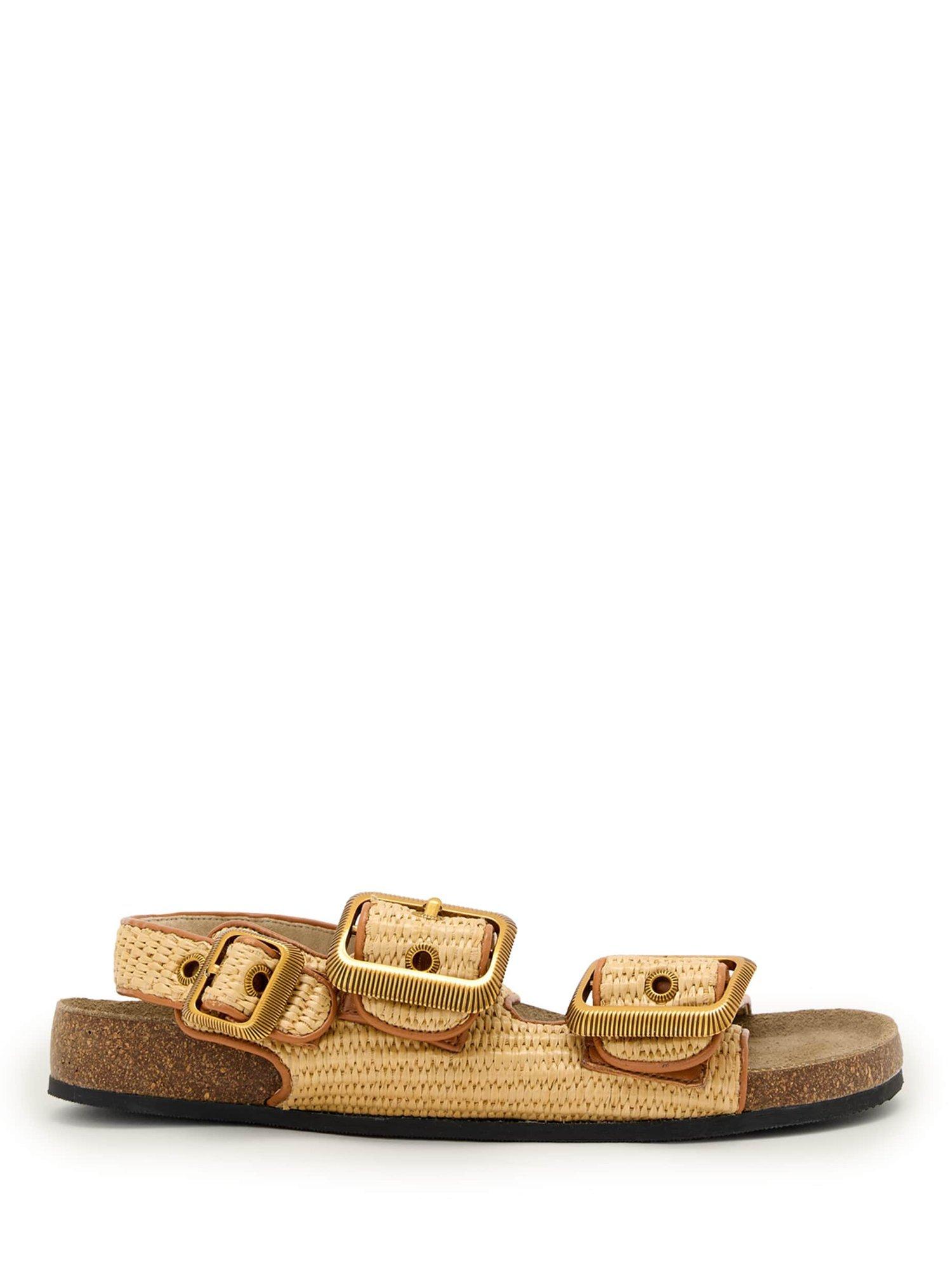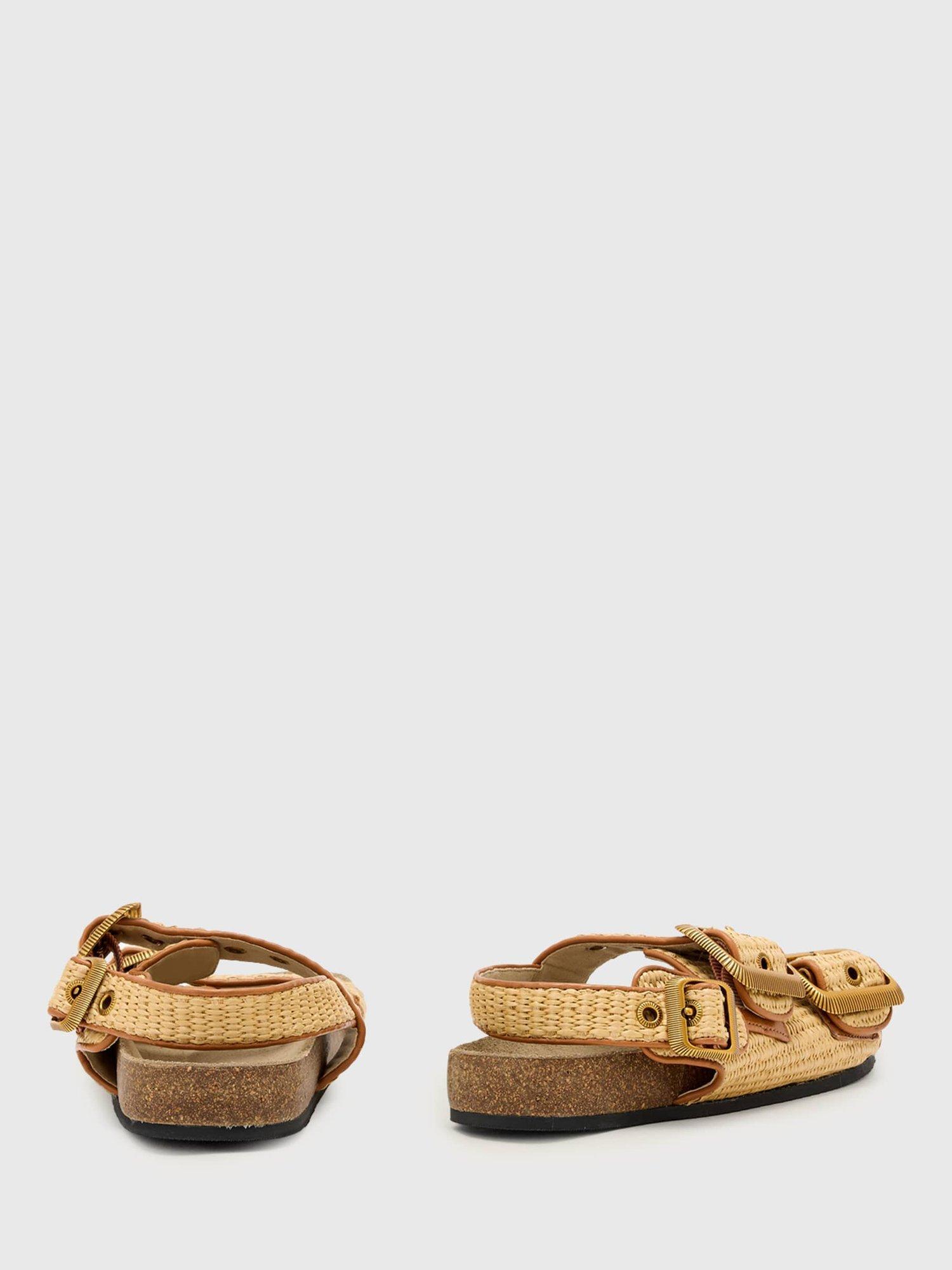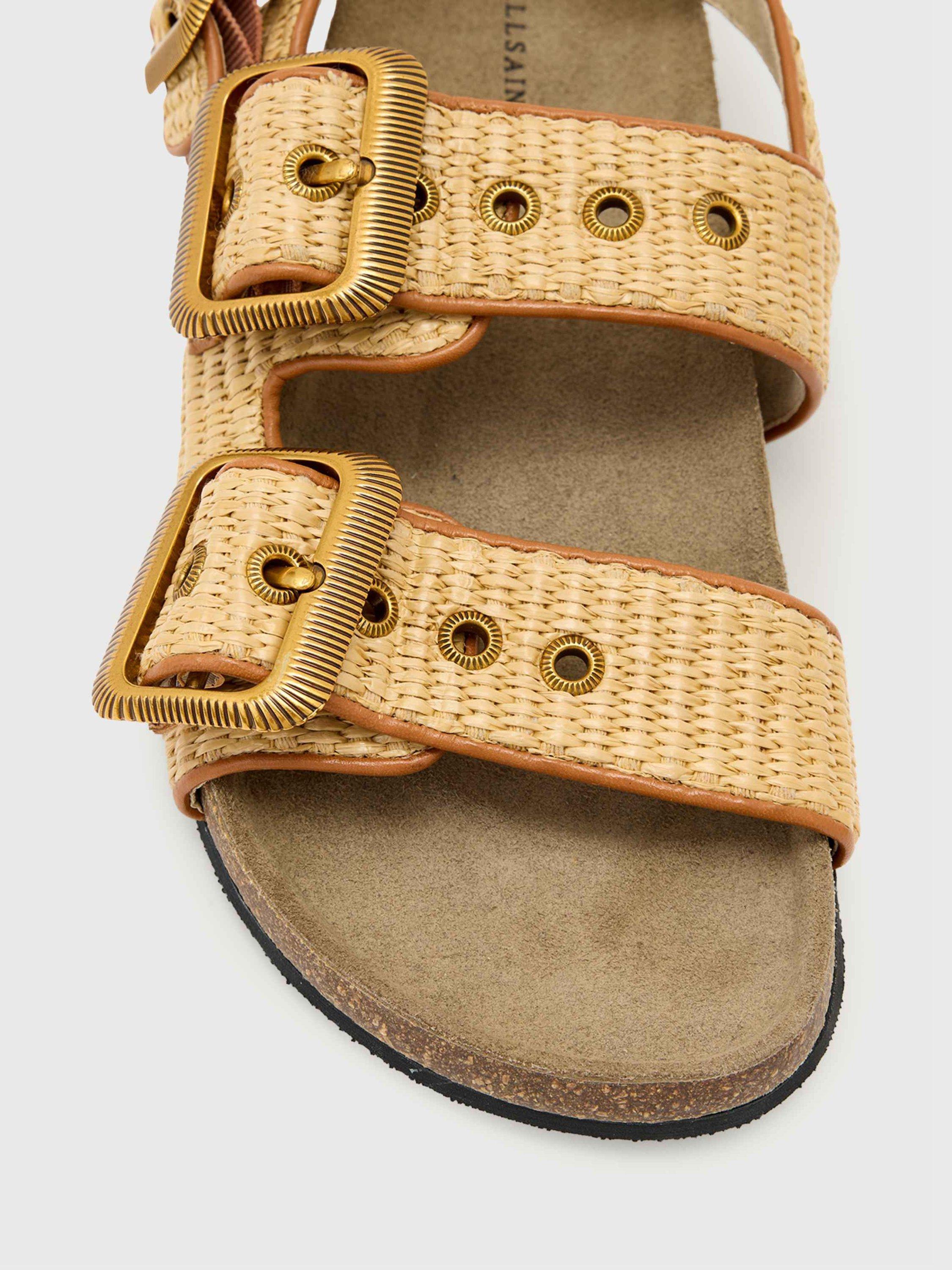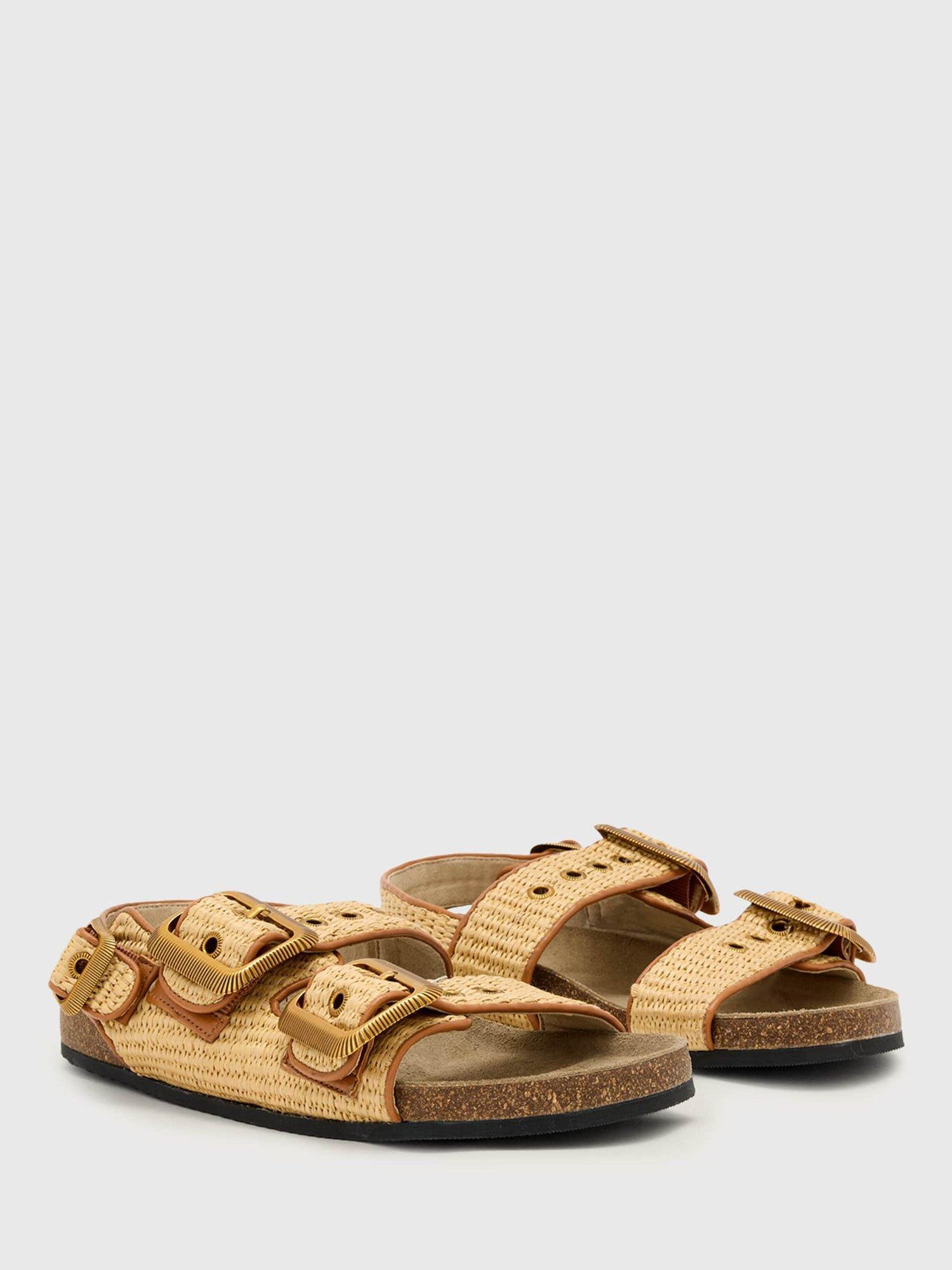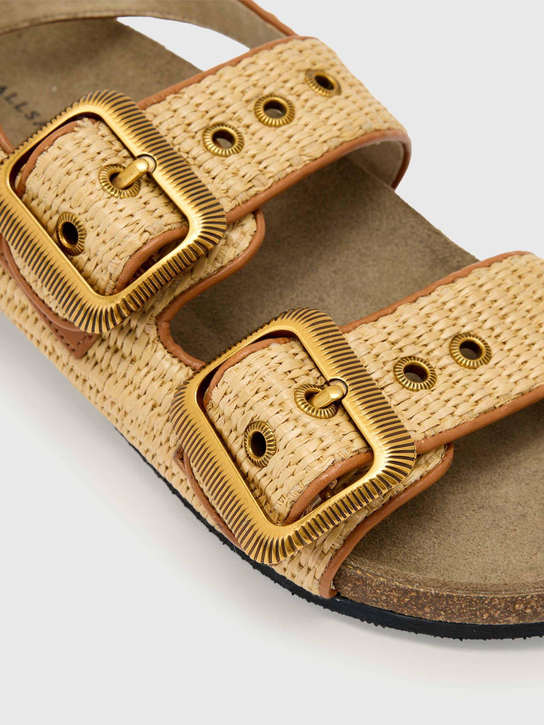 Three strap sandals with western buckles and eyelets, featuring a natural cork footbed with raffia upper and leather binding.