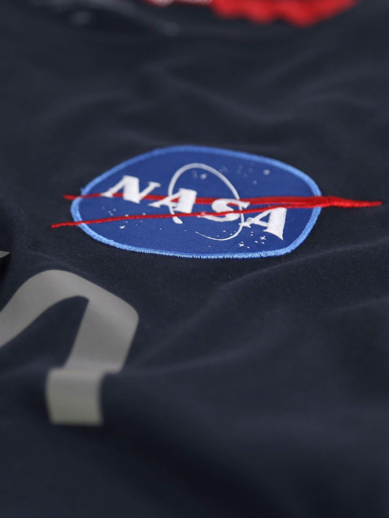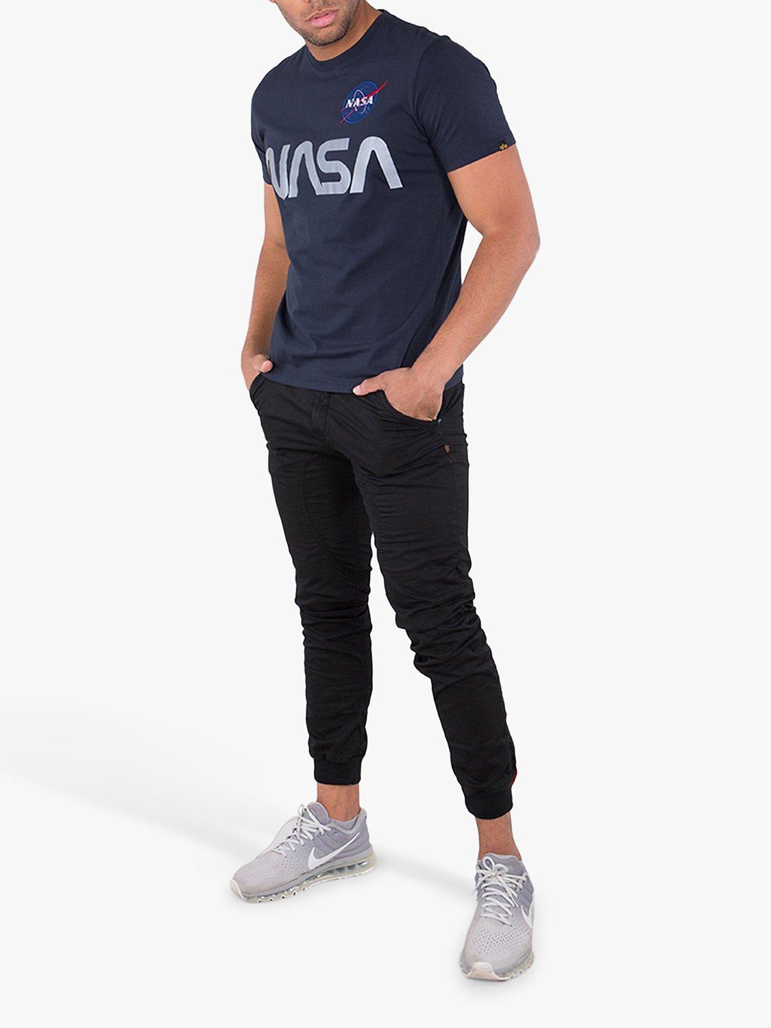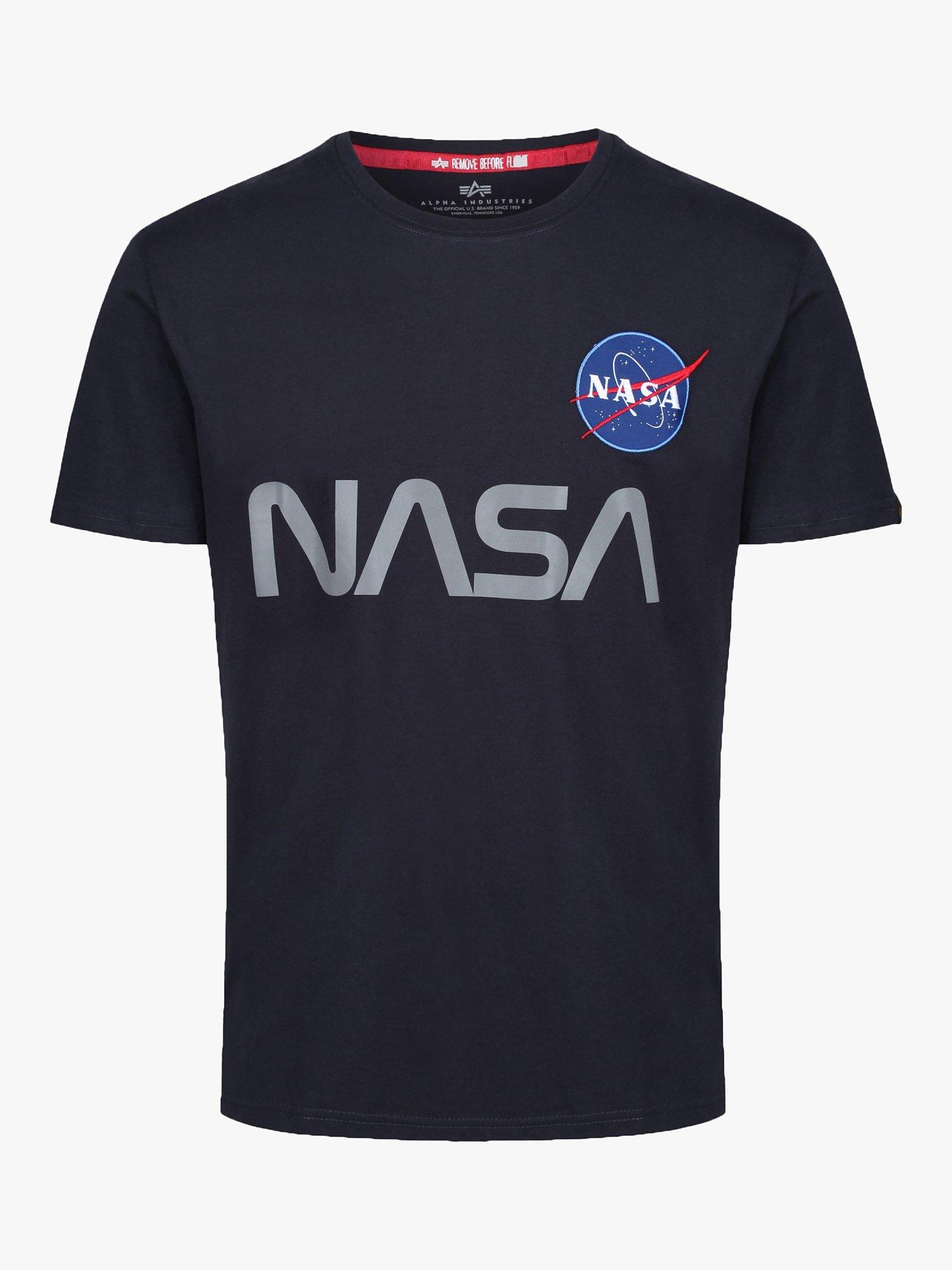 Alpha Industries X NASA collaboration Mens designer short sleeve crew neck t-shirt with NASA patch on chest and reflective NASA print on chest.