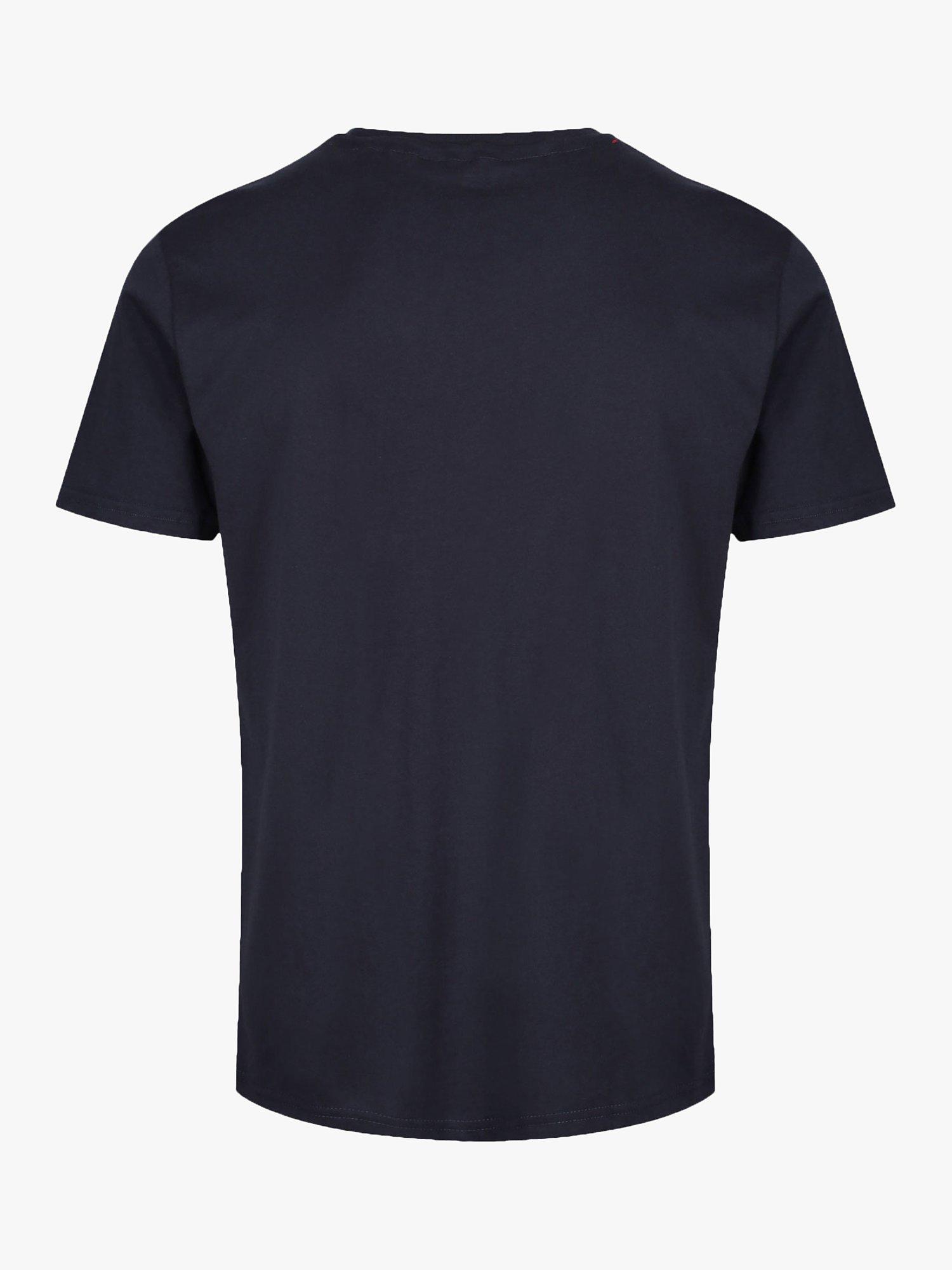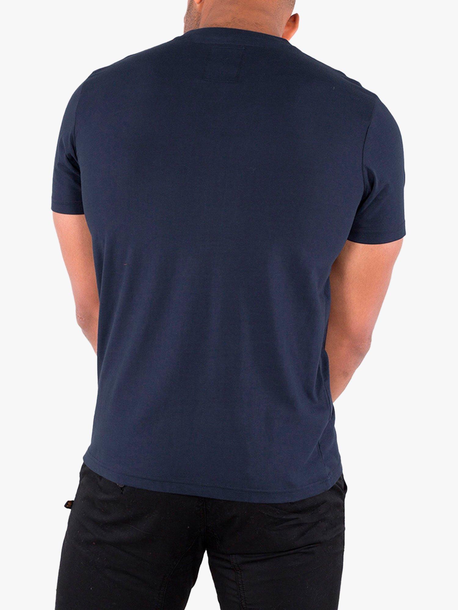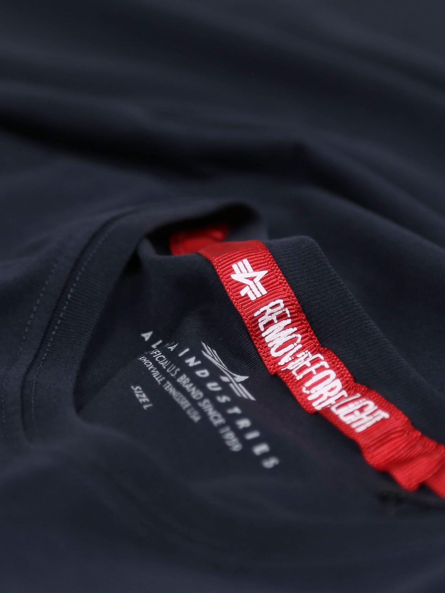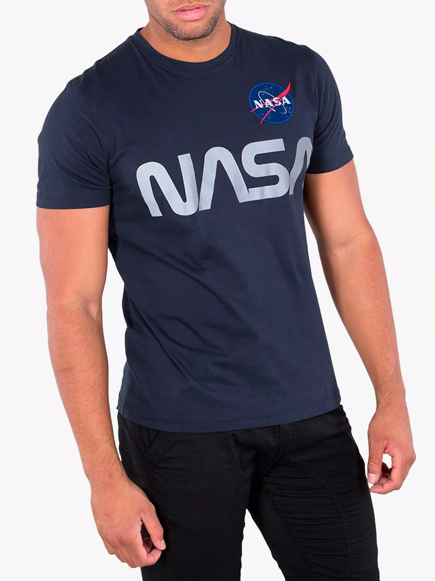 Alpha Industries X NASA collaboration Mens designer short sleeve crew neck t-shirt with NASA patch on chest and reflective NASA print on chest.