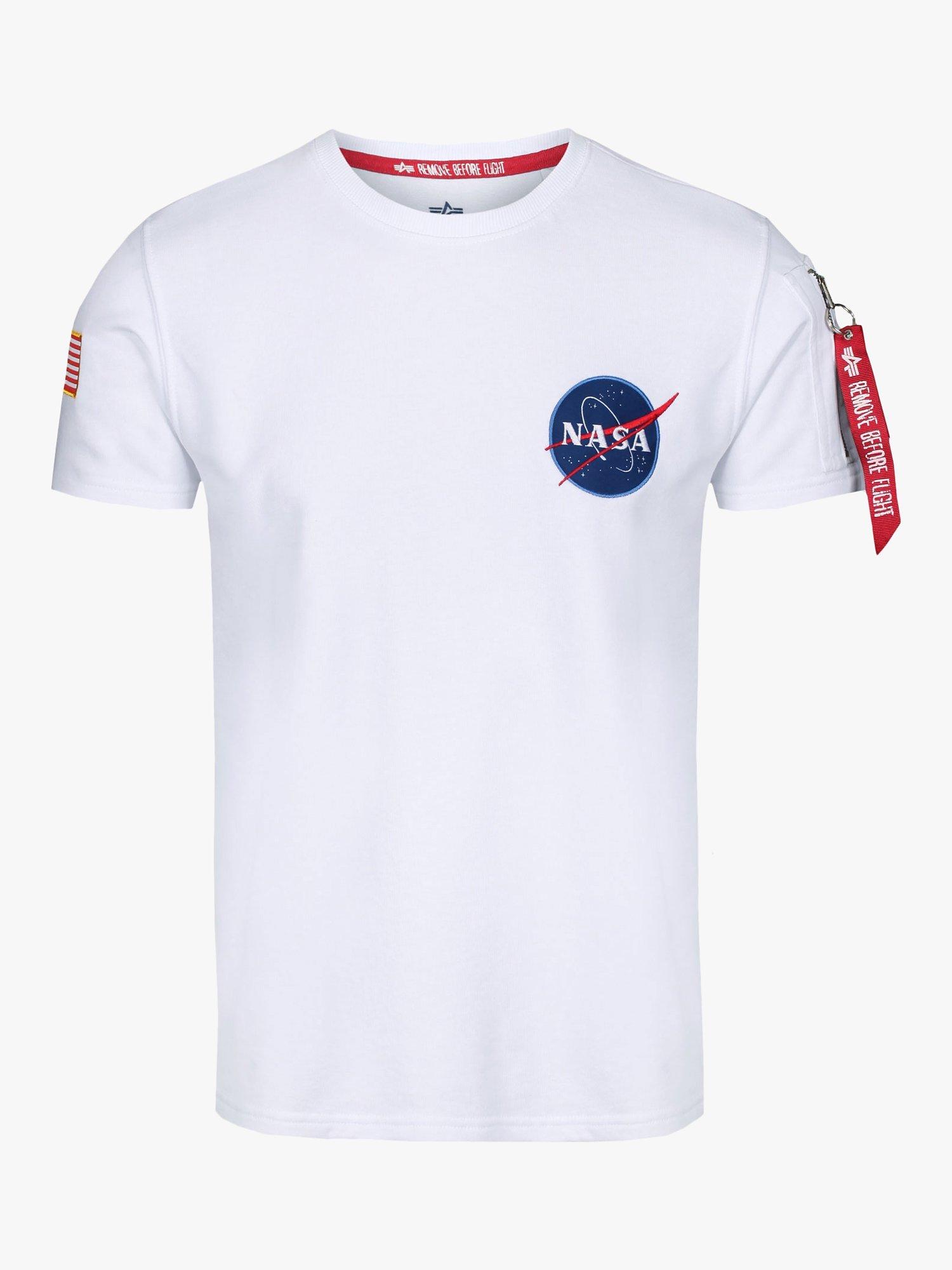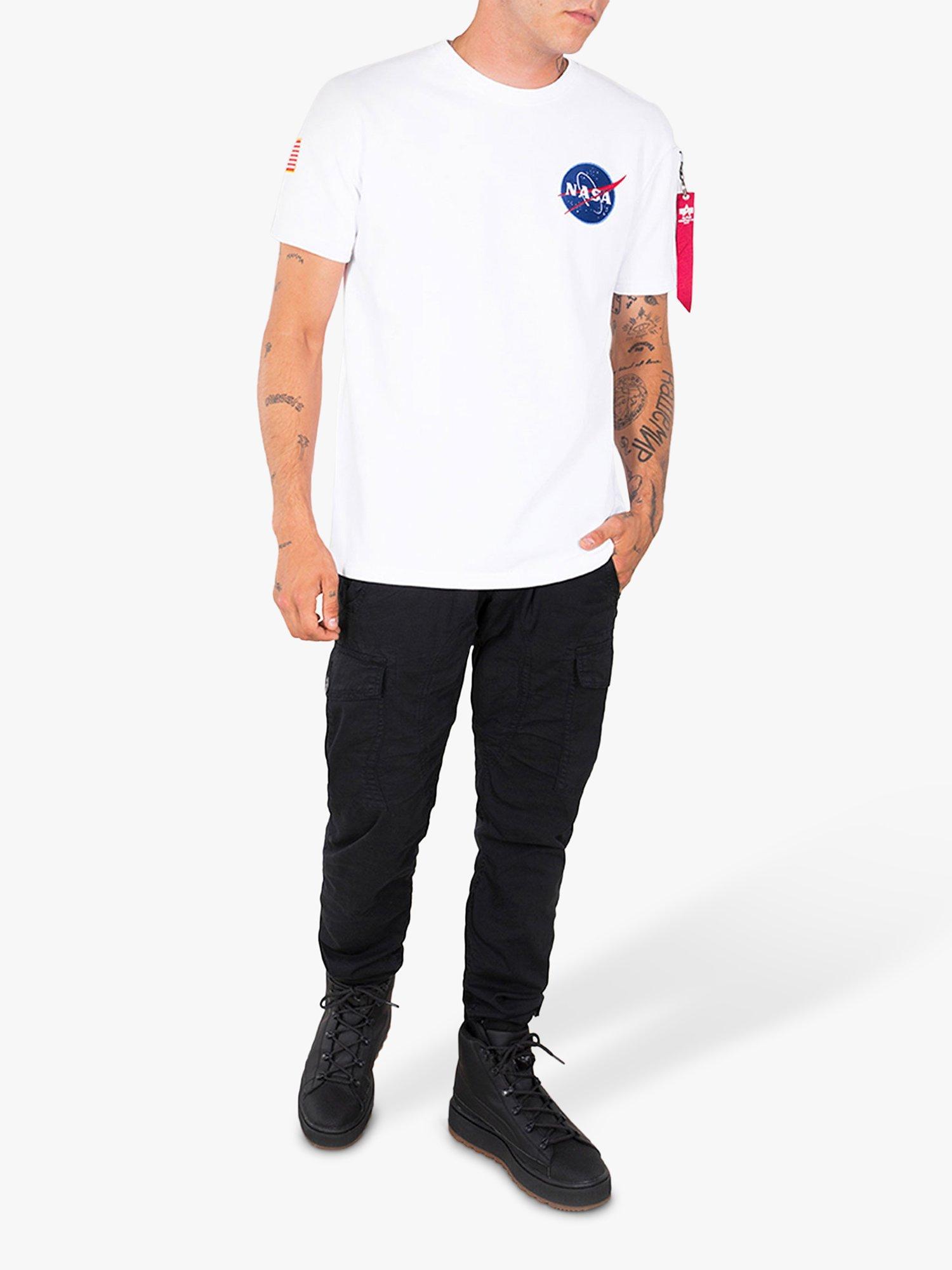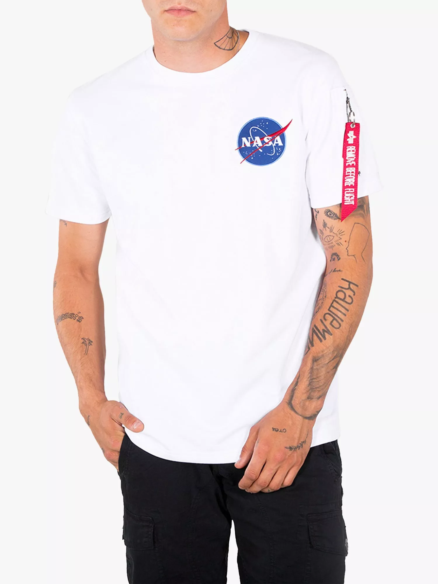 Alpha Industries X NASA collaboration Mens designer short sleeve crew neck t-shirt with NASA patch on chest and reflective NASA print on chest.