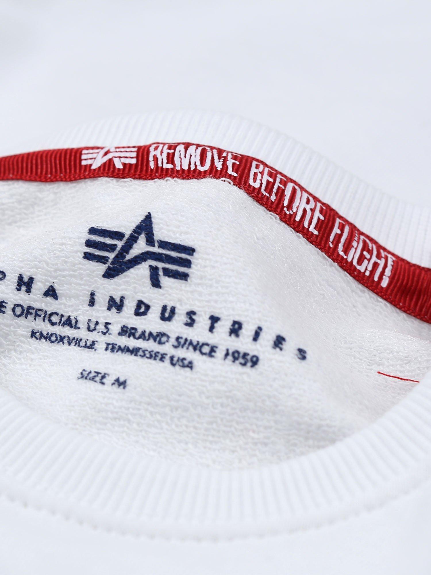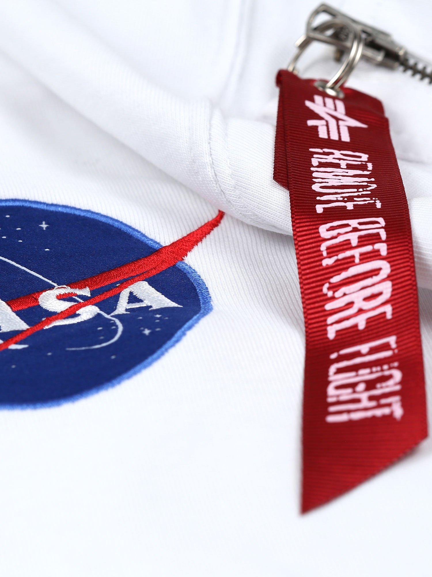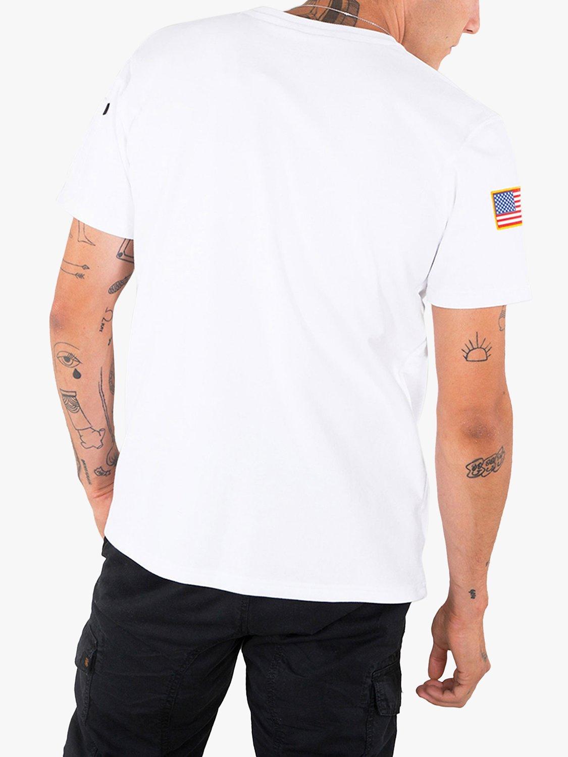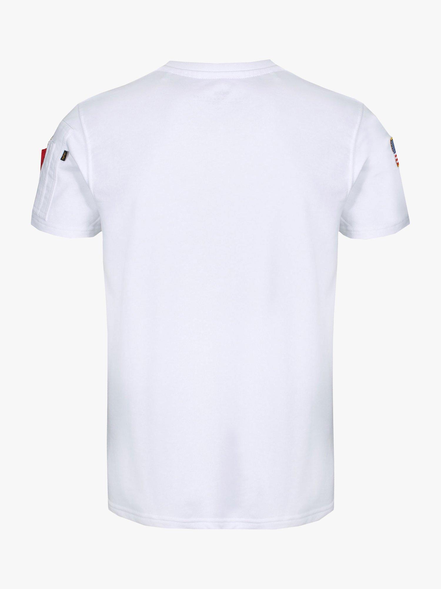 Alpha Industries X NASA collaboration Mens designer short sleeve crew neck t-shirt with NASA patch on chest and reflective NASA print on chest.