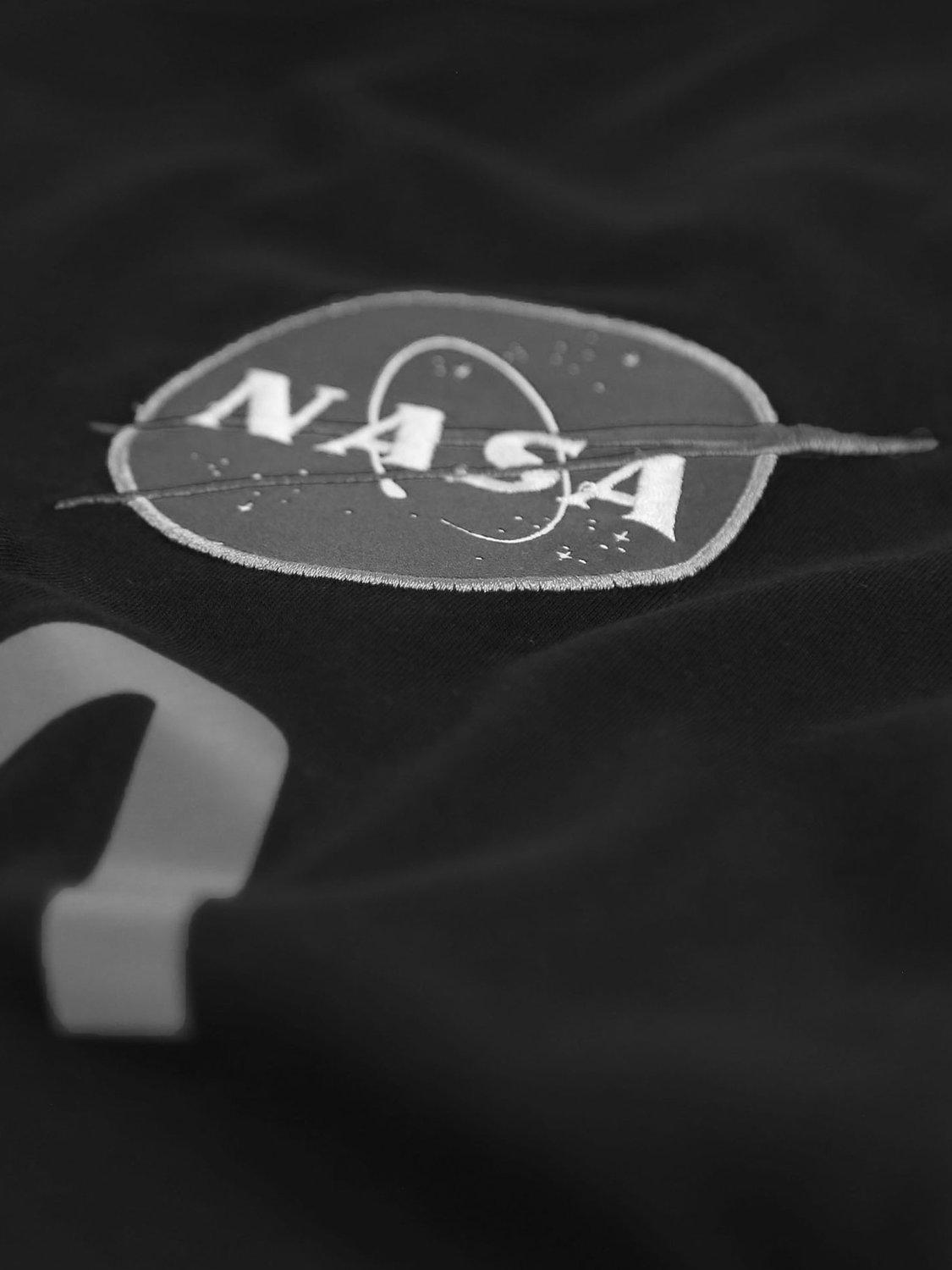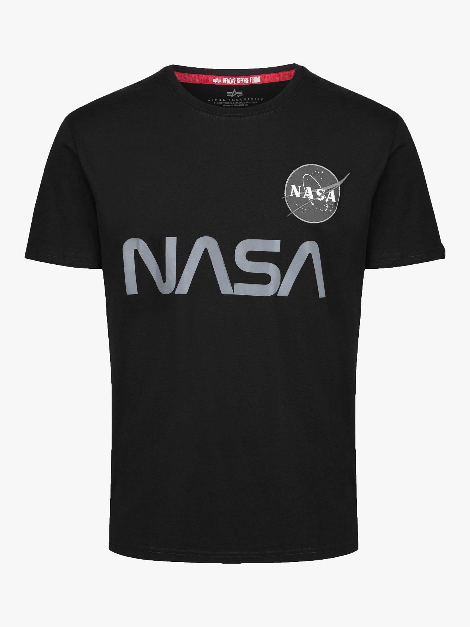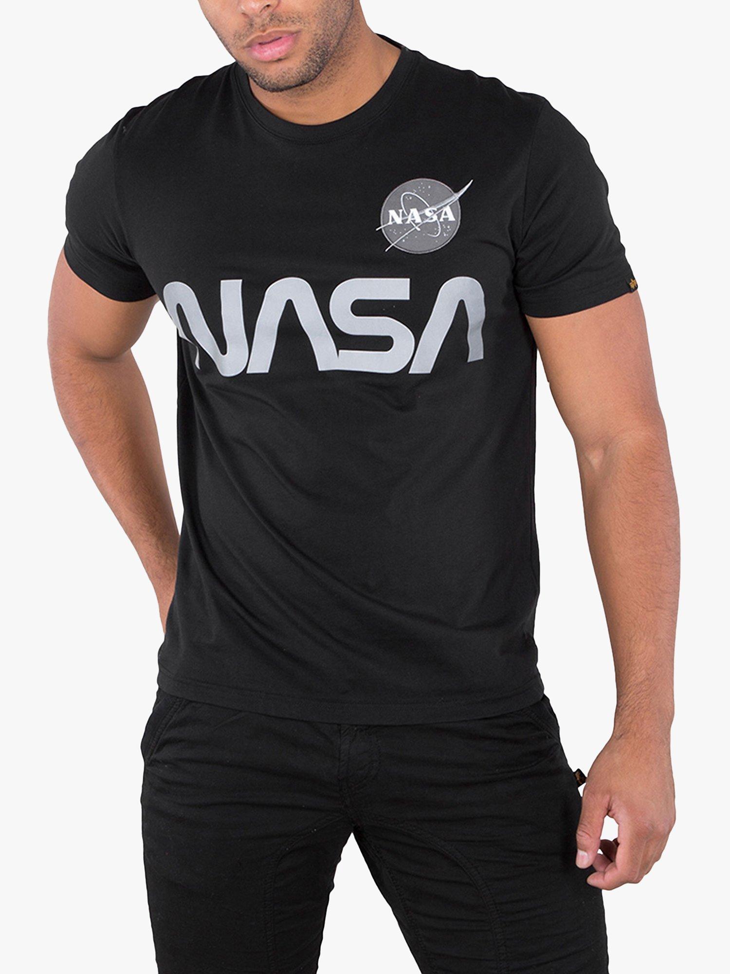 Alpha Industries X NASA collaboration Mens designer short sleeve crew neck t-shirt with NASA patch on chest and reflective NASA print on chest.