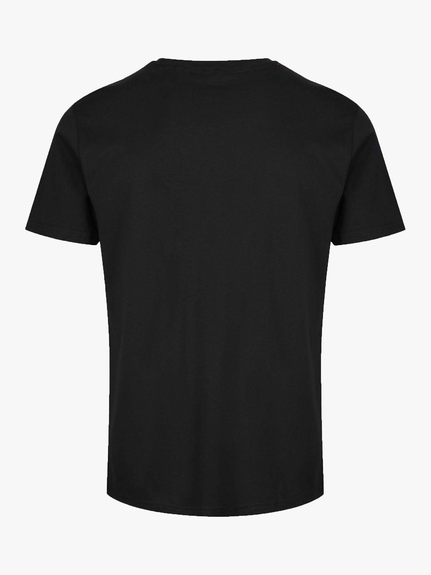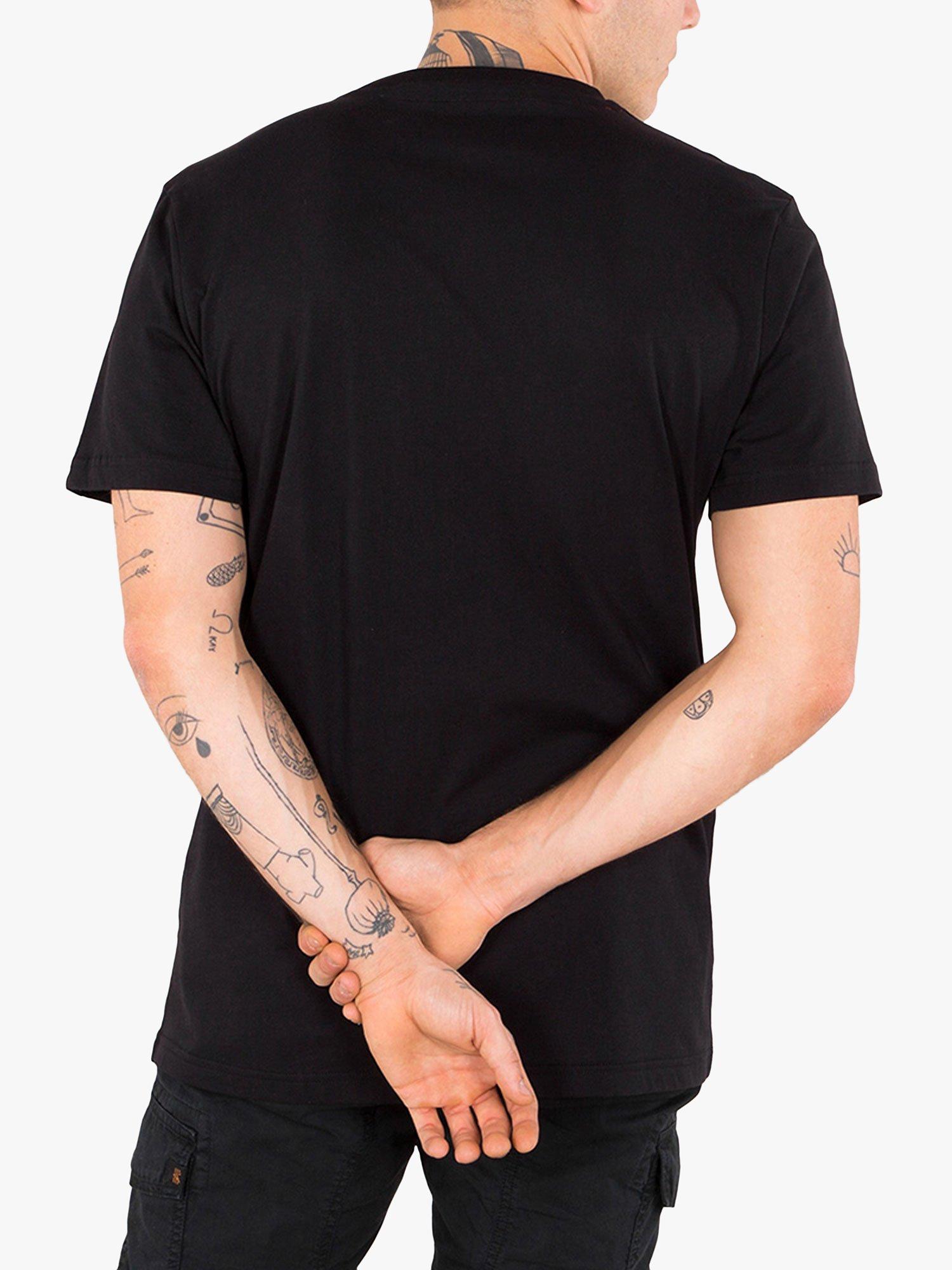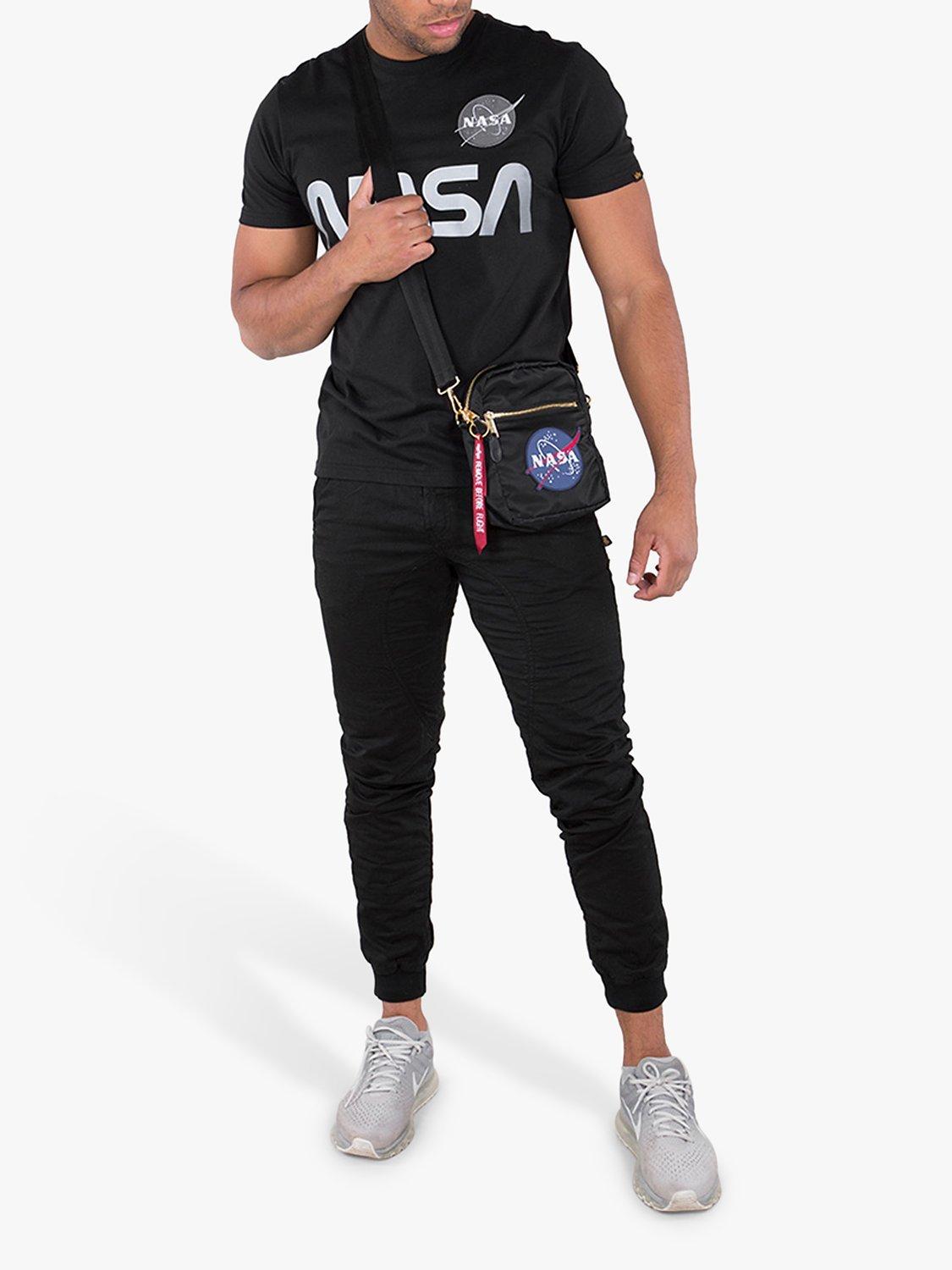 Alpha Industries X NASA collaboration Mens designer short sleeve crew neck t-shirt with NASA patch on chest and reflective NASA print on chest.