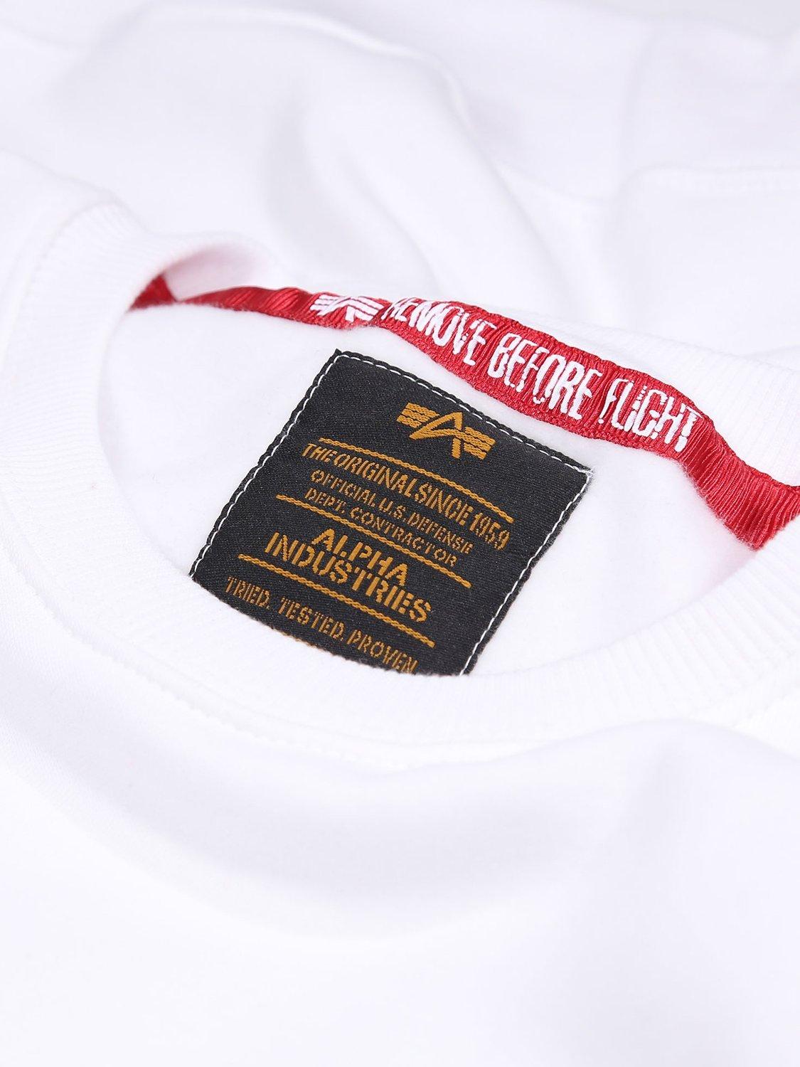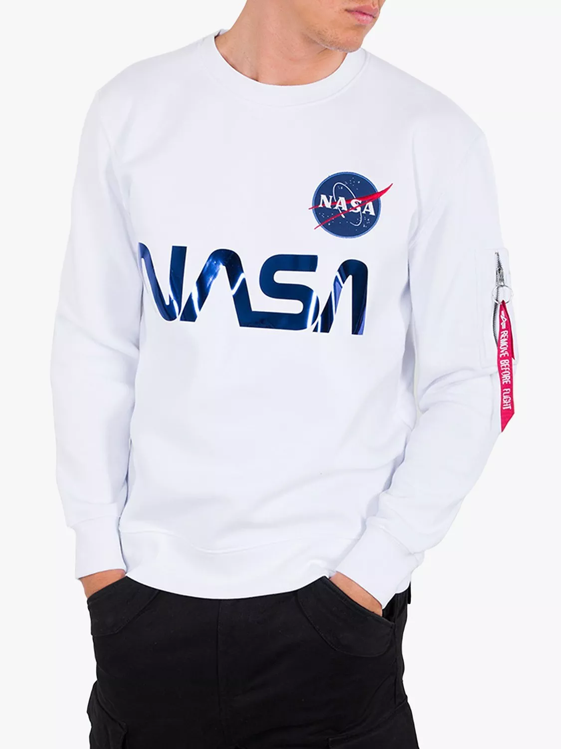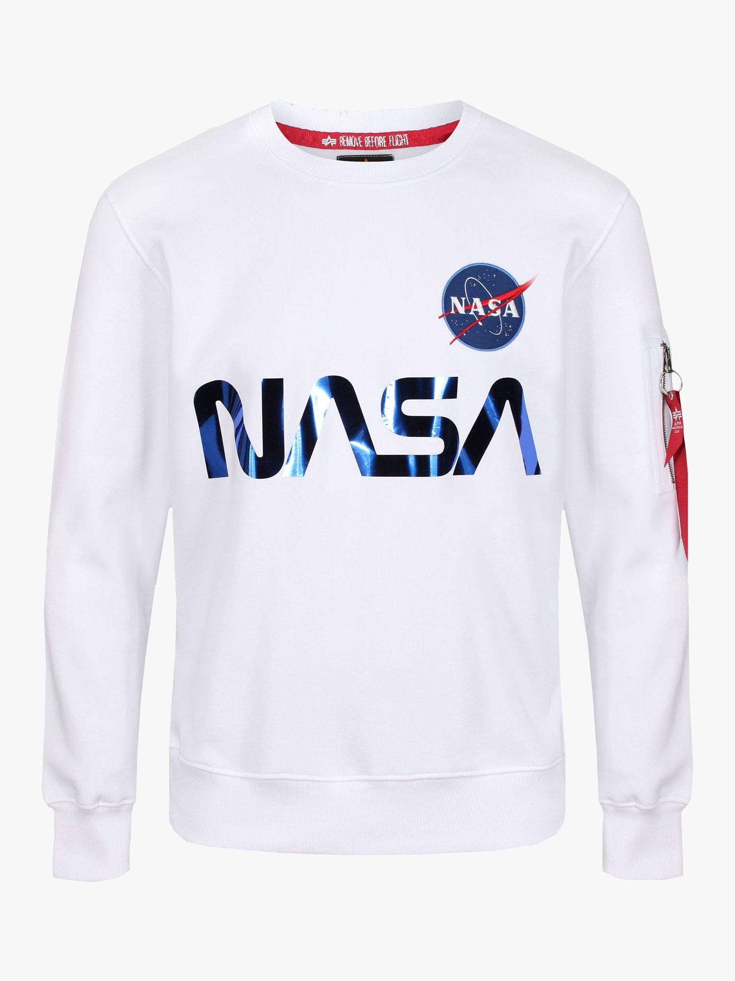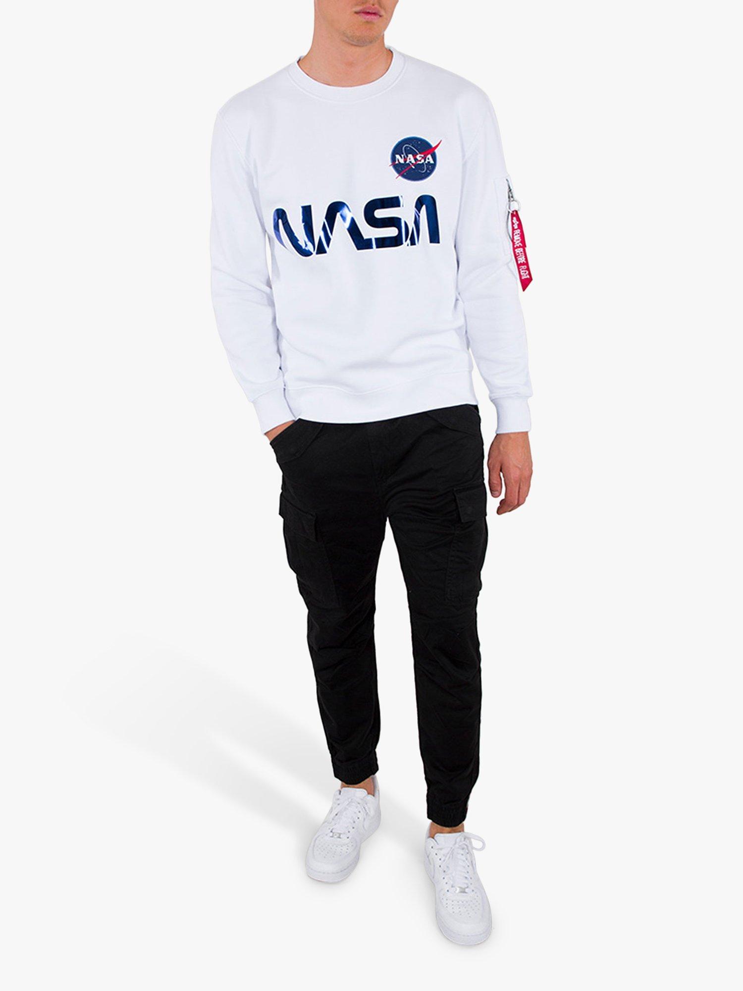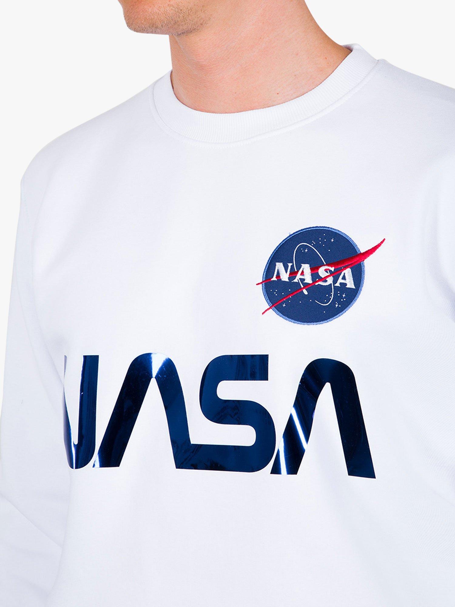 Alpha Industries X NASA collaboration Mens designer short sleeve crew neck t-shirt with NASA patch on chest and reflective NASA print on chest.