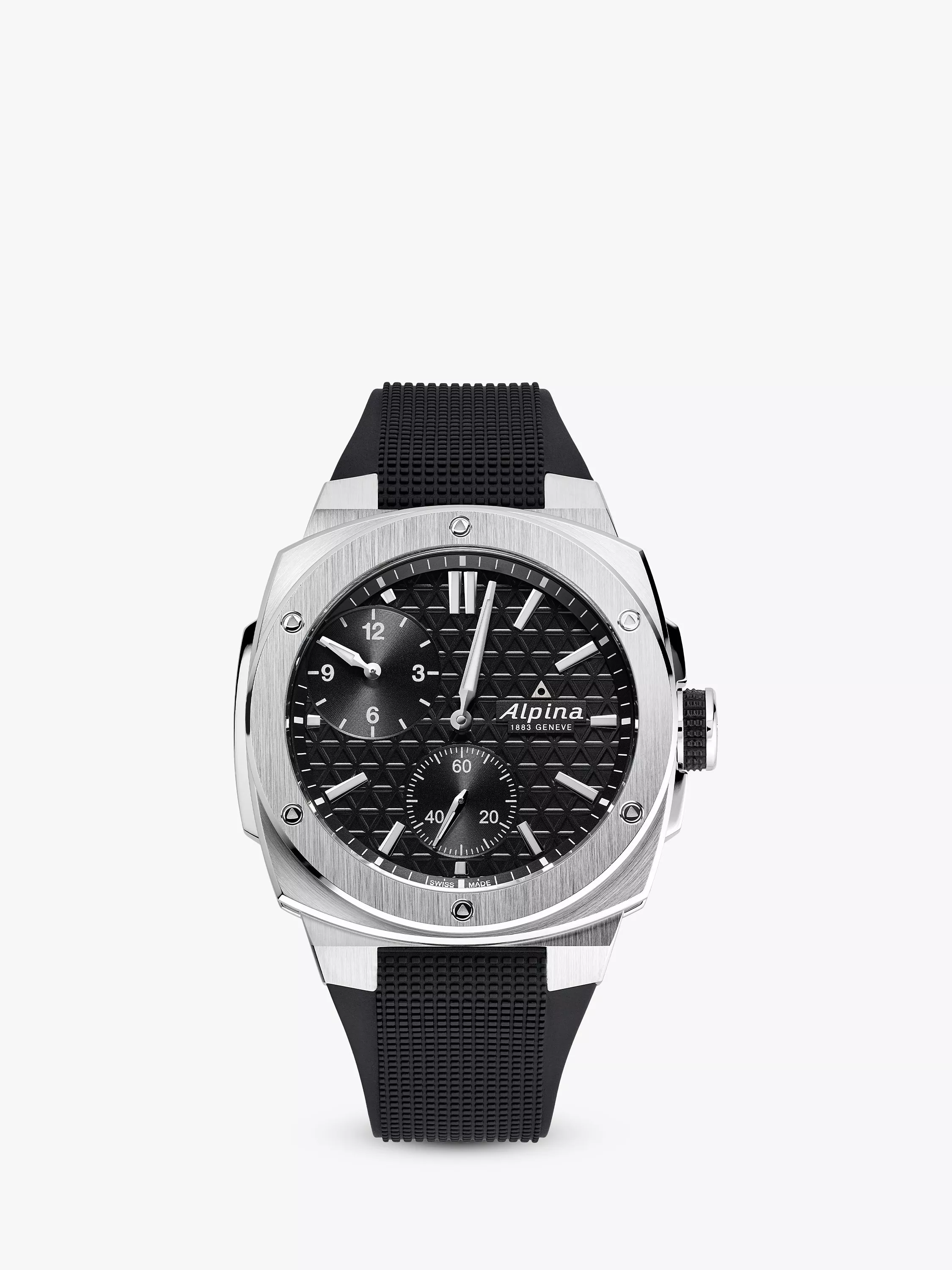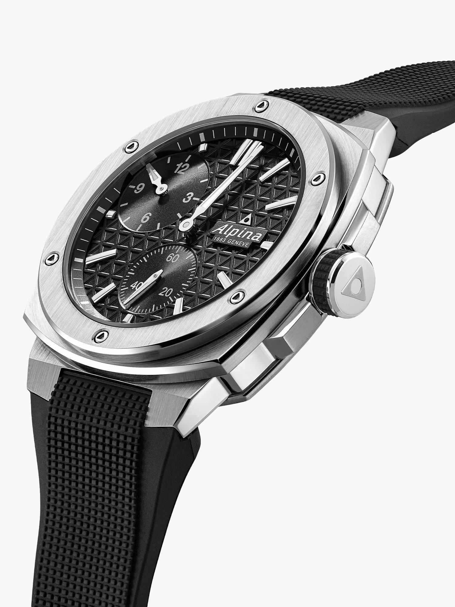 The Alpiner Extreme Automatic Regulator is the perfect rugged sports watch. It has a separate display of the hours, minutes and seconds, set inside a heavy-duty 41 x 42.5mm case with a see-through back, and can withstand extreme conditions. The black dial has a triangle pattern and, a black outer ring with silver-tone markers. There is a black hour counter at 10 o'clock, hand-polished silver colour hour and minute hands as well as a black second counter at 6 o'clock. The dial is secured with a black rubber strap and the timepiece is water-resistant up to 200m.