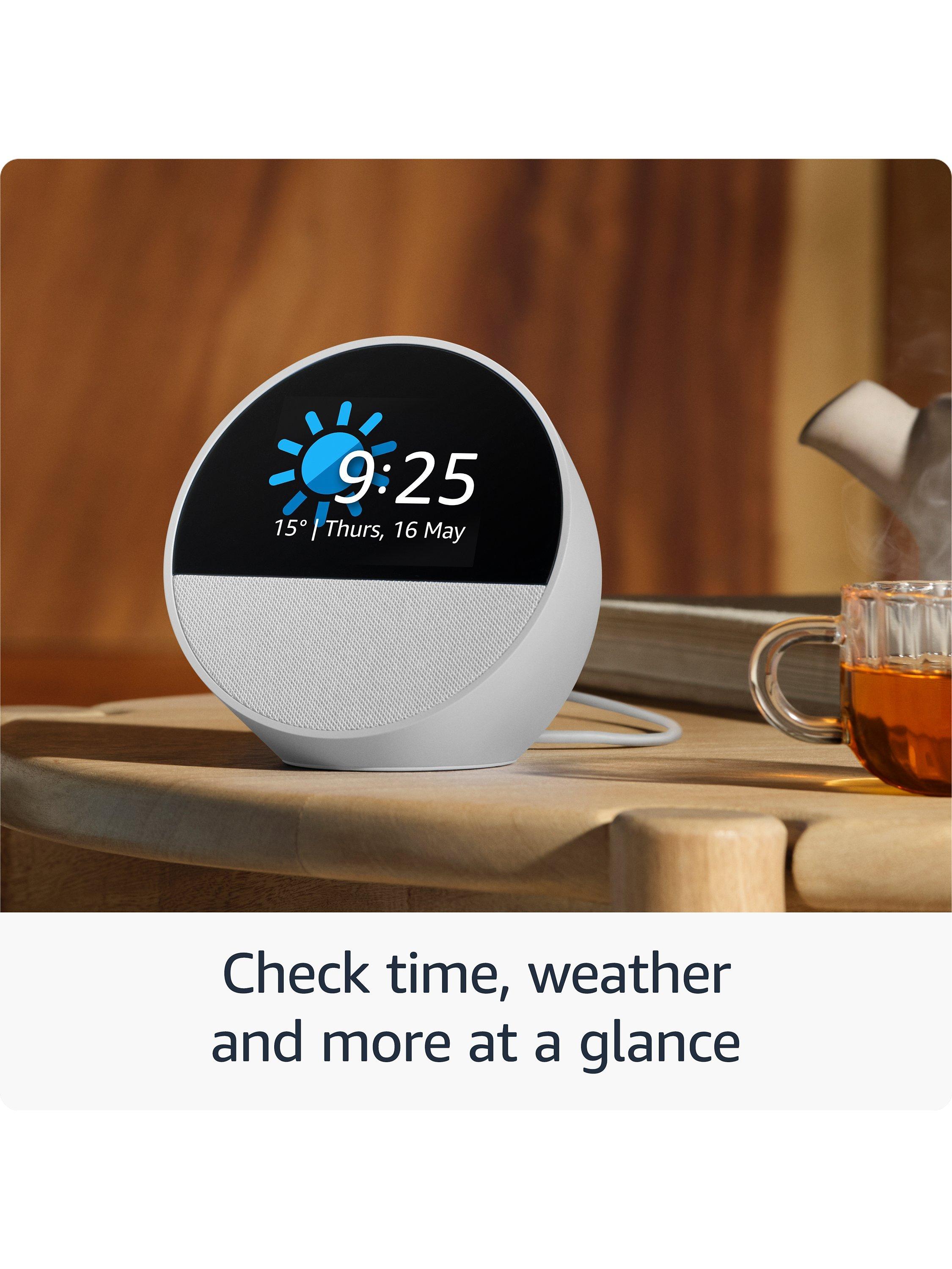 Enjoy rich sound with clear vocals and deep bass. Just ask Alexa to play music, podcasts and audiobooks from your favourite providers like Amazon music, Apple music, Spotify and more. See song titles and touch to control your music. Fill your bedroom with music or stereo pair with another Echo Spot (2024) for a wider sound experience.