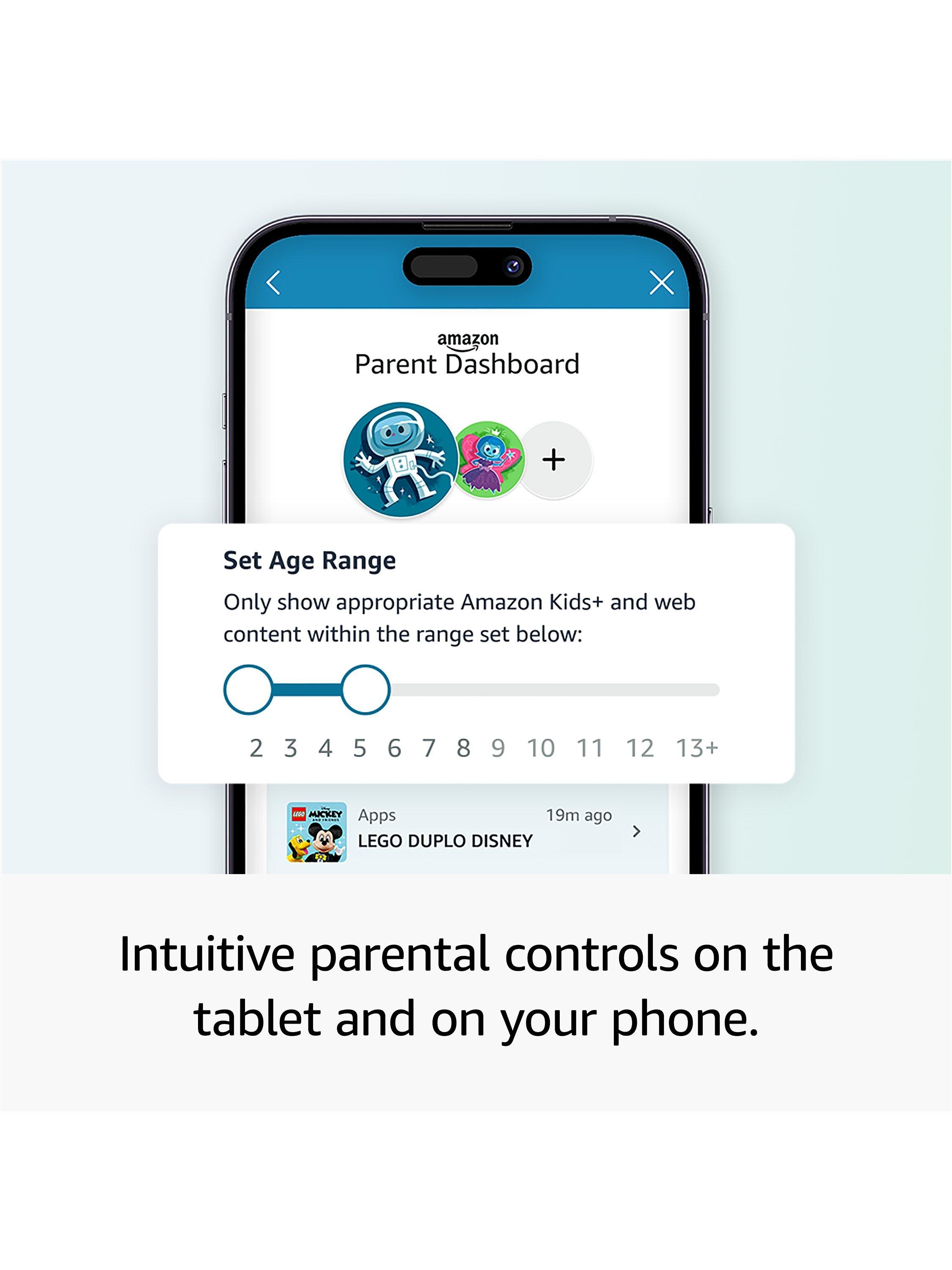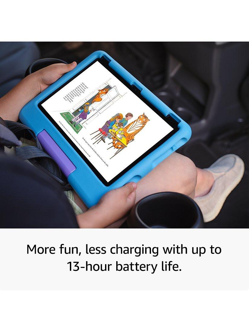 With a battery life of up to 13 hours and a durable design, Amazon Fire 10 Kids is ready to travel with you all day and survive everyday bangs or scrapes.
