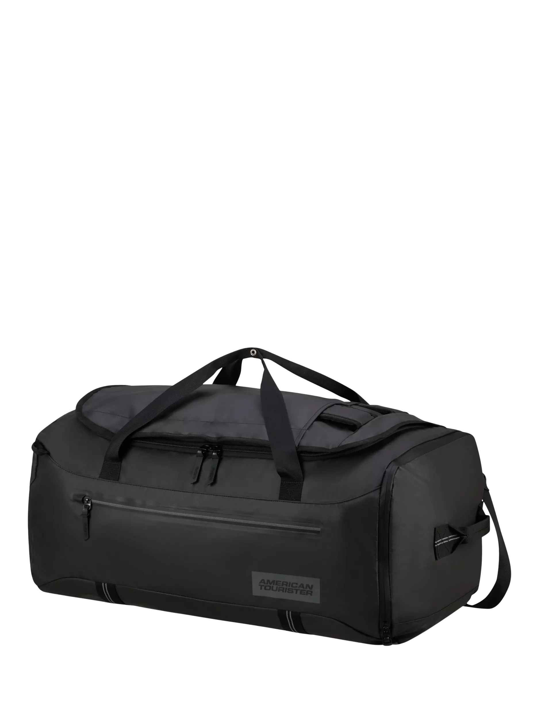 Duffle bag with inner and outer fabrics made from recycled PET bottles using American Tourister's Recyclex™ material technology.