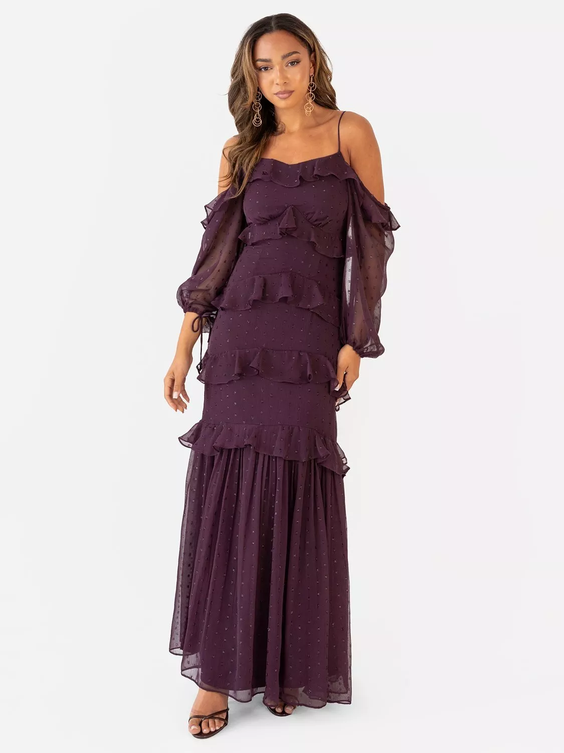 This cold-shoulder maxi dress exudes effortless femininity, featuring delicate self-tie straps and soft ruffles that frame the bust and neckline, flowing into elegant blouson sleeves. Subtle metallic threads elevate this chiffon, adding a touch of shimmer perfect for both day and evening occasions. Layered ruffles cascade down the sweeping A-line skirt, striking a perfect balance between sophistication and drama. Complete the look with silver heels and statement earrings for a truly unforgettable ensemble.