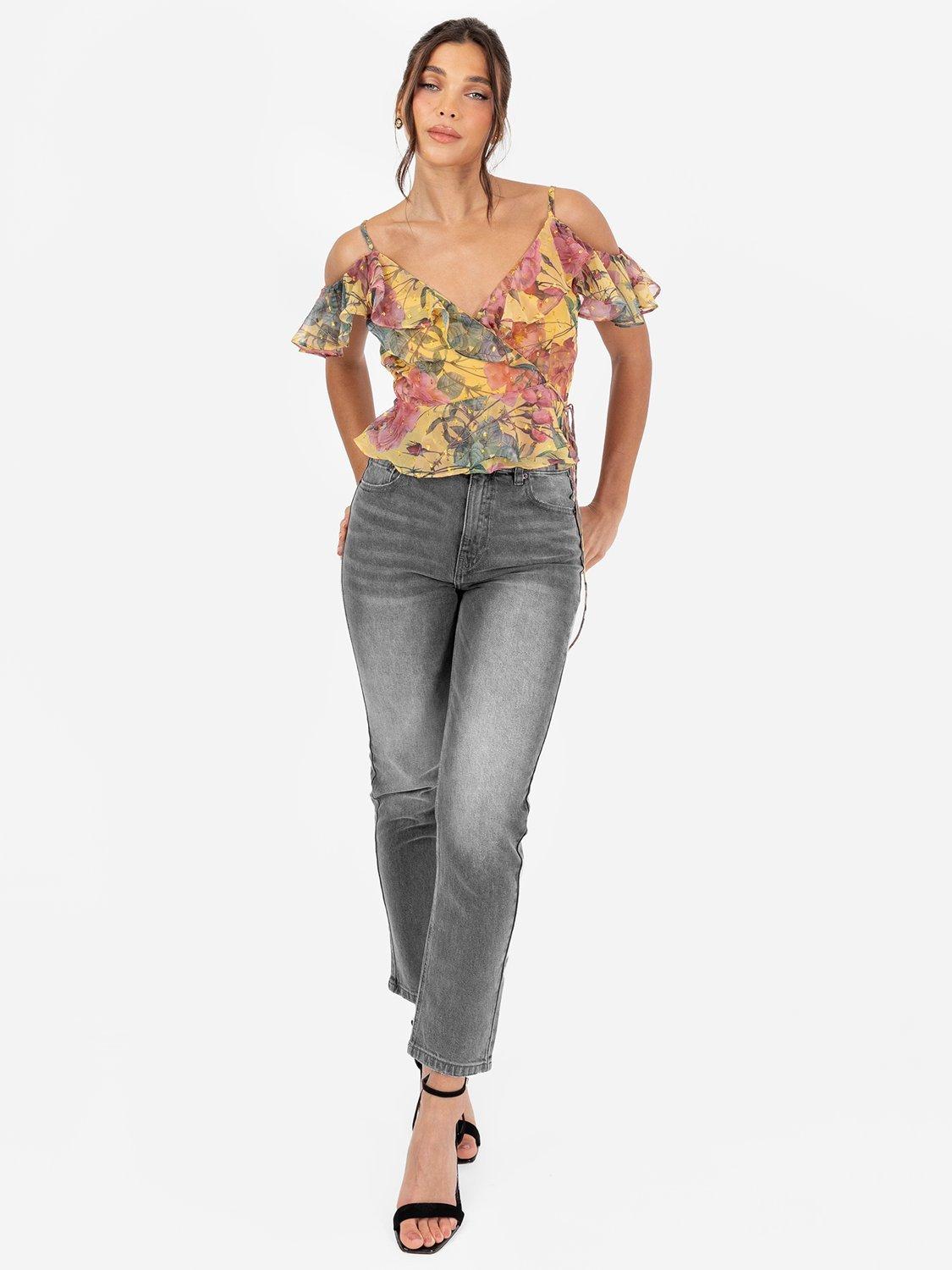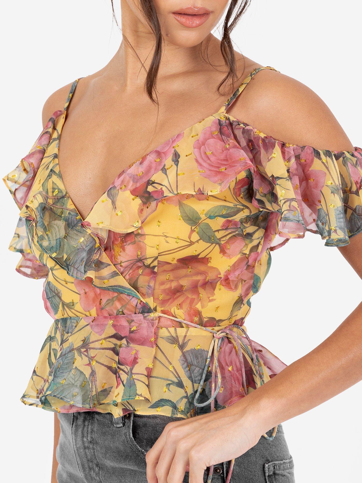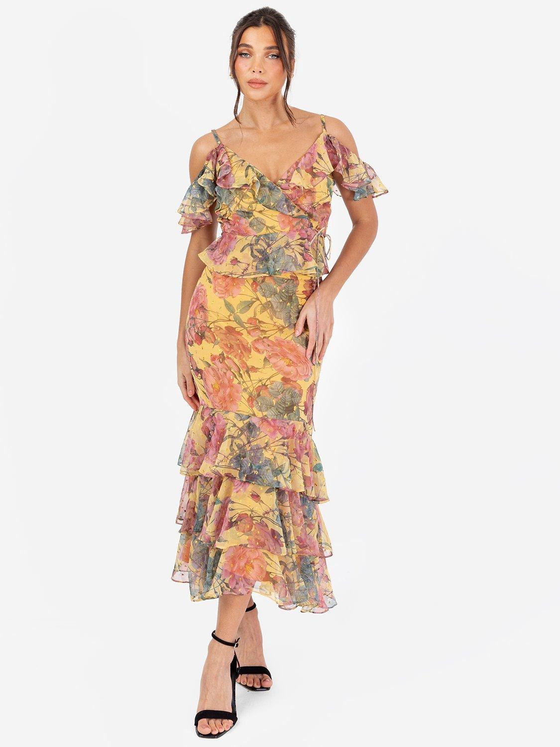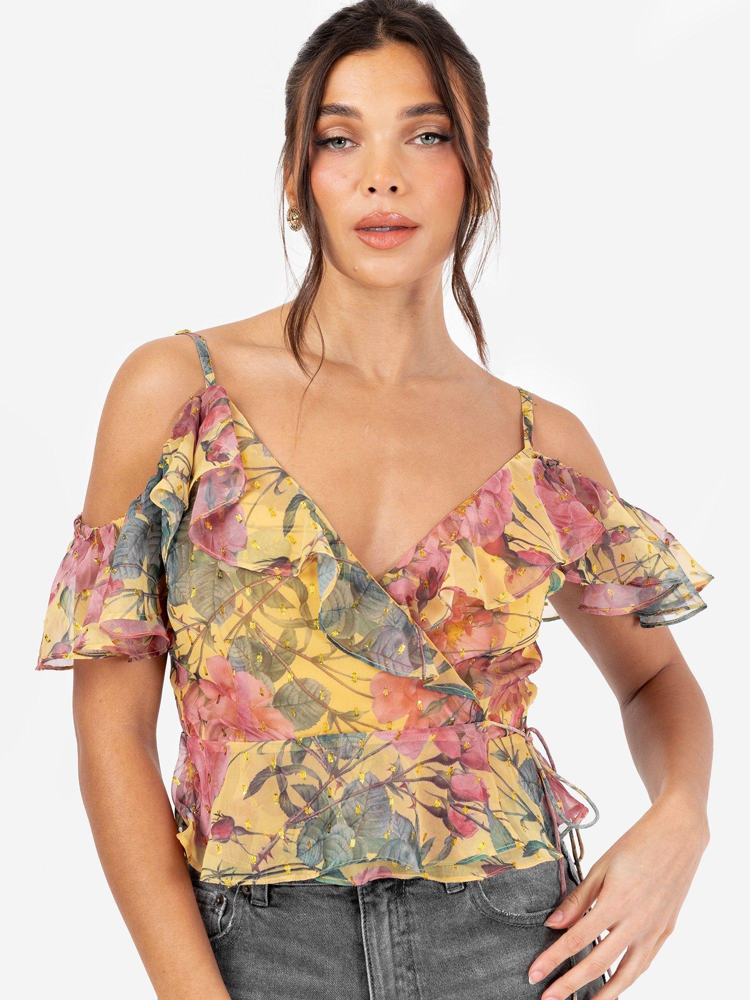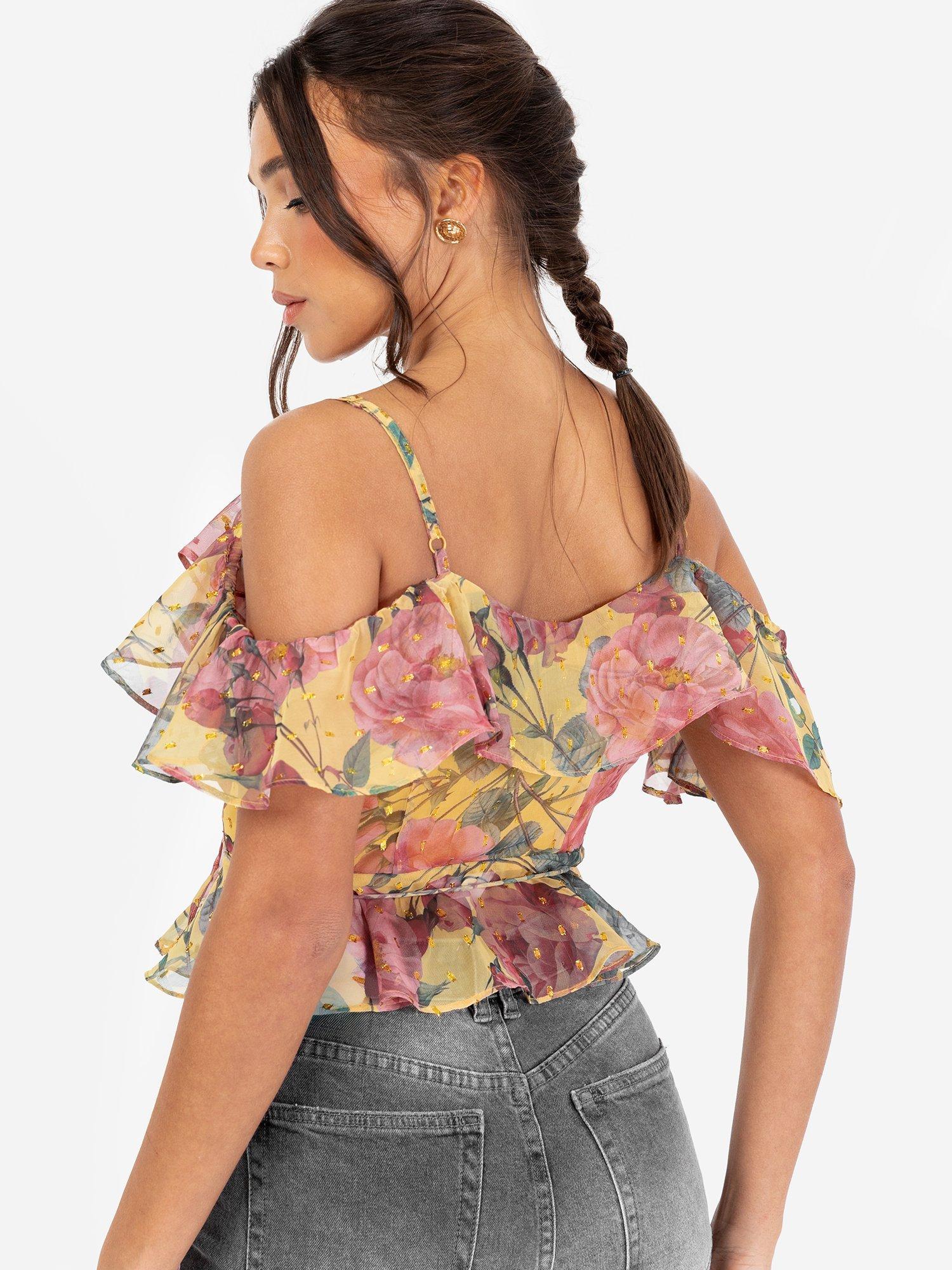 Embrace the beauty of nature and let your style bloom with this enchanting floral print ensemble. The centerpiece of this set is the functional wrap top, featuring a delicate ruffle trim that frames the V neckline, creating alluring cold-shoulder sleeves and a delicate peplum silhouette. Adjustable slender straps ensure a comfortable fit, making it as practical as it is stylish. Paired with the top is a flowing A-line midi skirt, designed with a high-low ruffled hemline creating a striking fit-and-flare silhouette that accentuates your curves in all the right places. Style this floral print co-ord set with black strappy heels and gold accessories to captivate onlookers. For a versatile twist, pair this wrap top with jeans and statement heels for the ultimate ‘nice top and jeans’ look—perfect for a stylish day out with the girls.