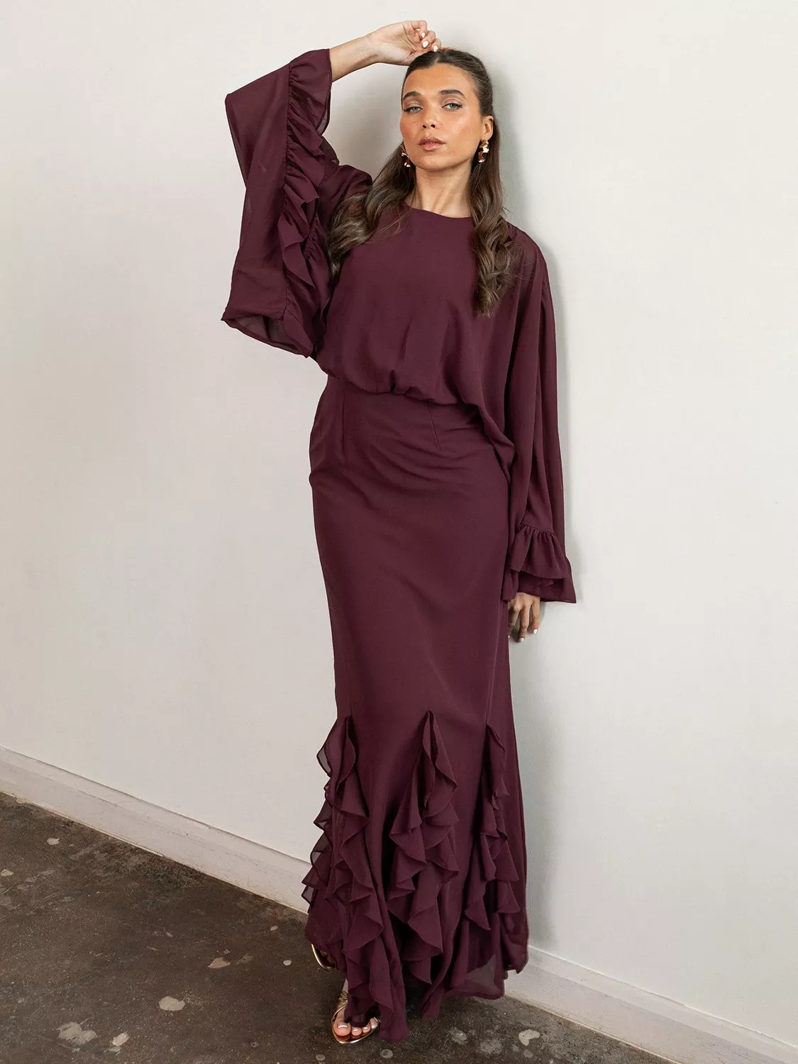 This elegant dress features oversized kimono-style sleeves with ruffled trim, a sleek round neckline, and keyhole back detail. A soft drape at the waist flatters the silhouette, while waterfall ruffles from the knee add fluidity to the simple A-line skirt.