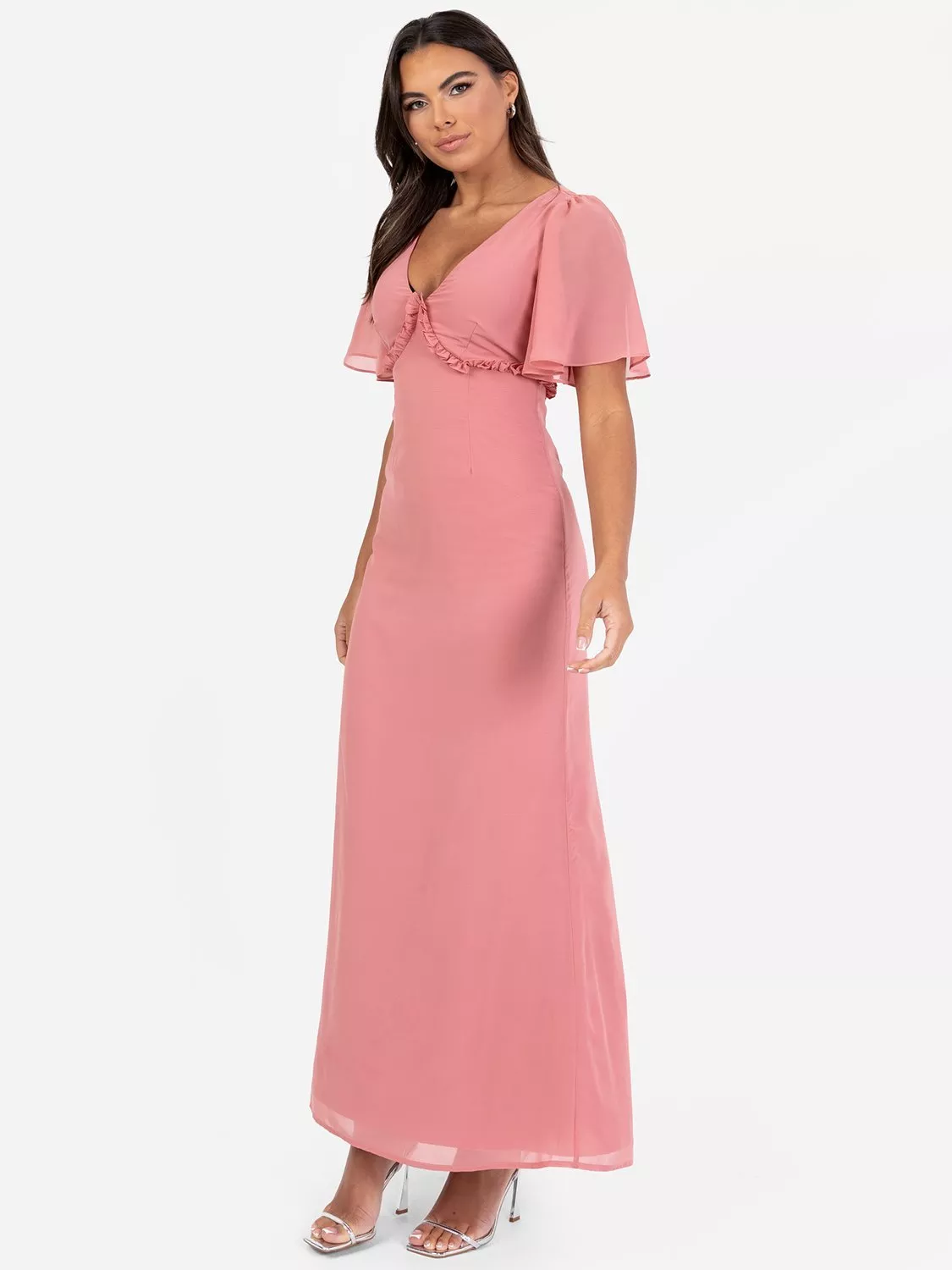 Crafted from light, breathable georgette, this bridesmaid dress exudes elegance and comfort, perfect for any wedding day. The dress features a soft, flowy silhouette with a flattering V-neckline and short sleeves that enhance its timeless appeal. At the empire waist, a charming frill highlights the waistline and creates a graceful transition to the A-line maxi skirt. To the reverse a keyhole detail framed by self-tie ribbons add a hint of allure, an invisible zip ensures a seamless fit. Pair this gown with statement jewellery and an elegant updo for a look that's as magical as the day itself.