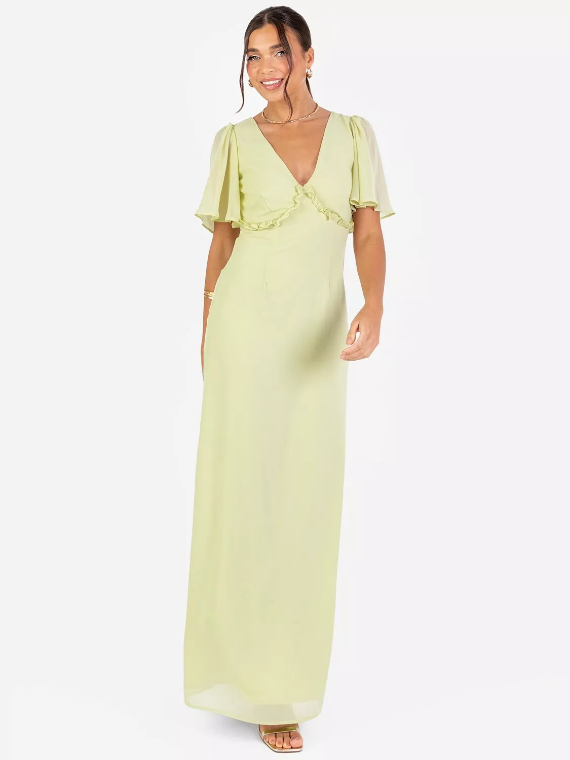 Crafted from light, breathable georgette, this bridesmaid dress exudes elegance and comfort, perfect for any wedding day. The dress features a soft, flowy silhouette with a flattering V-neckline and short sleeves that enhance its timeless appeal. At the empire waist, a charming frill highlights the waistline and creates a graceful transition to the A-line maxi skirt. To the reverse a keyhole detail framed by self-tie ribbons add a hint of allure, an invisible zip ensures a seamless fit. Pair this gown with statement jewellery and an elegant updo for a look that's as magical as the day itself.