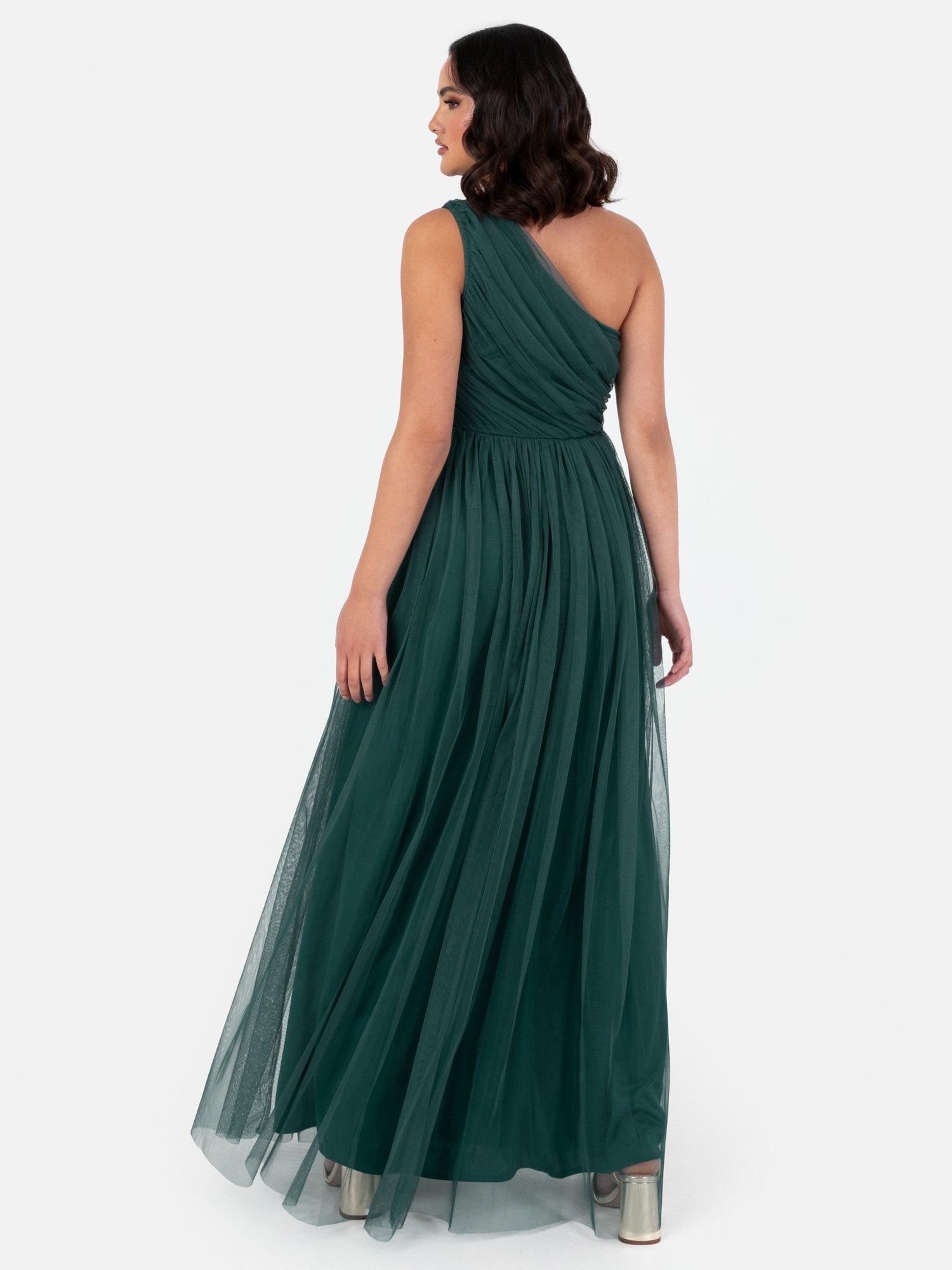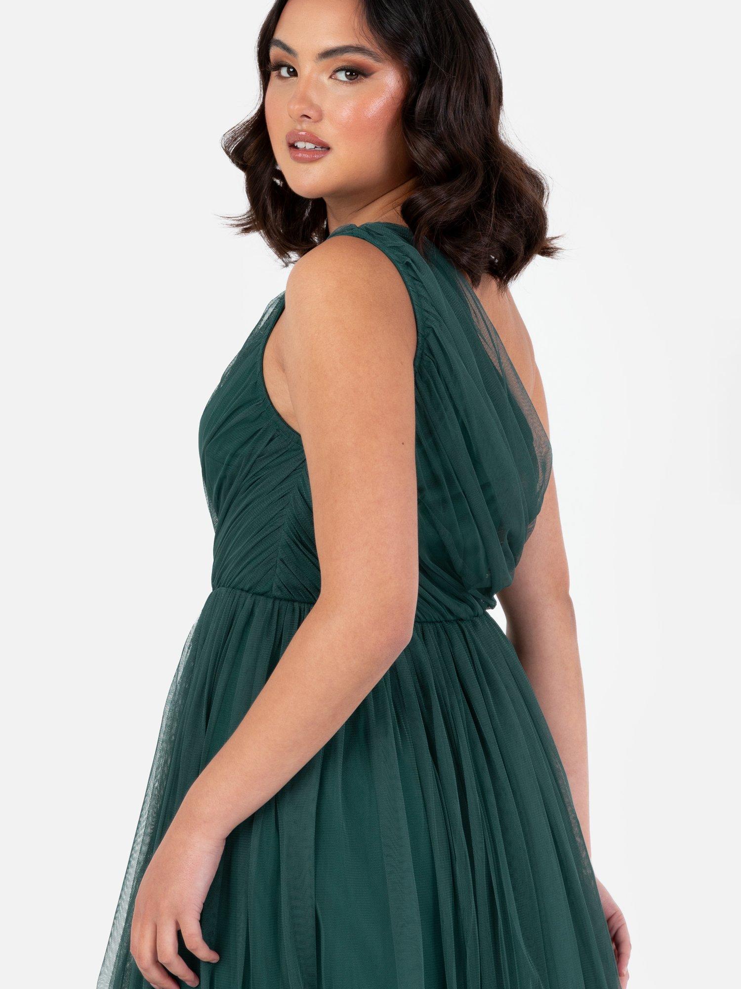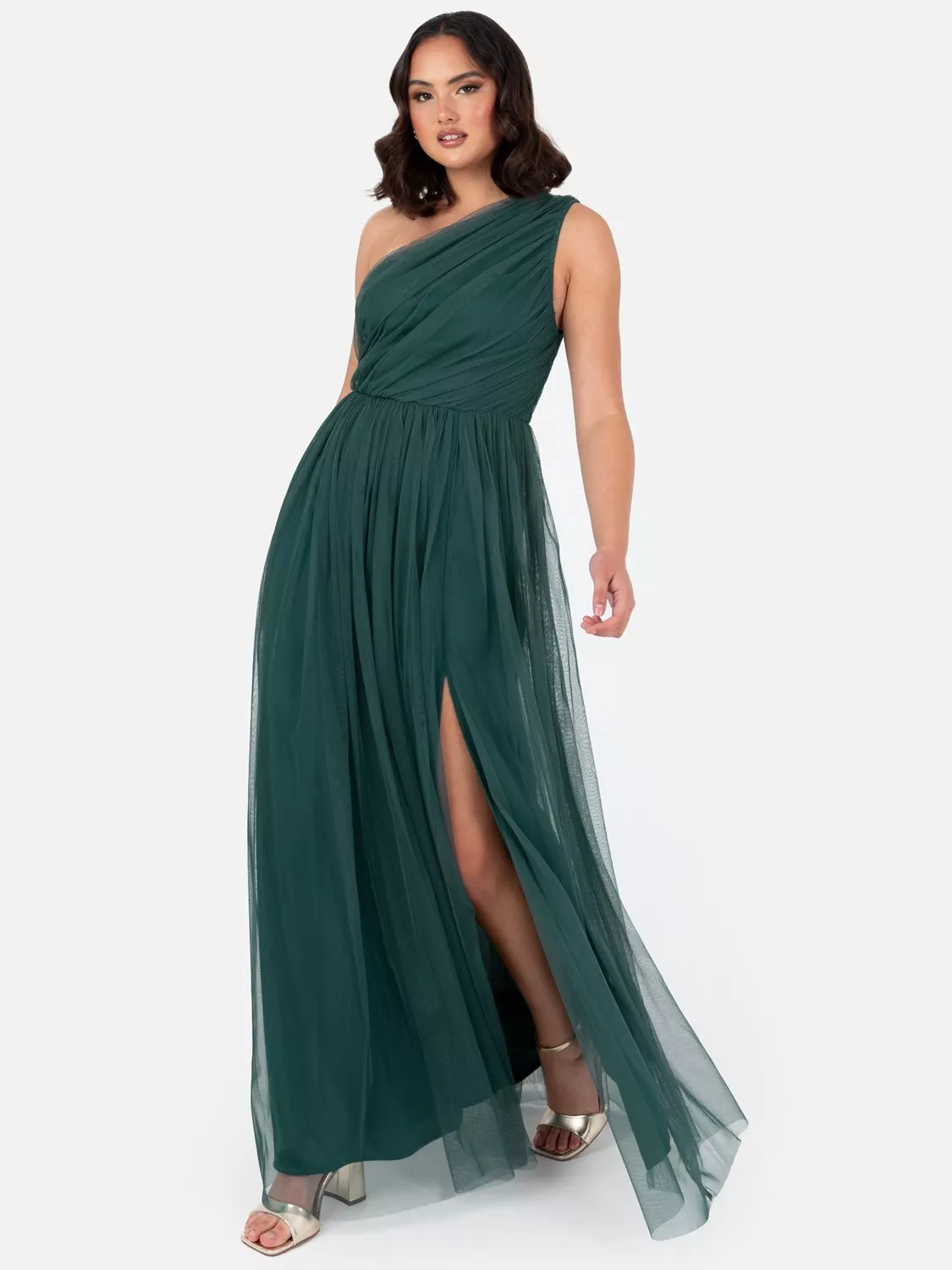 This one shoulder maxi is a style perfect for bridesmaids or chilled summer events. Recycled tulle gathered at the shoulder flows into a body-hugging bodice and flairs into a flowy A-line silhouette with a thigh high skirt split. This dress is body lined for a comfortable wear and a hidden zip located to the side of the dress allows for the seamless design all around.