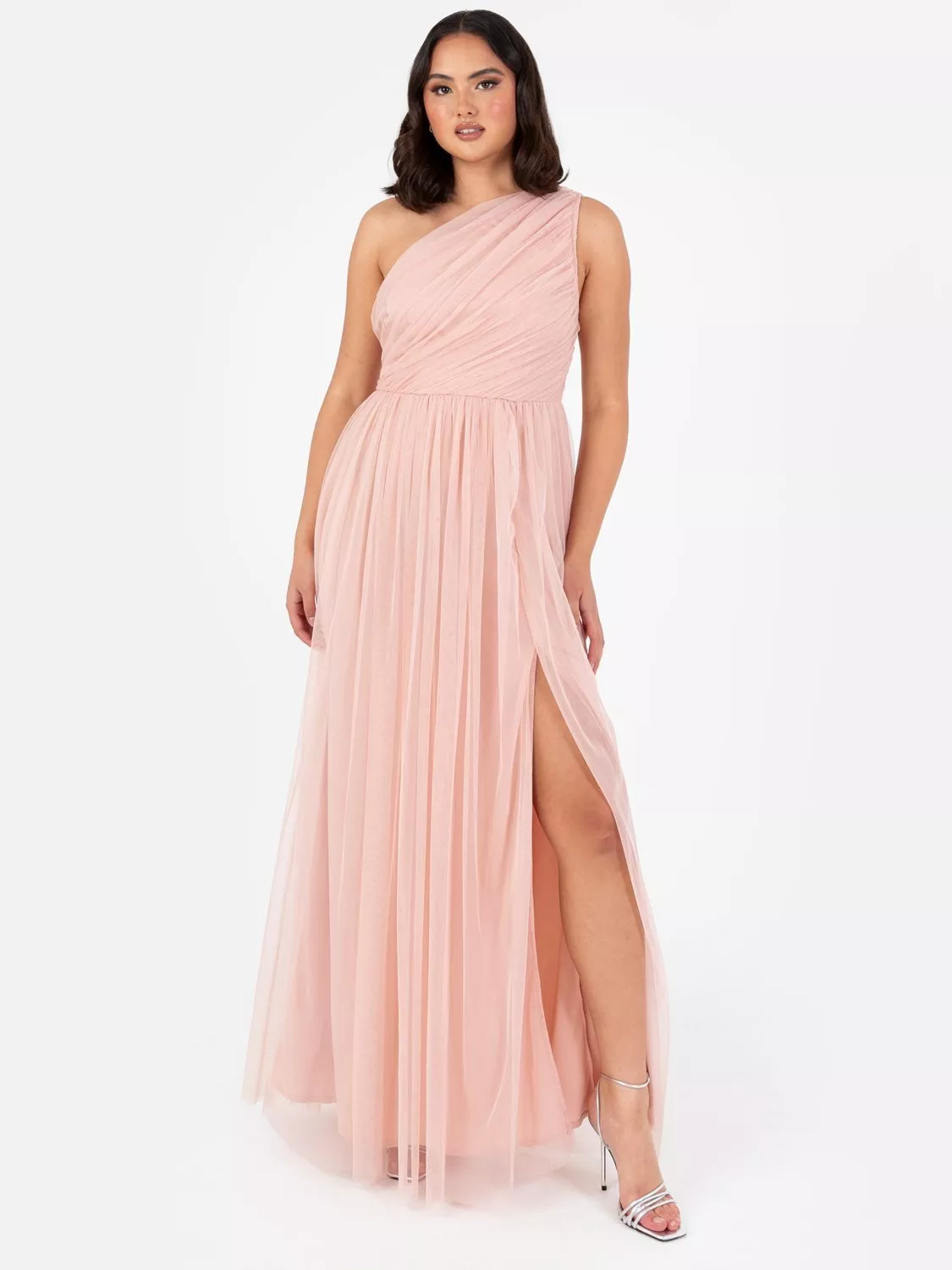 This one shoulder maxi is a style perfect for bridesmaids or chilled summer events. Recycled tulle gathered at the shoulder flows into a body-hugging bodice and flairs into a flowy A-line silhouette with a thigh high skirt split. This dress is body lined for a comfortable wear and a hidden zip located to the side of the dress allows for the seamless design all around.