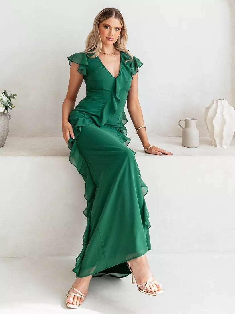 Radiating romance and refinement, this stunning gown epitomises contemporary elegance. It features a flutter sleeve bodice complemented by a timeless V-neckline. A cascading ruffle layer traces the neckline and flows diagonally to the hip, while another ruffle descends from the waist, flowing across the skirt, enhancing the silhouette with captivating allure. Complete your ensemble with silver heels and accessories for an effortless look.
