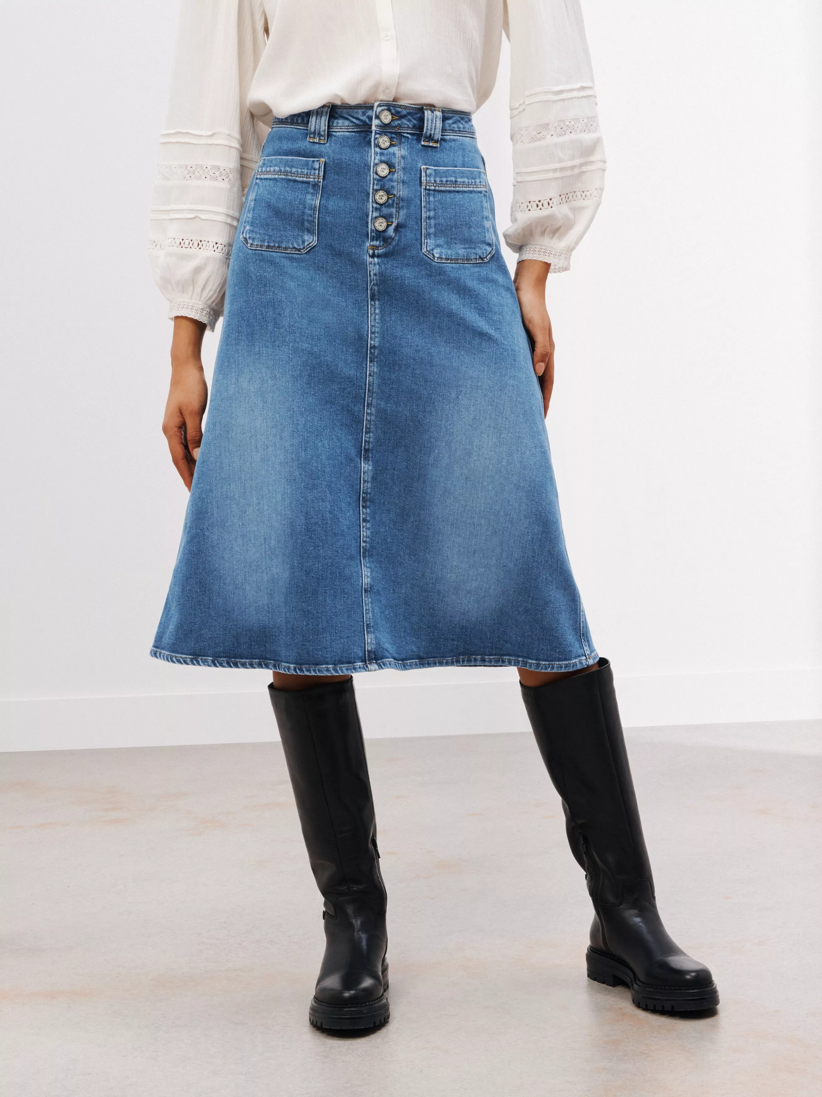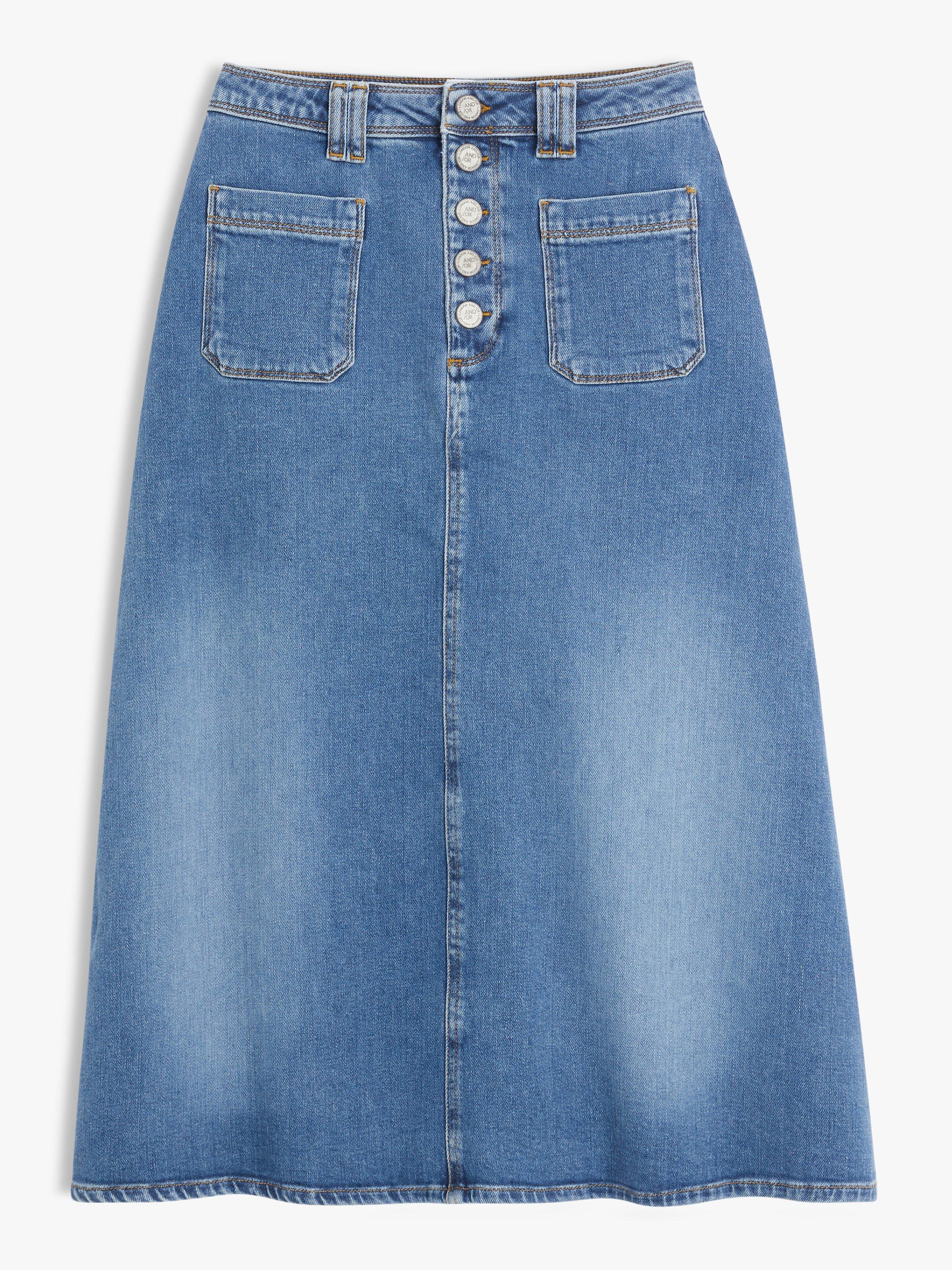 A retro-inspired staple for off-duty days, this cotton-rich denim skirt comes in a fuss-free a-line shape with handy patch pockets and eye-catching button fastening with AND/OR logo detailing.
