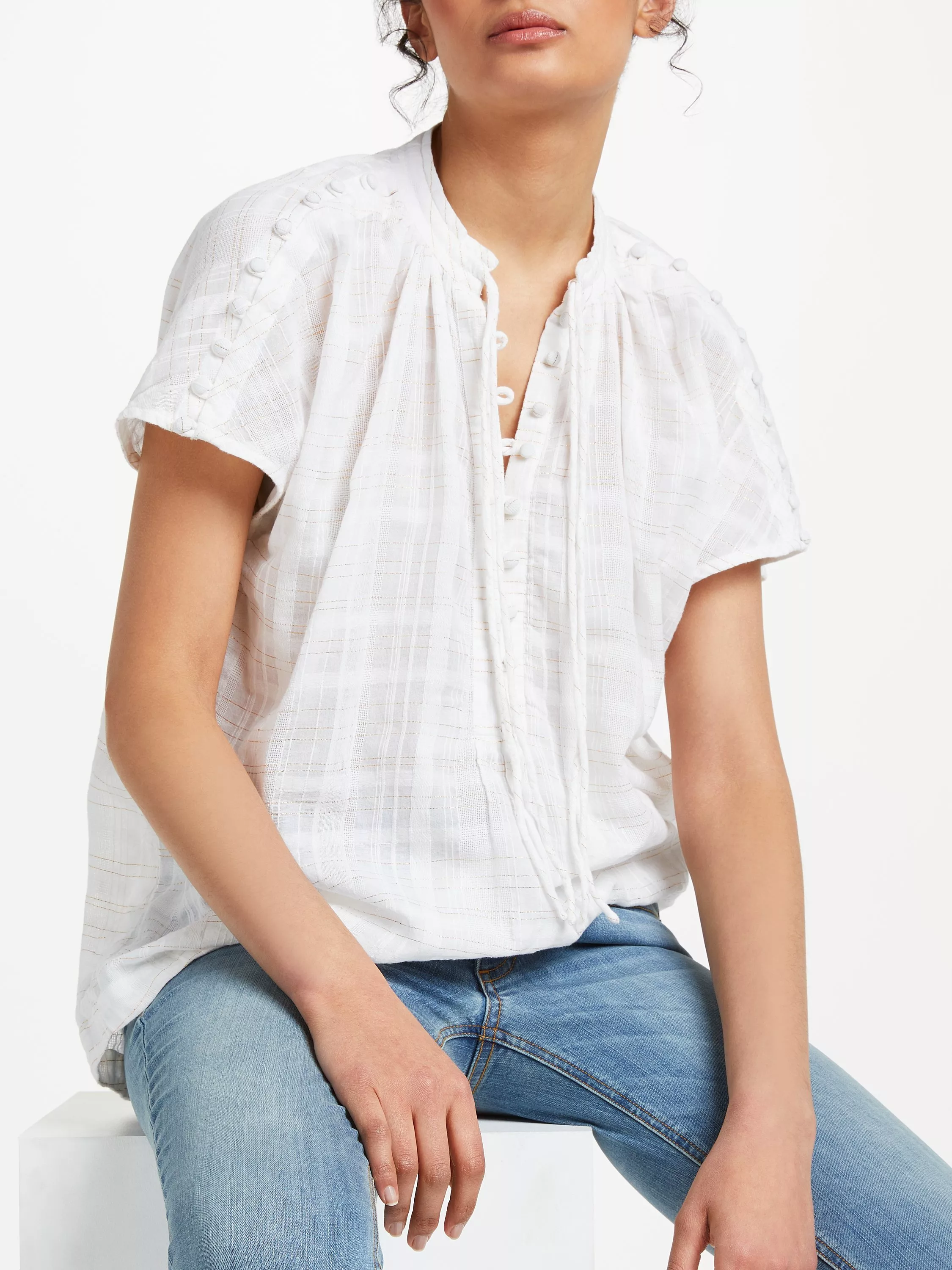 Crafted from a rich cotton fabric, this piece features a chic button up front with matching buttons on the sleeves, a loose shape through the body and short sleeves. A shimmering metallic check pattern runs throughout for a stand out finish.