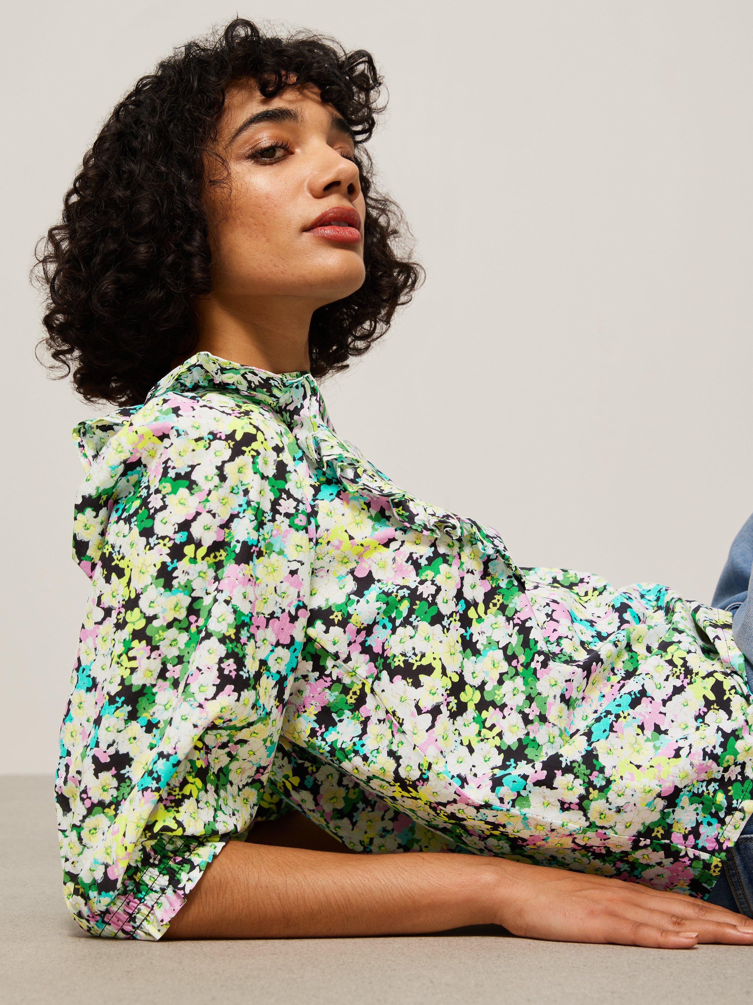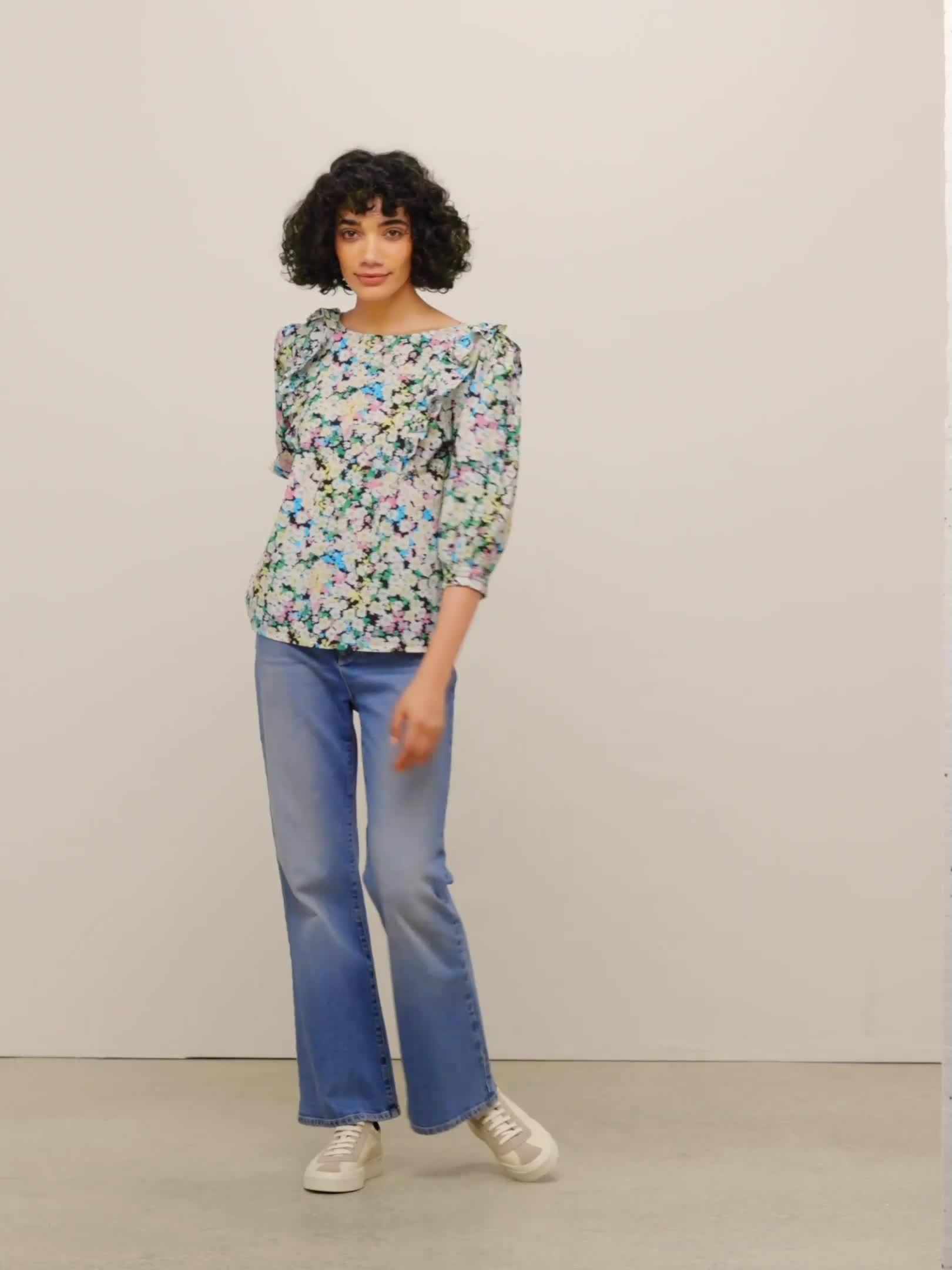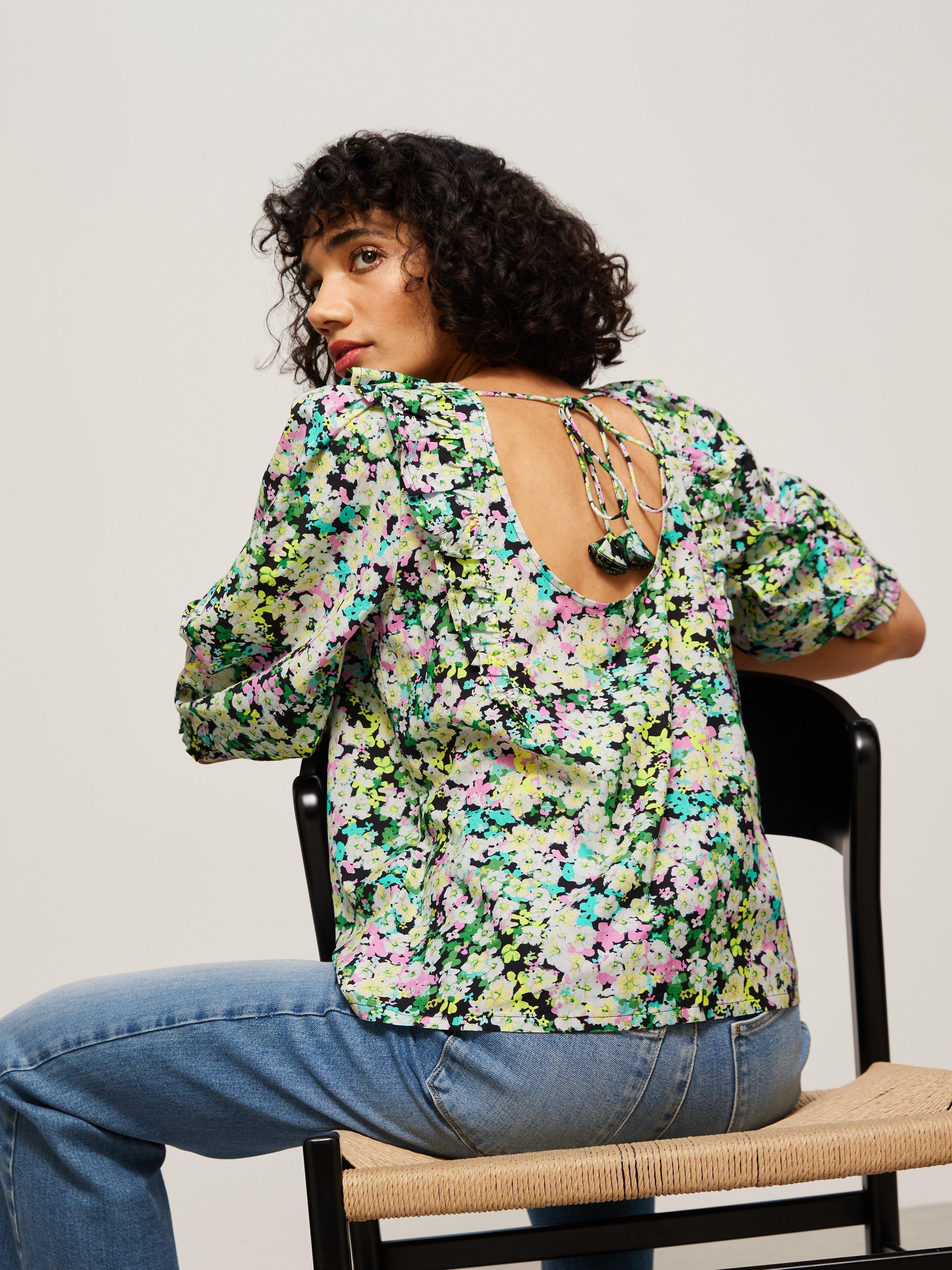 With a timeless, can't go wrong floral running throughout, this lightweight blouse features an unusual, reverse v-neckline at the back with adjustable tie for versatile styling. With on-trend ruffle detailing on the front, it's a top you can style with denim and your favourite tailored pieces alike.
