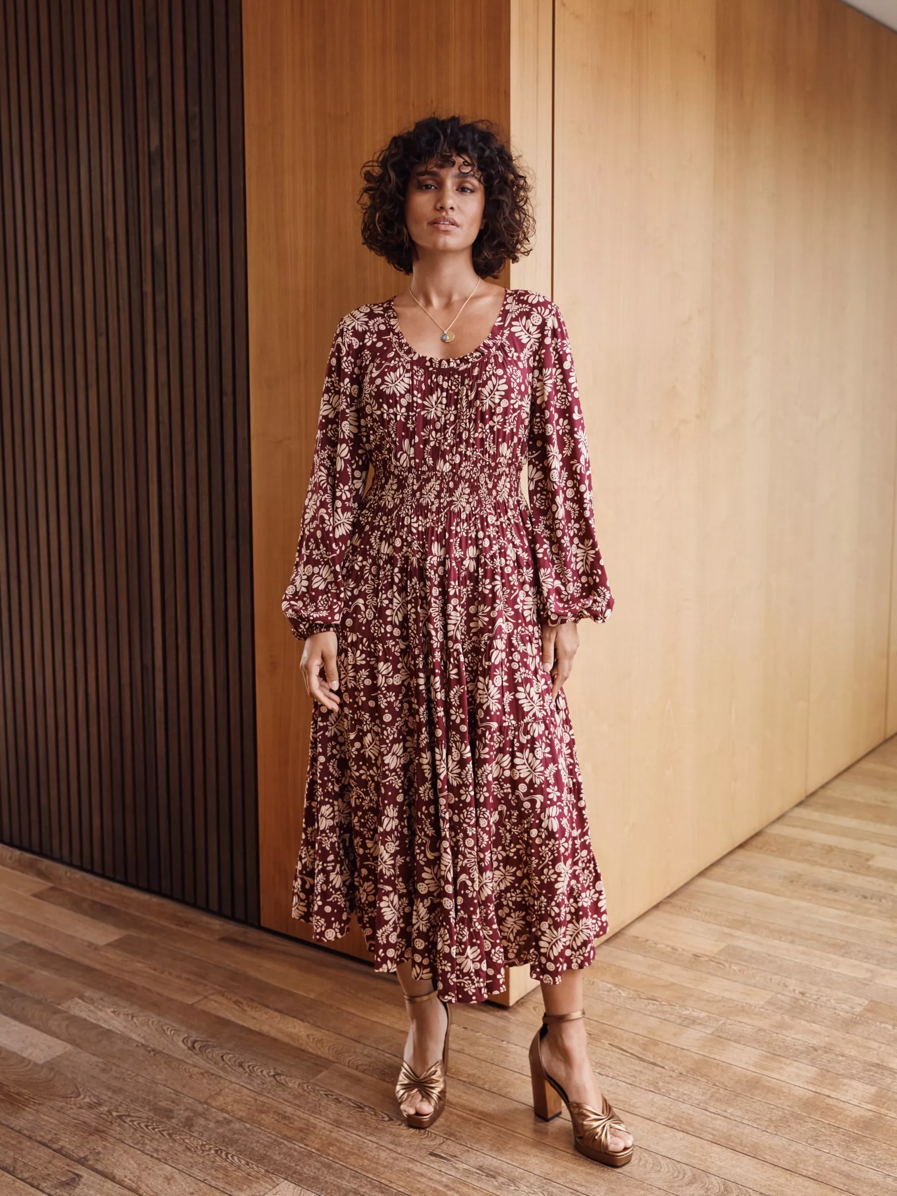 Adorned in a beautifully intricate pattern that swirls and flows throughout, this dress features elasticated smocking at the waistband for a comfortable fit. The balloon sleeves add drama whilst the ruffle hem adds a playful twist.