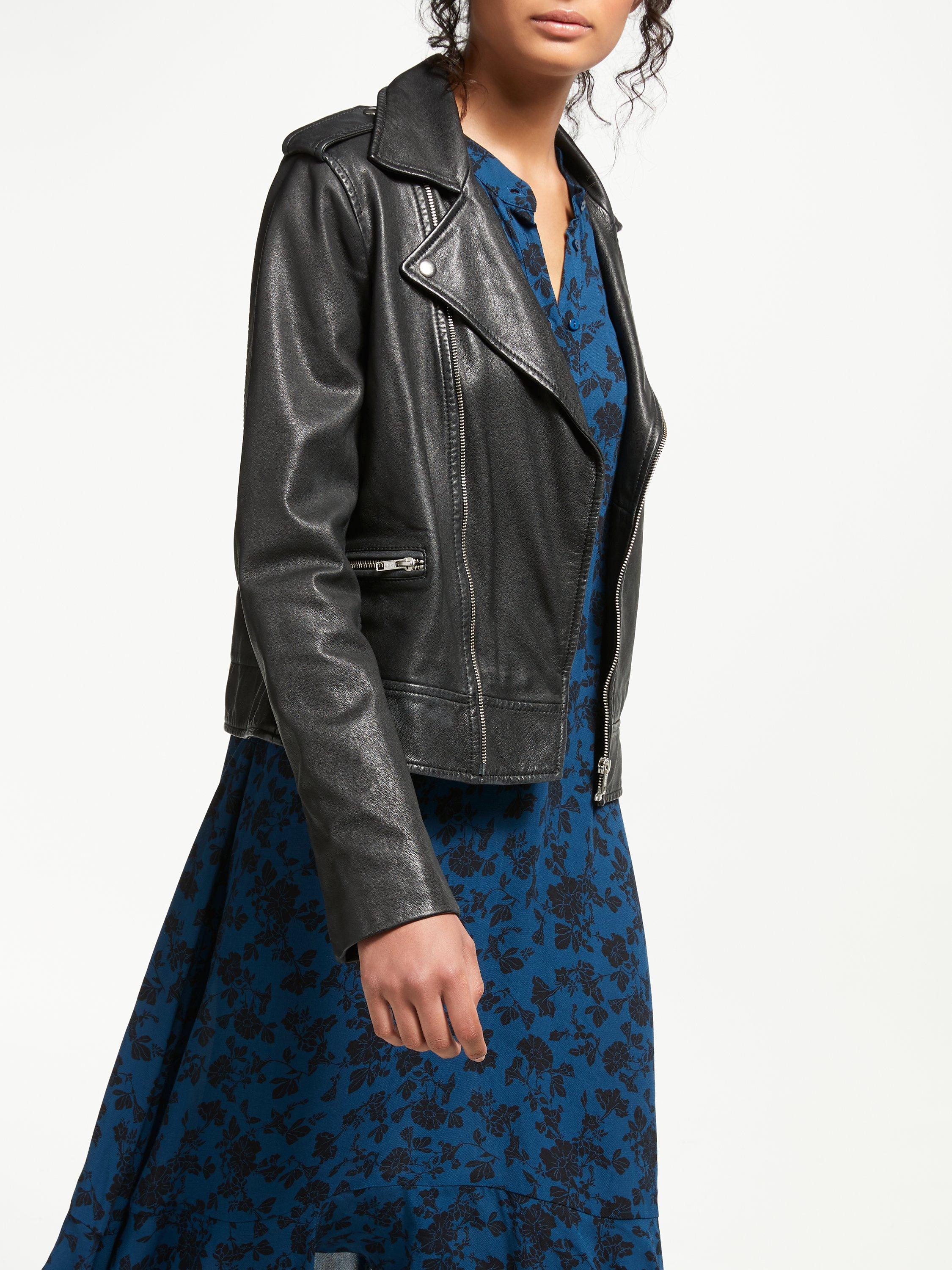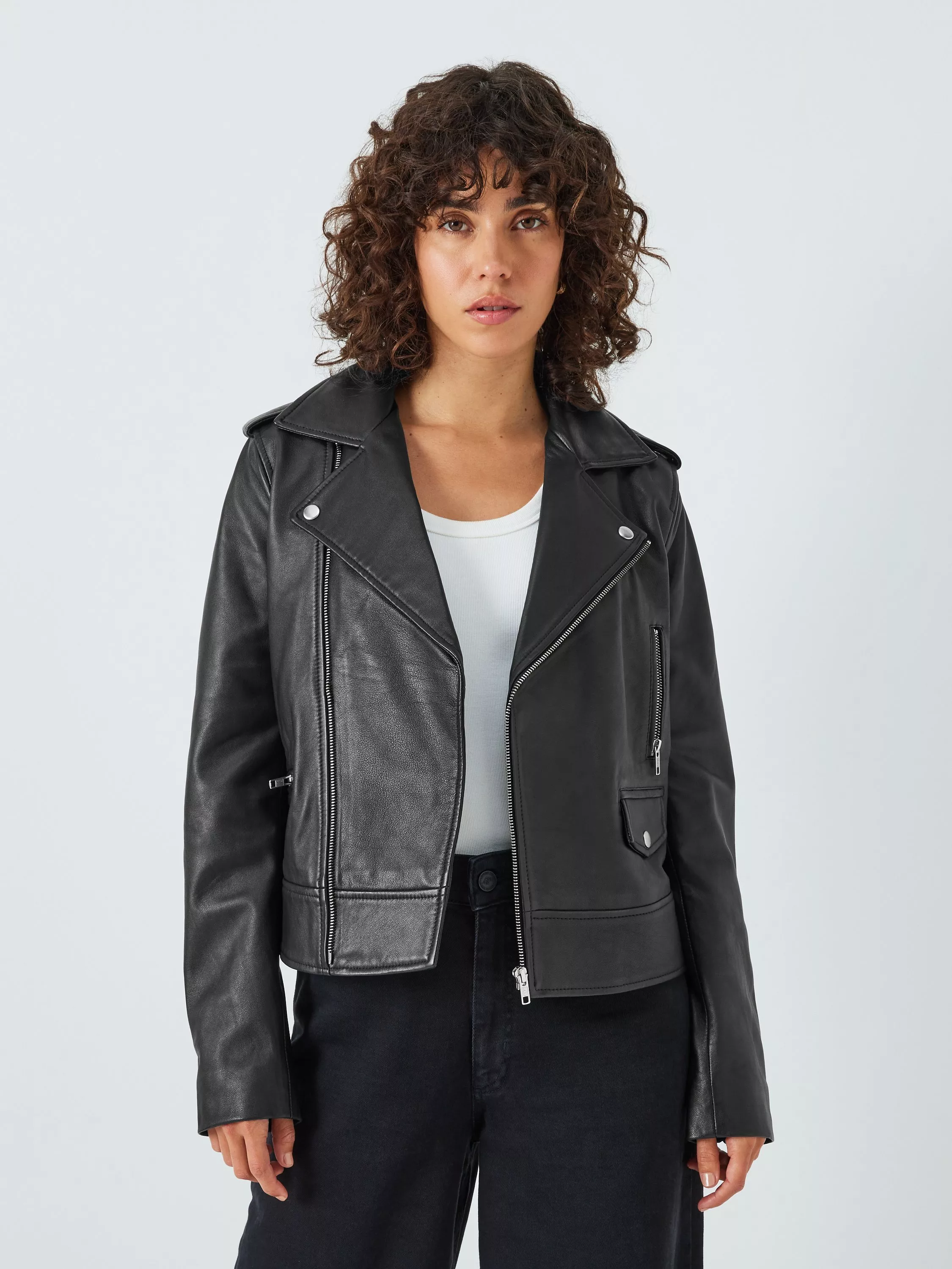 Made from beautifully soft leather with a lovely drape, this collarless jacket features an asymmetric front zip, popper fastenings at the neat neckline and full-length sleeves.