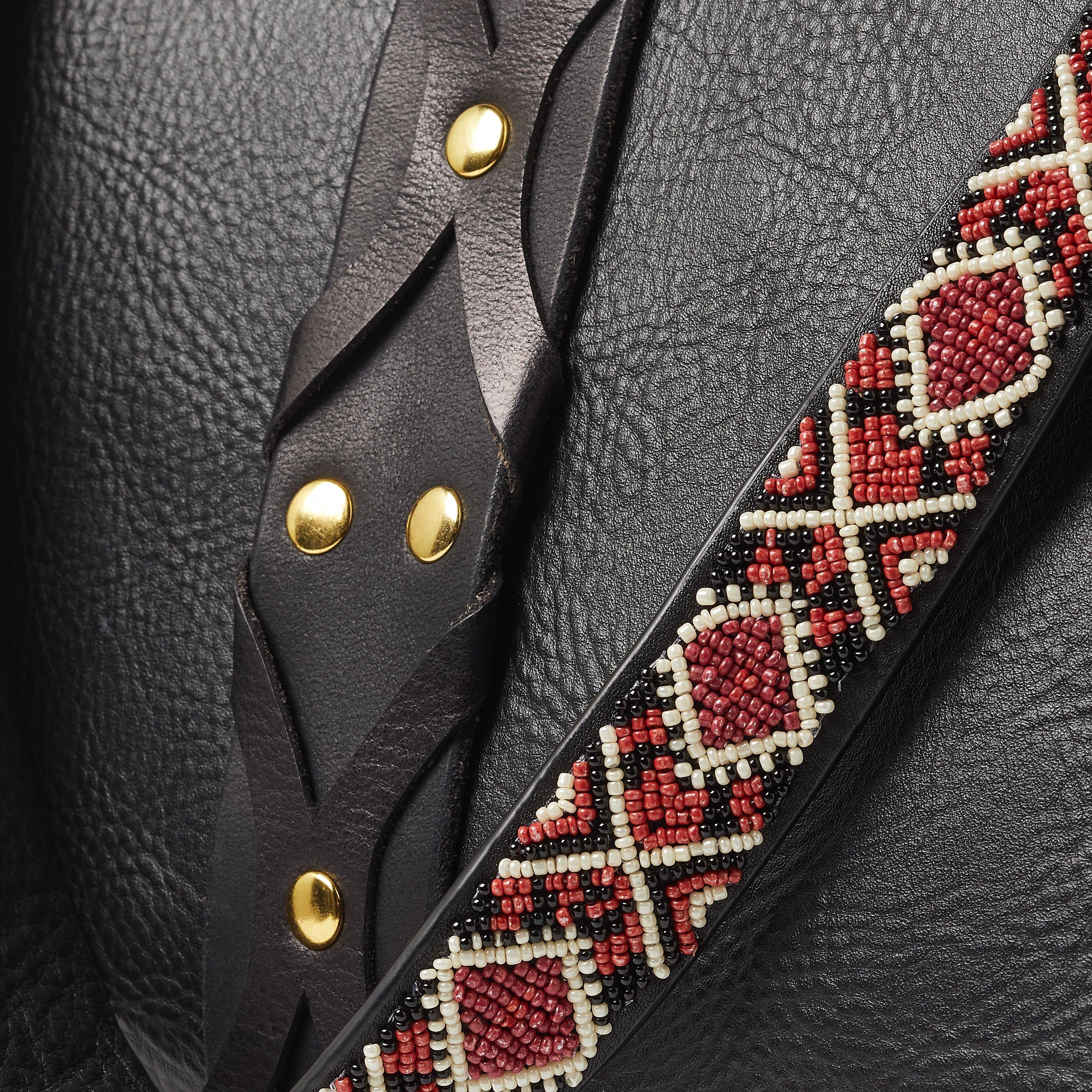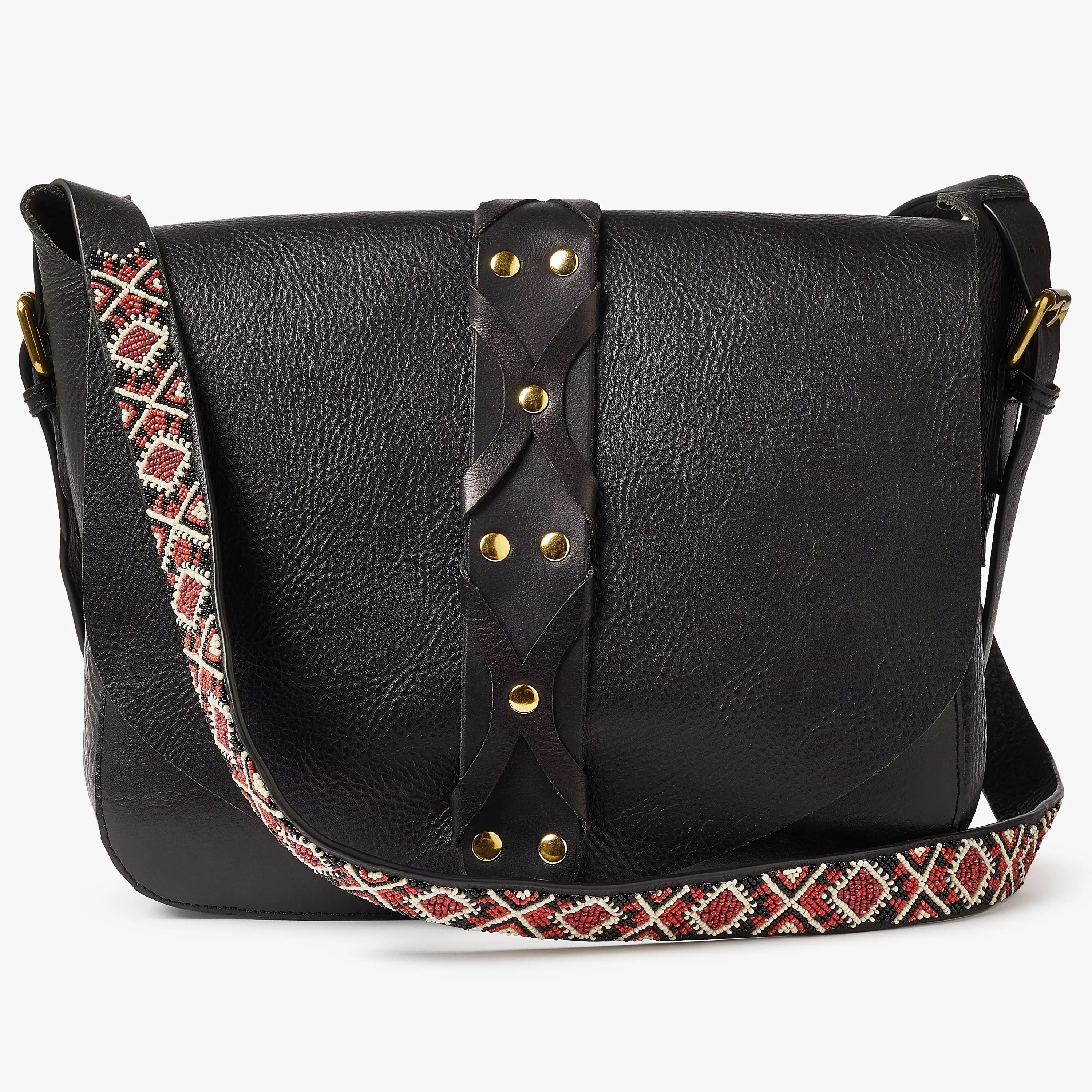 A classic flap over design, it is accentuated by a studded leather strap and a long beaded across body strap that imitates classic guitar designs for a "rock ad roll" feel. The unlined interior further adds to the effect and features an interior zipped pocket as well as slip compartments and is closed with a magnetic dot fastening to help keep your valuables secure and organised.