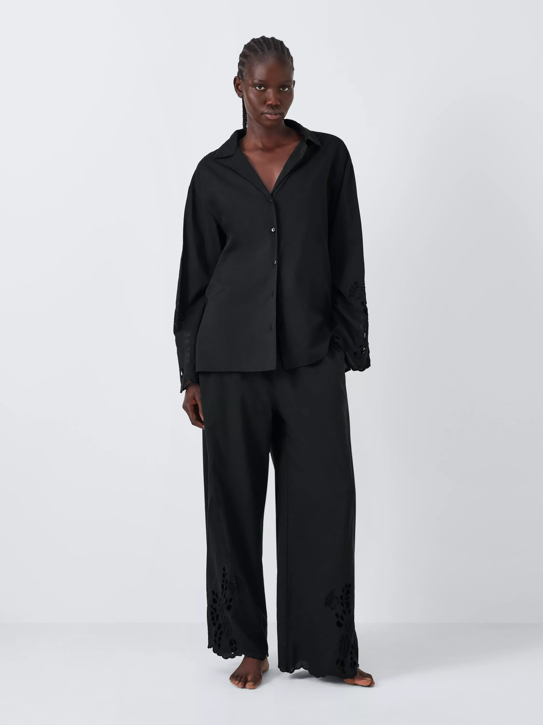 Cosy up in this comfy pyjama set. Made from a soft cotton-modal blend, the shirt and bottoms showcase stylish broderie detailing.