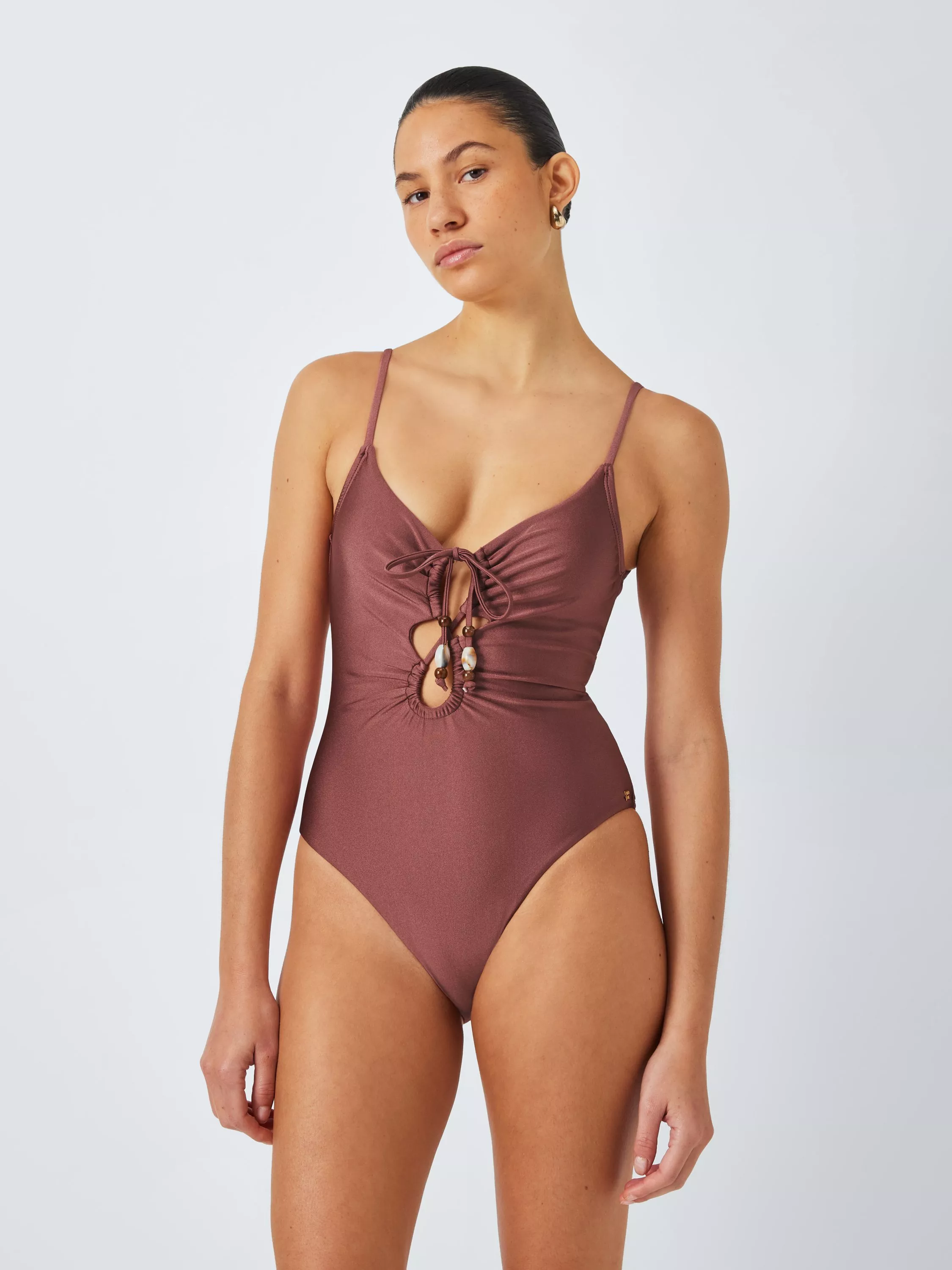 With a hint of shine in the fabric, Monaco is a swimsuit with a cut-out detail centre-front that can be adjusted by drawstrings. The strings are finished with beads that add a touch of the traveller.