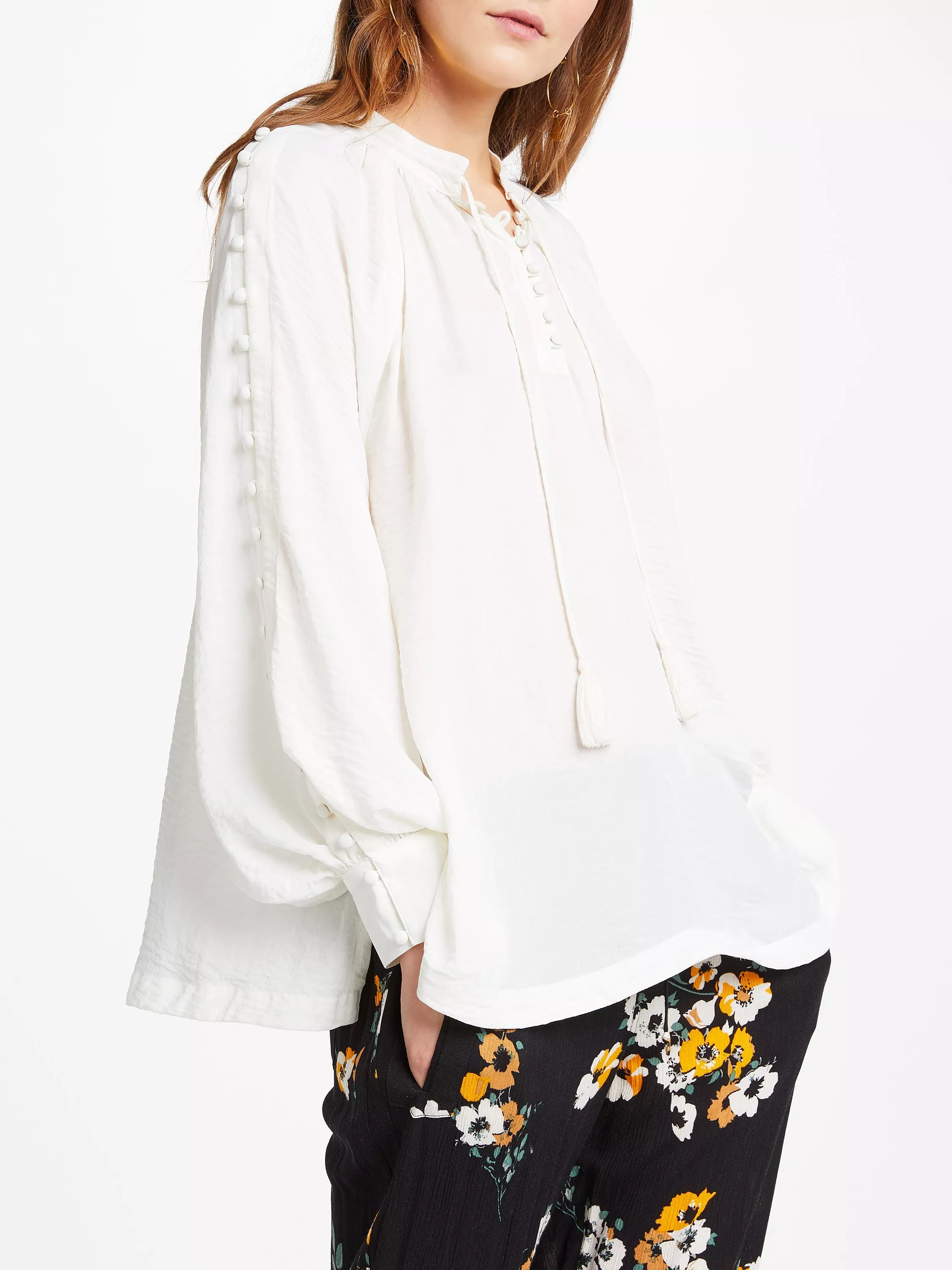 Crafted from a soft and lightweight fabric, this piece features an open V neckline, whimsical drawstring neck ties with a tassel finish and a loose shape through the body. Pretty covered buttons adorn the neck and sleeves, and the piece is finished with slits at the hem for an easy fit.